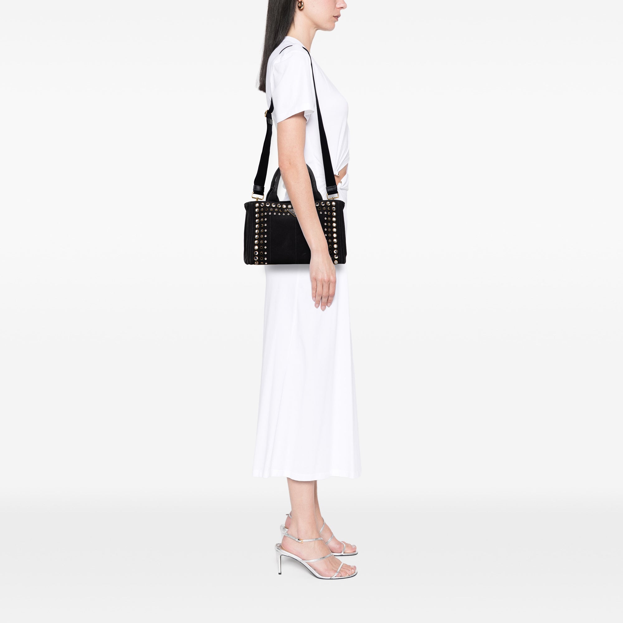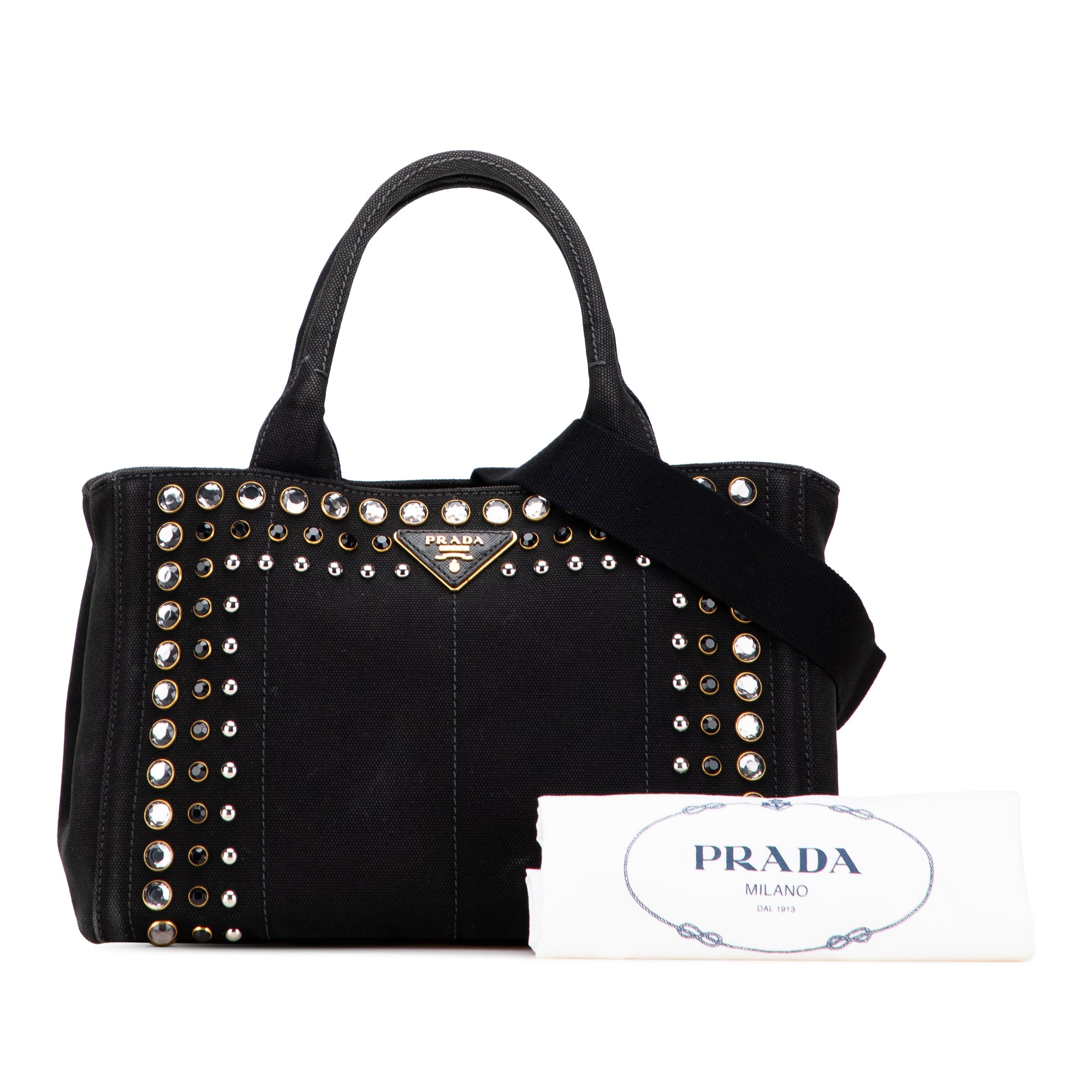 This satchel features a studded canvas body, rolled top handles, a detachable and adjustable flat shoulder strap, an open top, and interior zip and slip pockets. Inclusion: Dust bag. Retail Price: 990.00