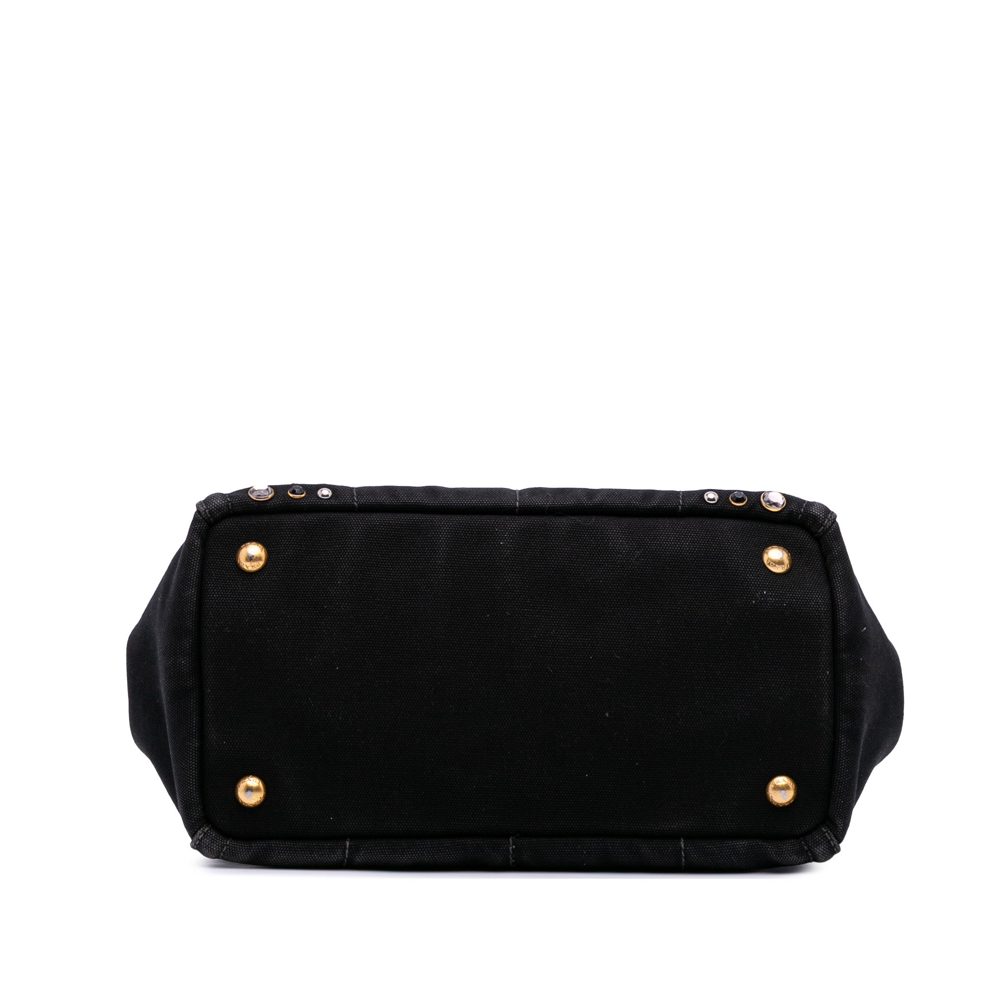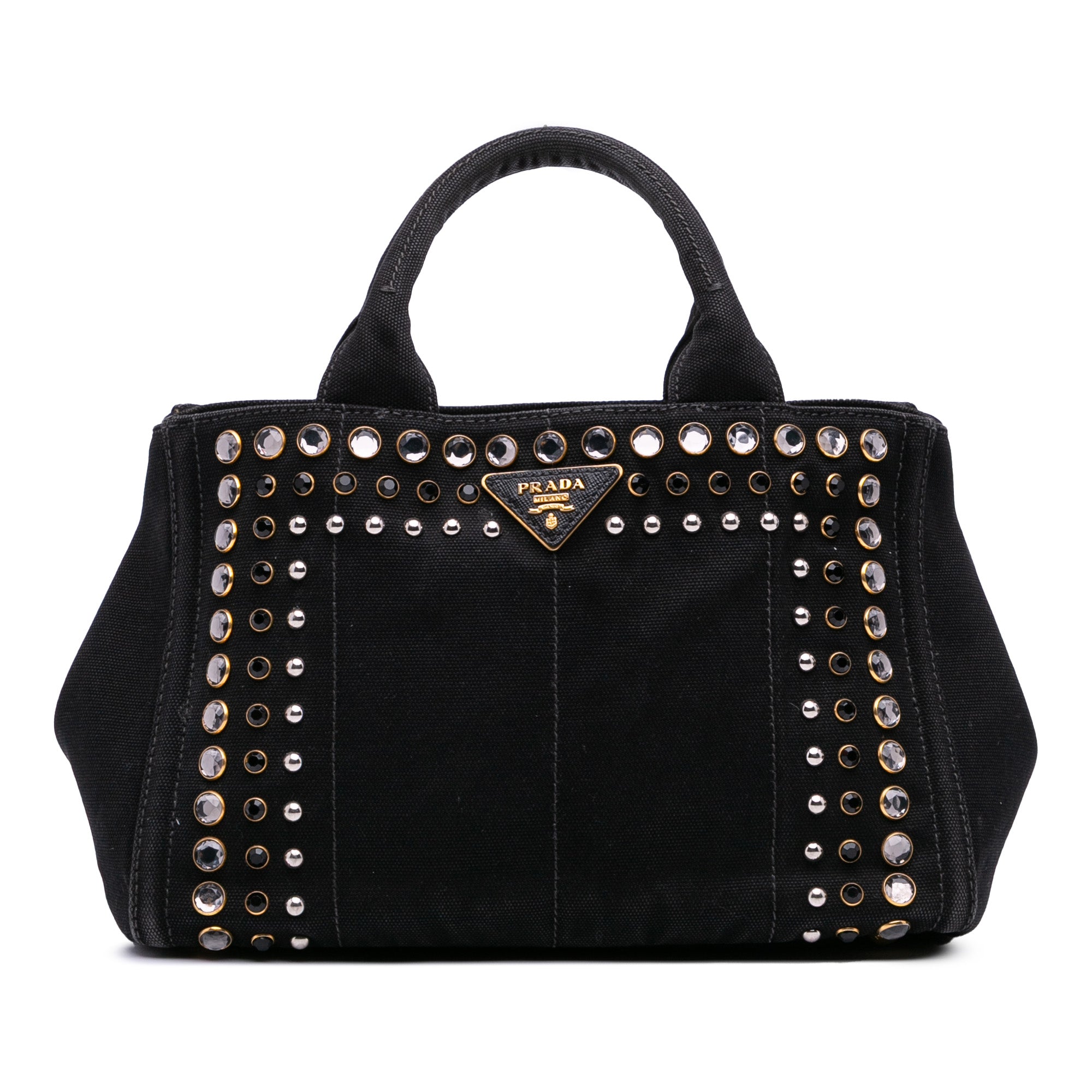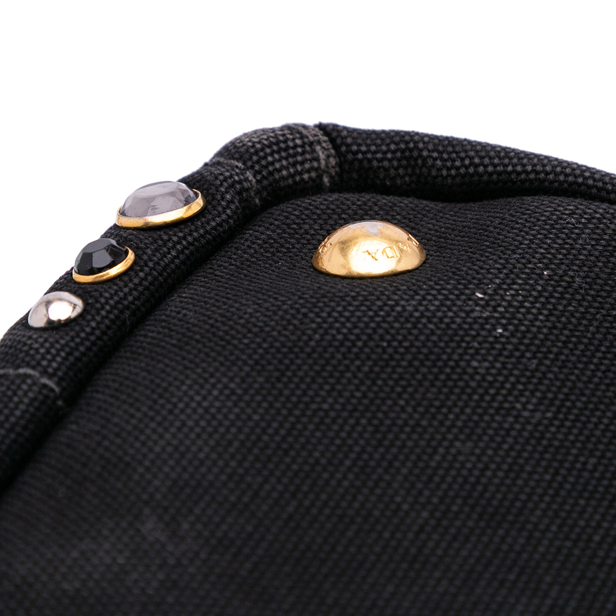This satchel features a studded canvas body, rolled top handles, an open top with side snap closures, and interior zip and slip pockets. Retail Price: 1390.00