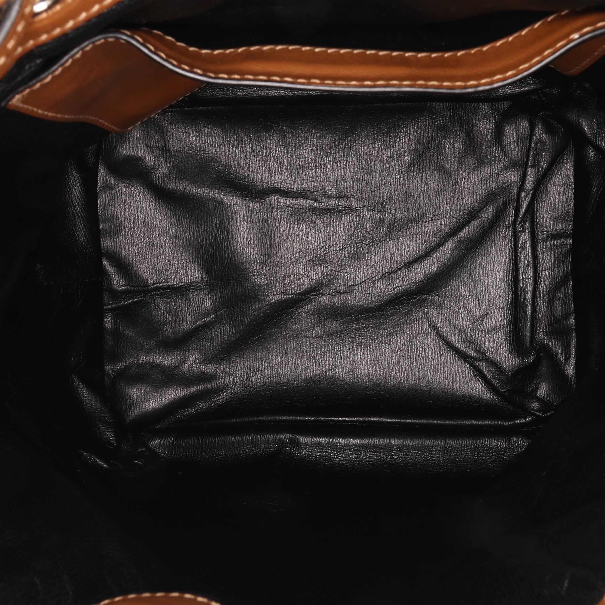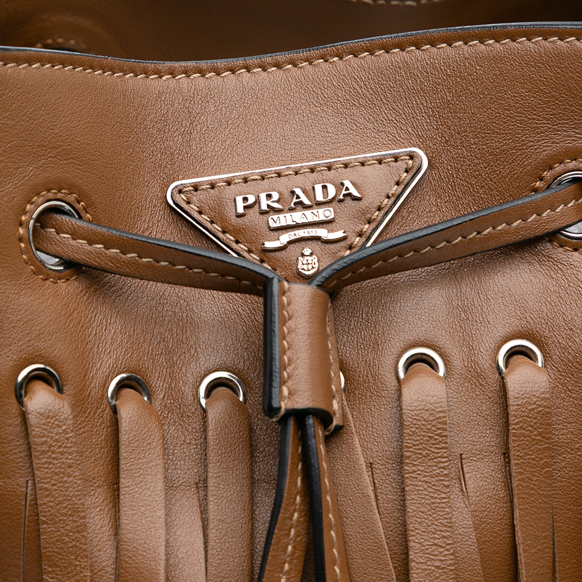 This bucket bag features a leather body with fringe details, a flat leather top handle, an adjustable and detachable flat leather shoulder strap, an open top with drawstring closure, and an interior slip pocket. Retail Price: 2500.00
