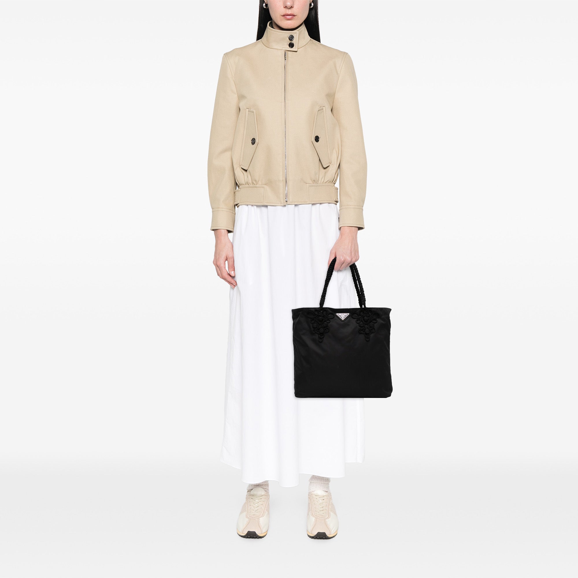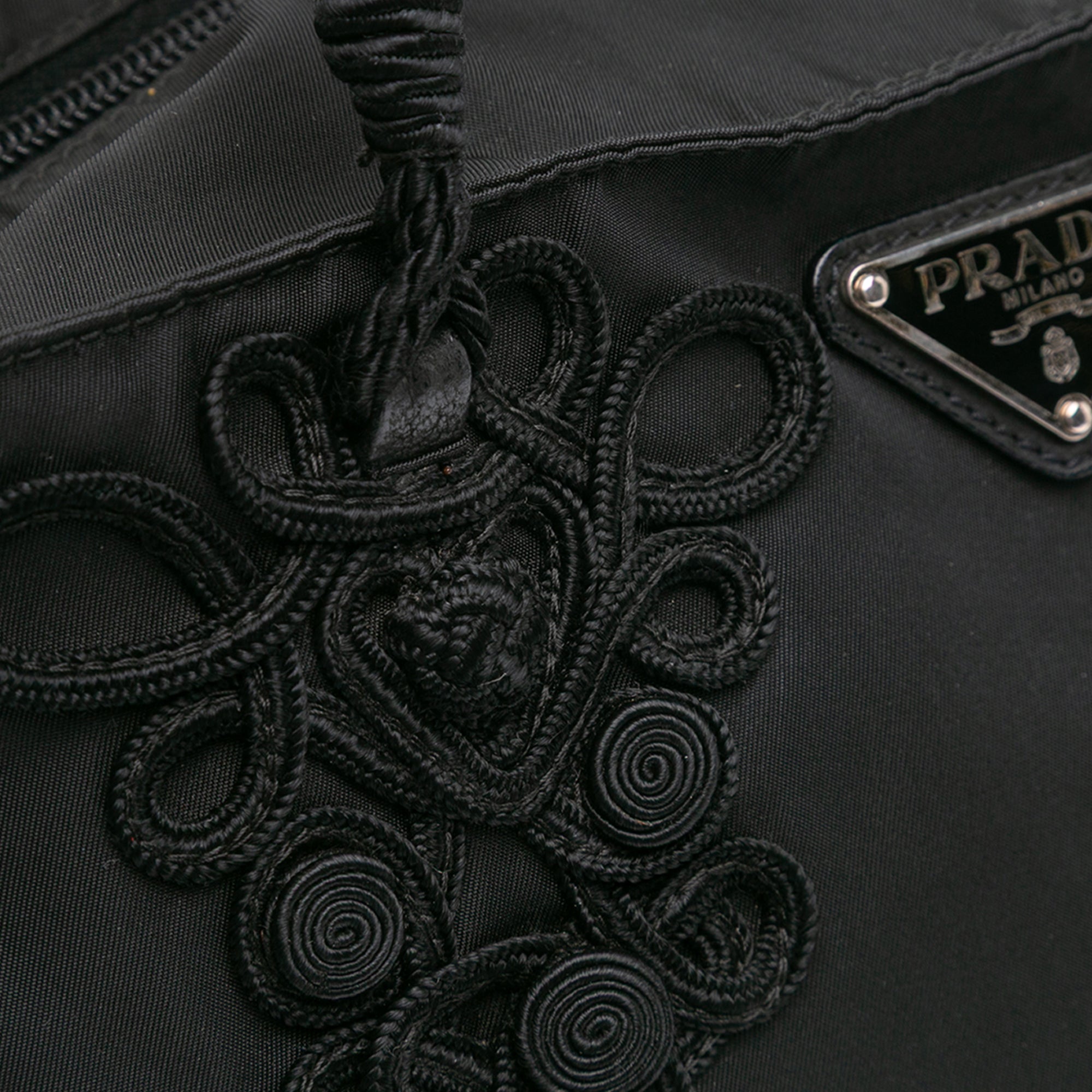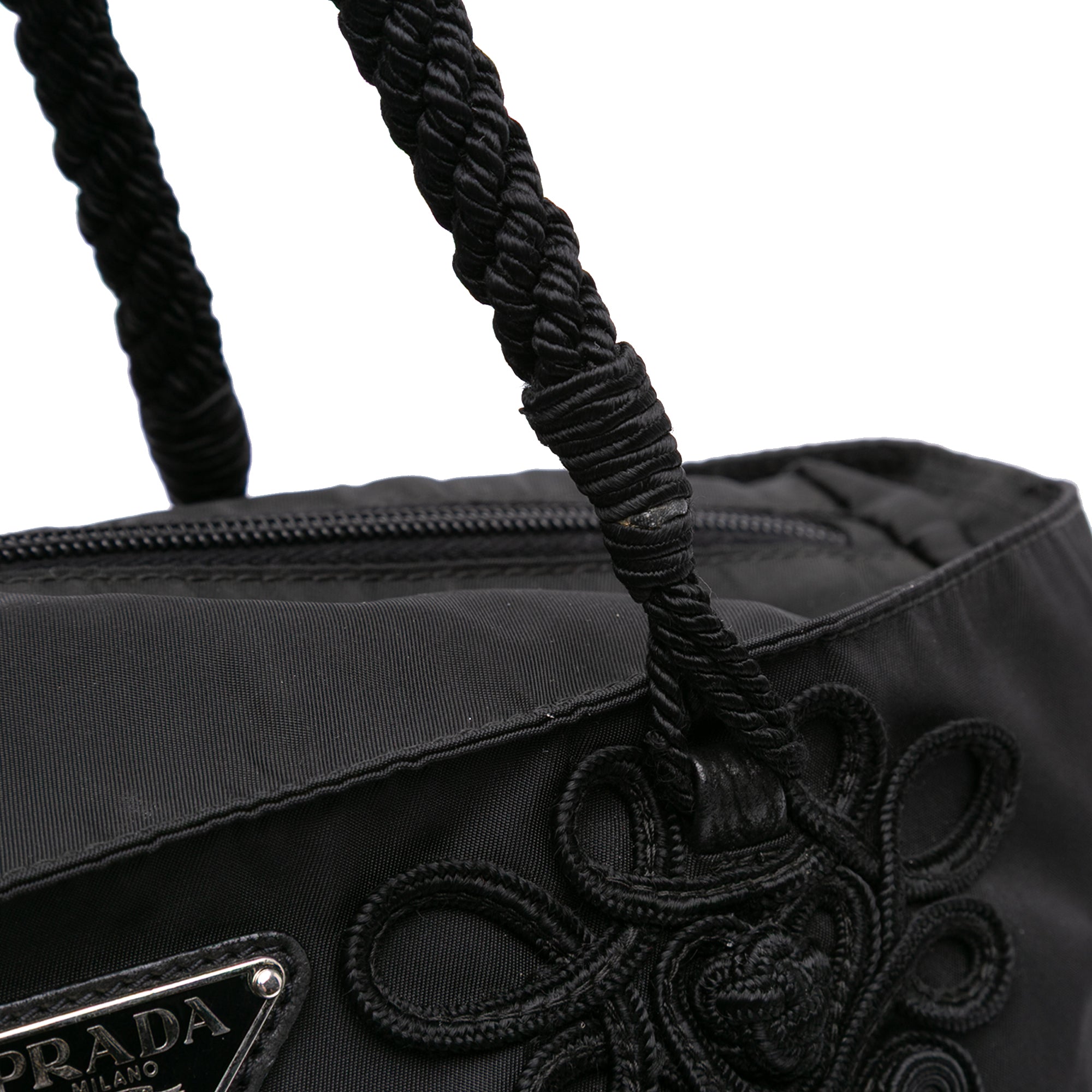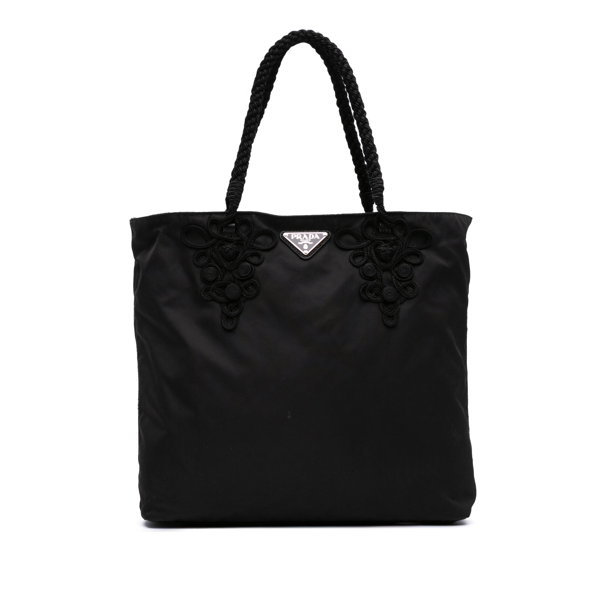 This tote bag features a nylon body, braided shoulder straps, a top zip closure, and an interior zip pocket. Retail Price: 1000.00
