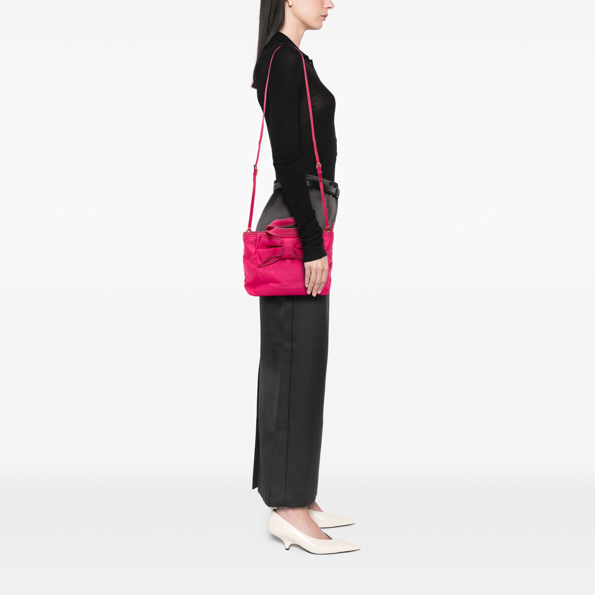 This satchel features a nylon body, a nylon bow detail, flat handles, a detachable flat leather strap, a top zip closure, and interior zip and slip pockets. Inclusion: authenticity card. Retail Price: 1365.00