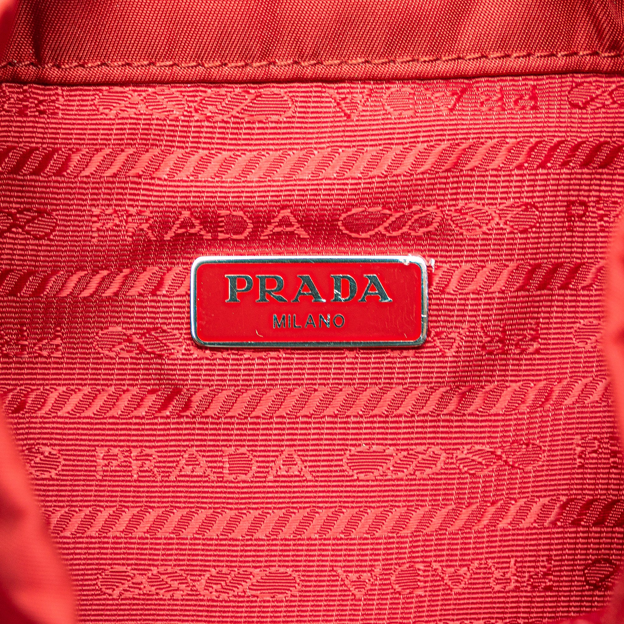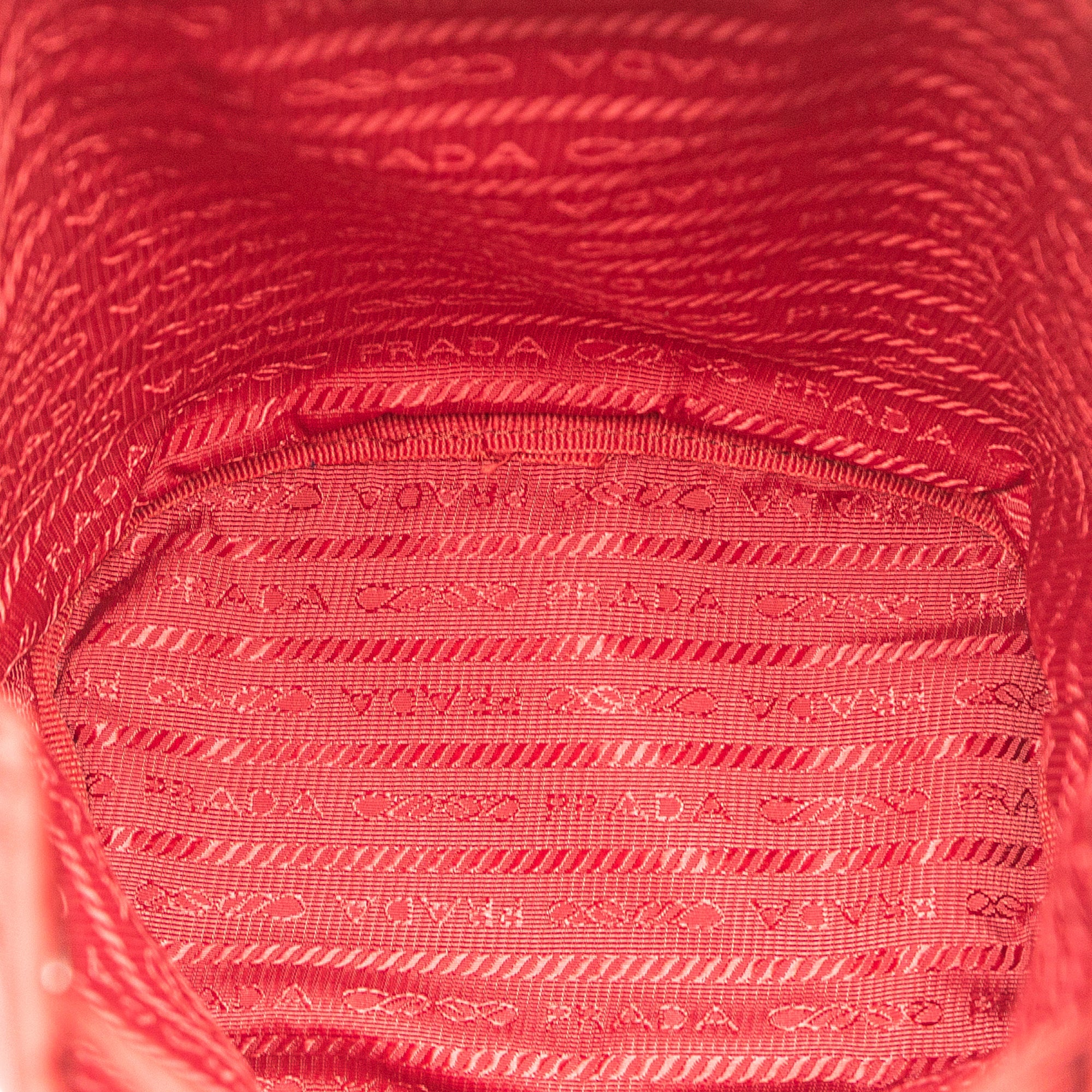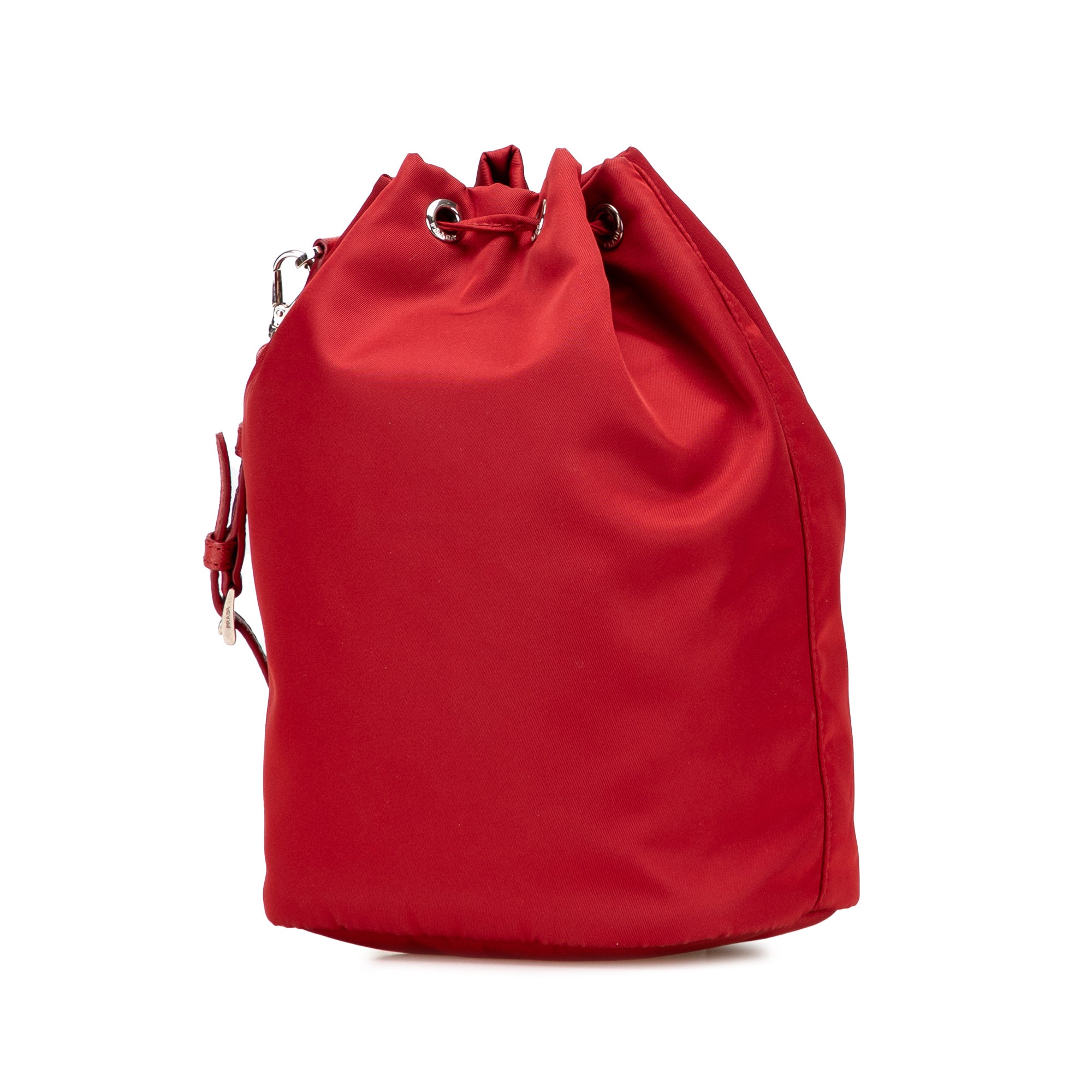 This bucket bag features a nylon body, an adjustable and detachable flat leather wrist strap, and a top drawstring closure. Retail Price: 990.00