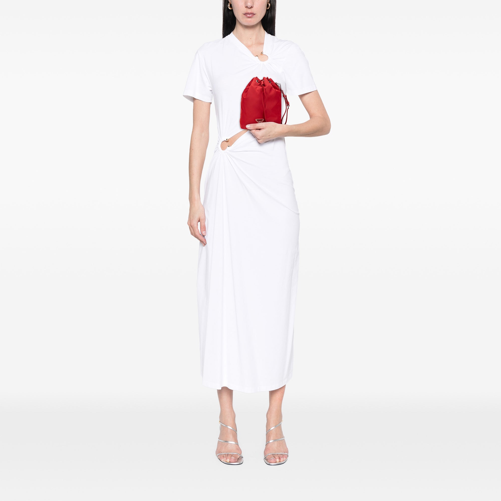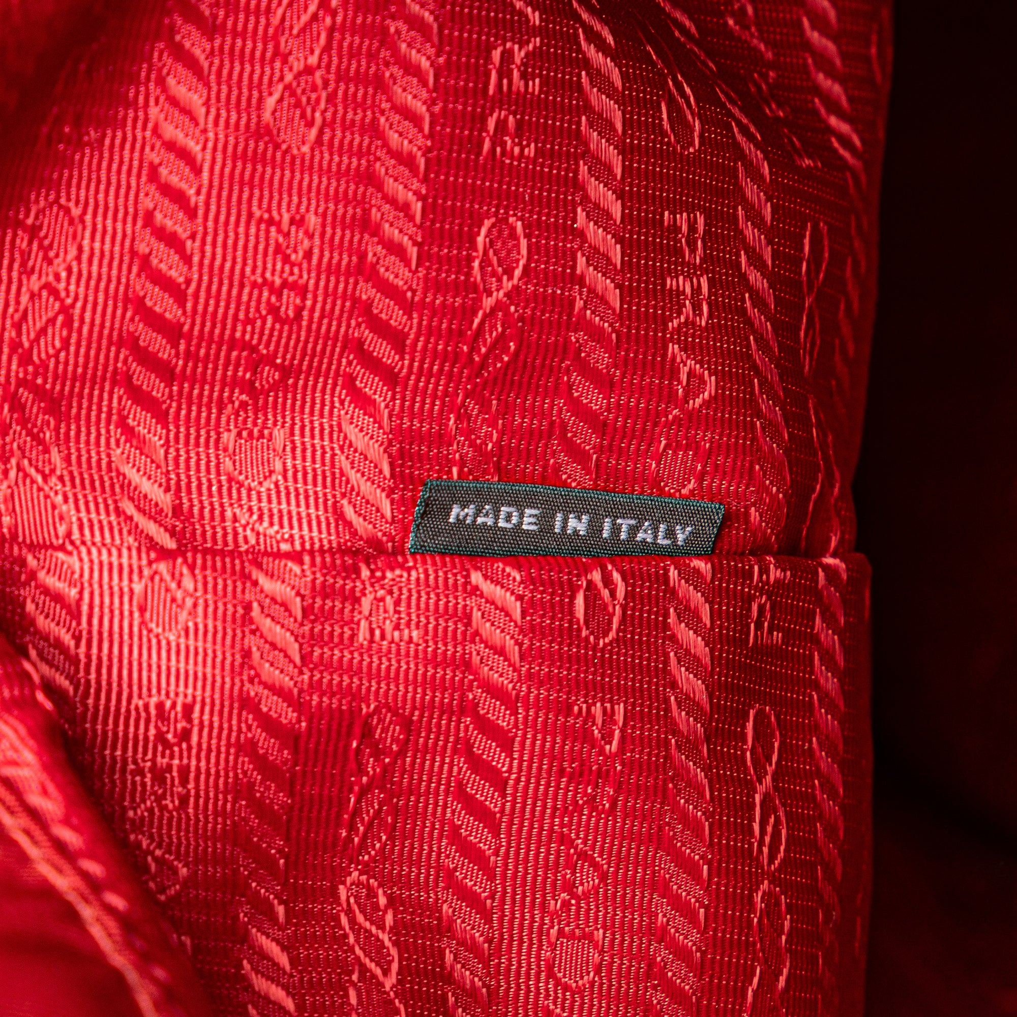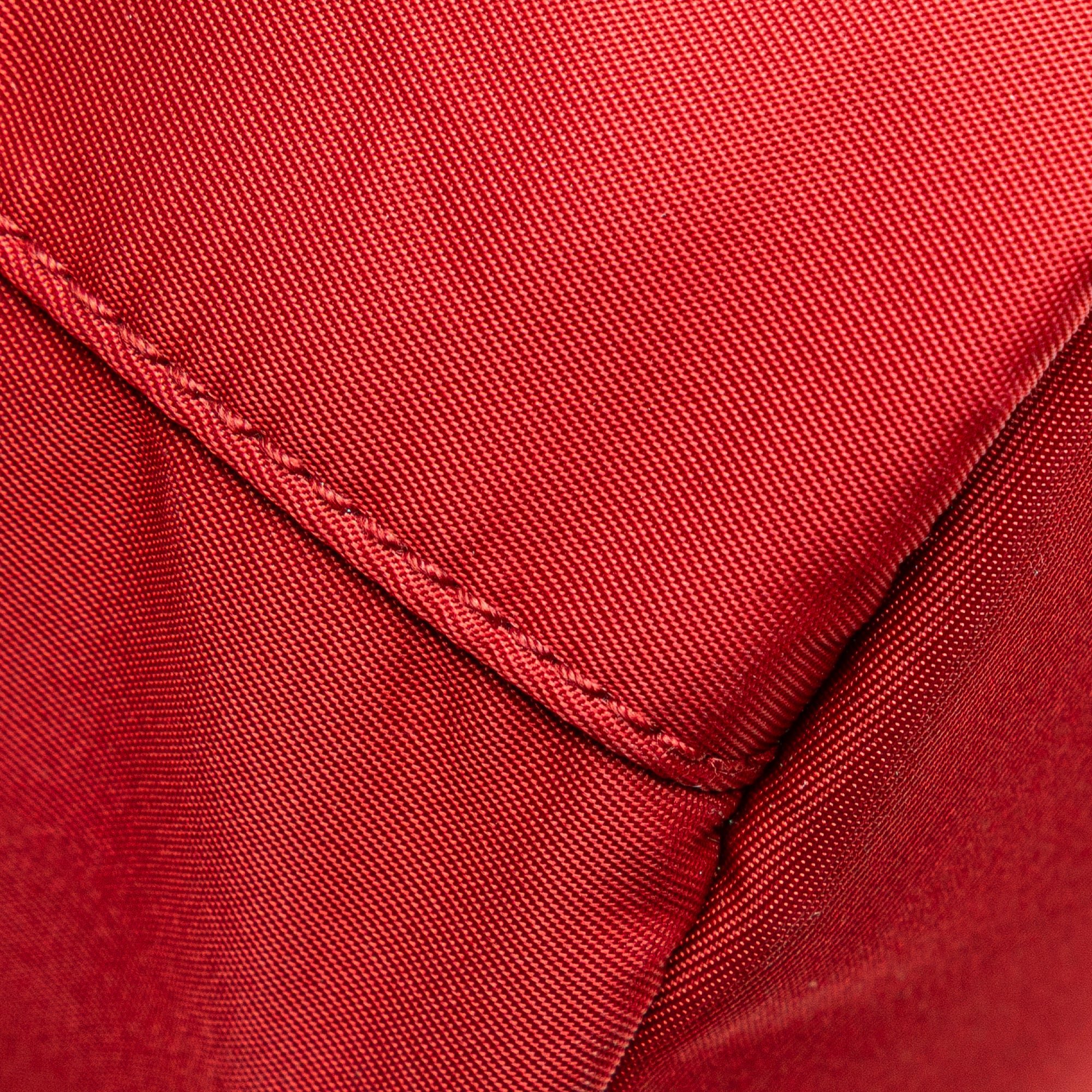 This bucket bag features a nylon body, an adjustable and detachable flat leather wrist strap, and a top drawstring closure. Retail Price: 990.00