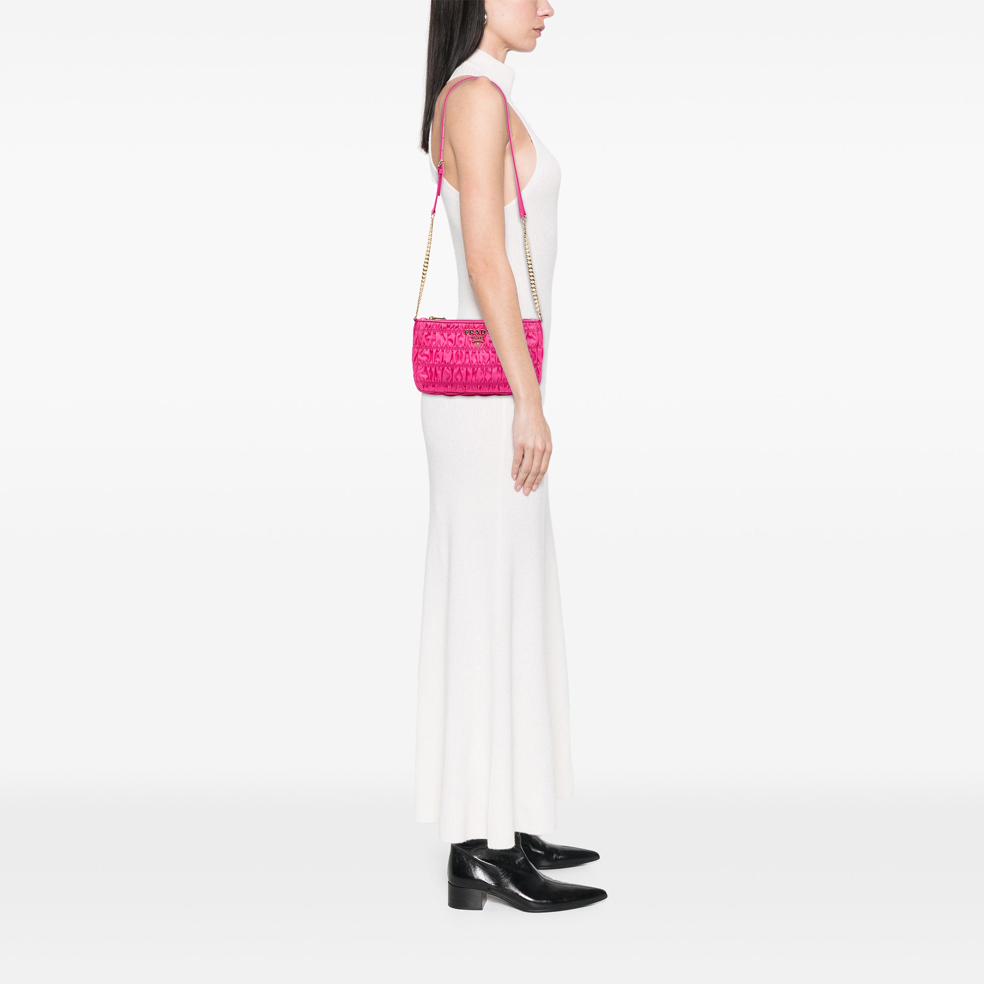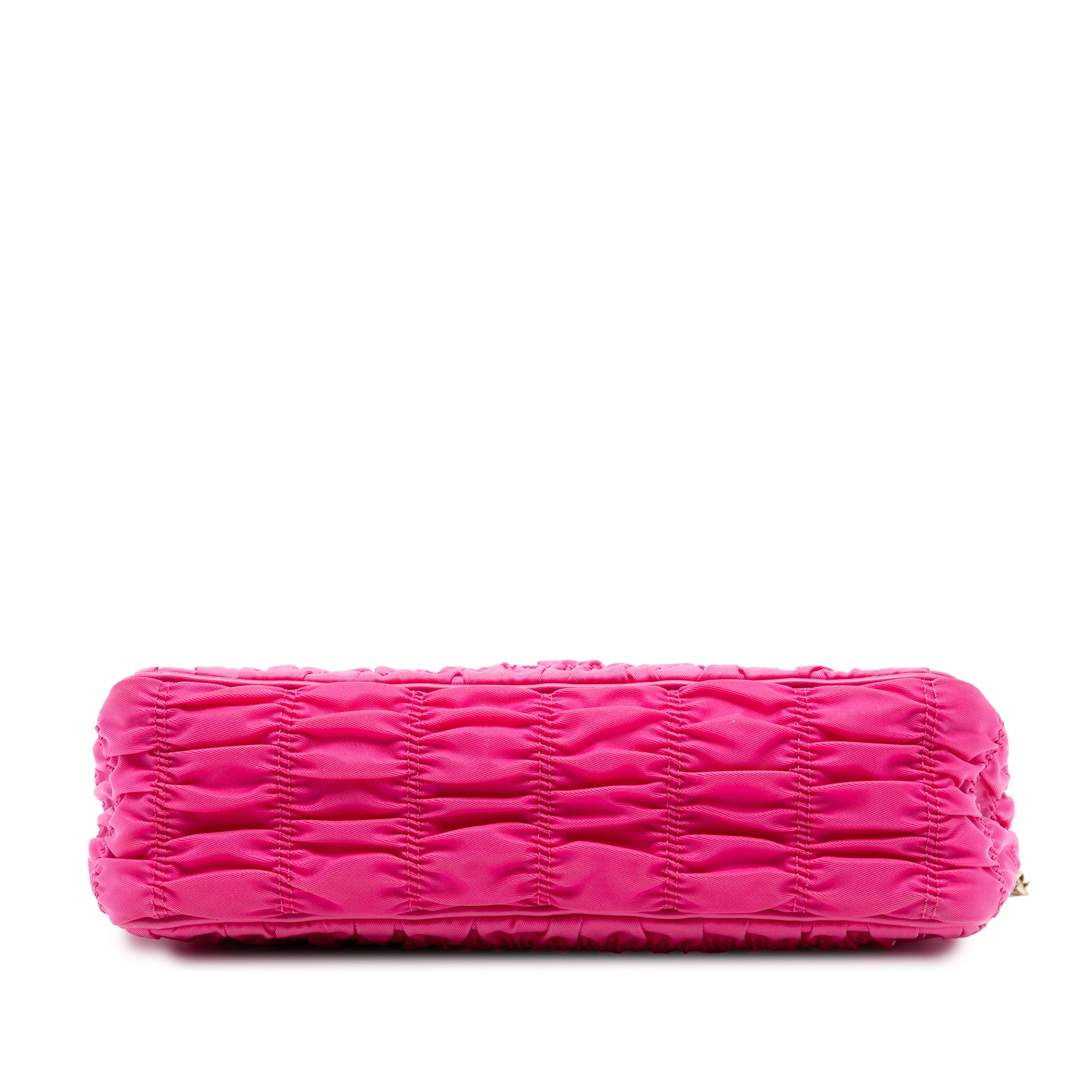 This crossbody bag features a gathered nylon body, a chain link strap with leather guard, a top zip closure, and an interior zip pocket. Retail Price: 1665.00