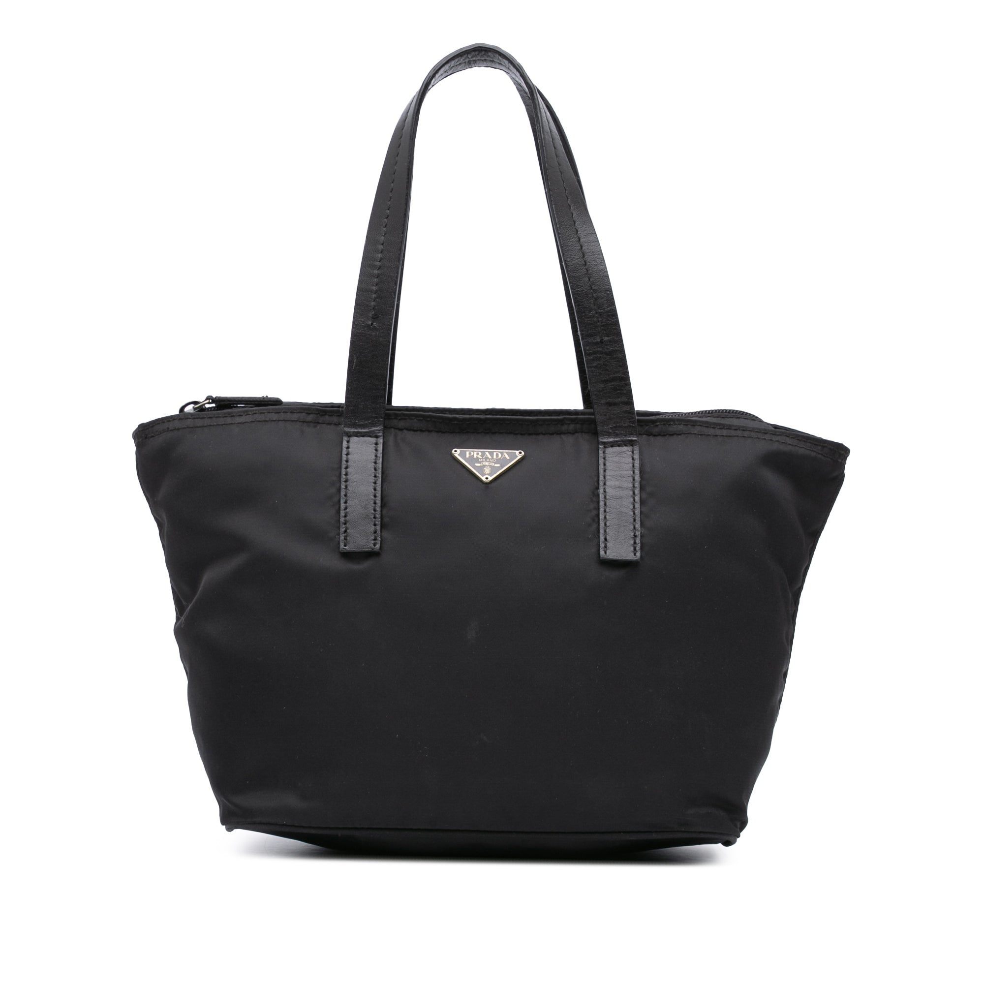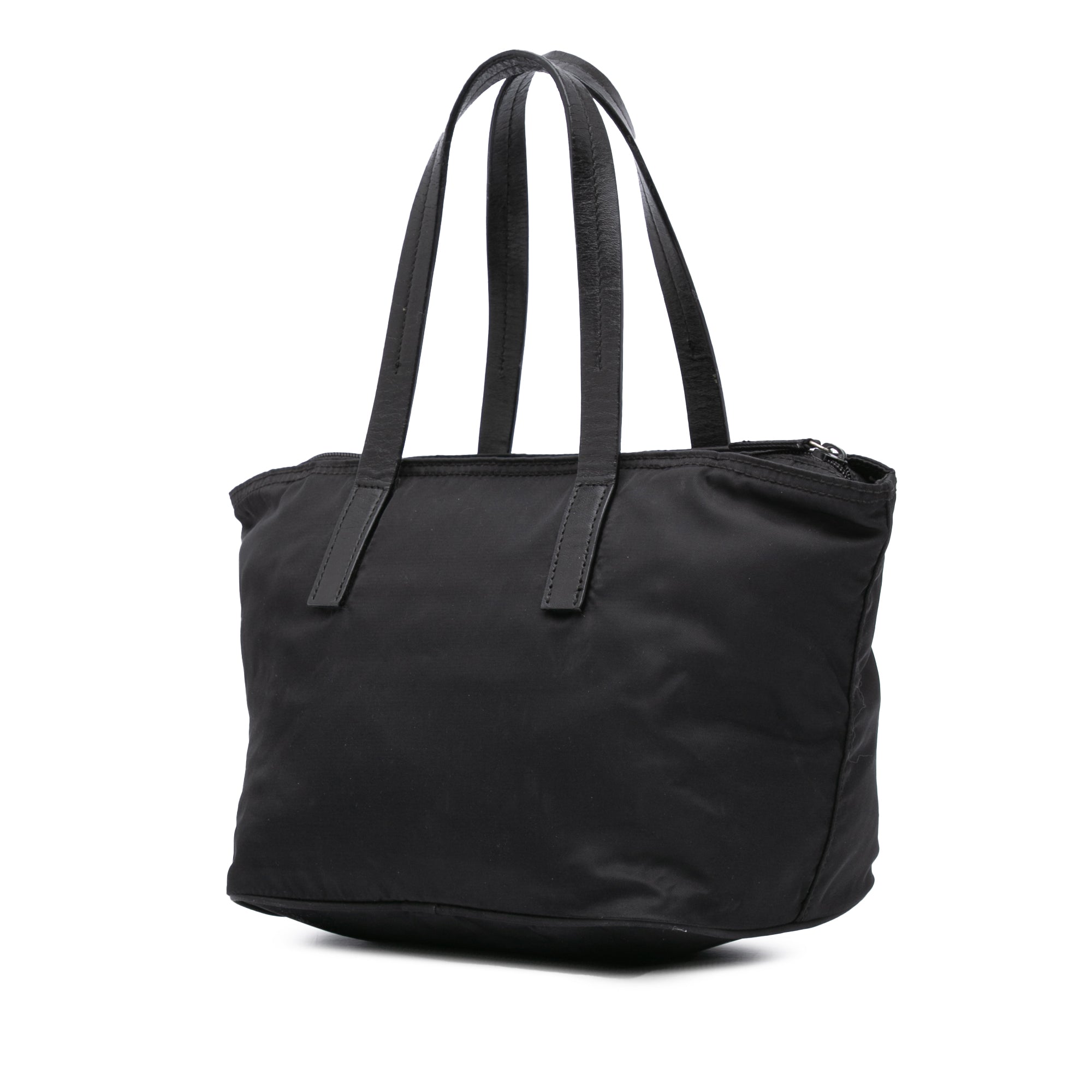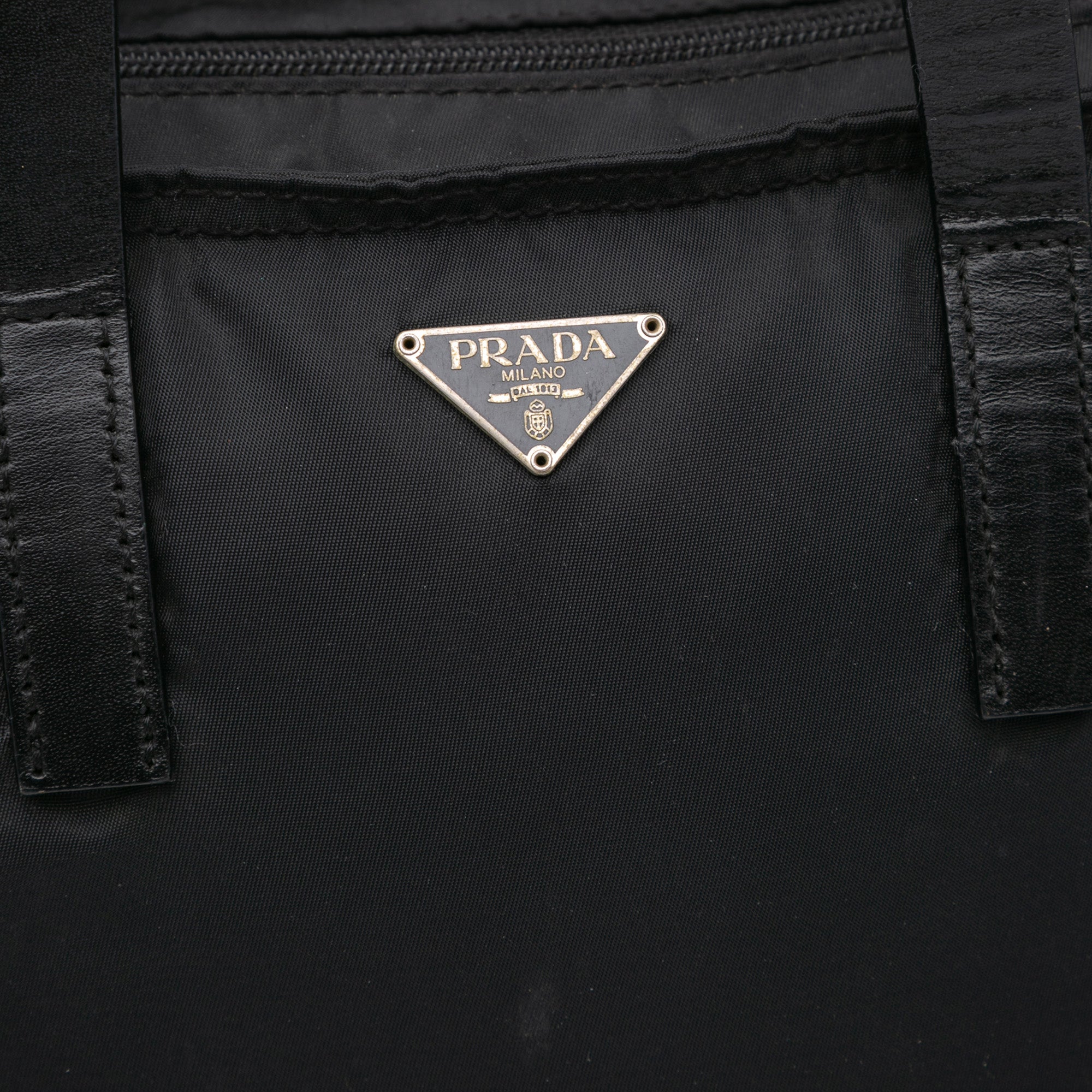 This handbag features a nylon body, flat leather handles, a top zip closure, and an interior zip pocket. Retail Price: 450.00