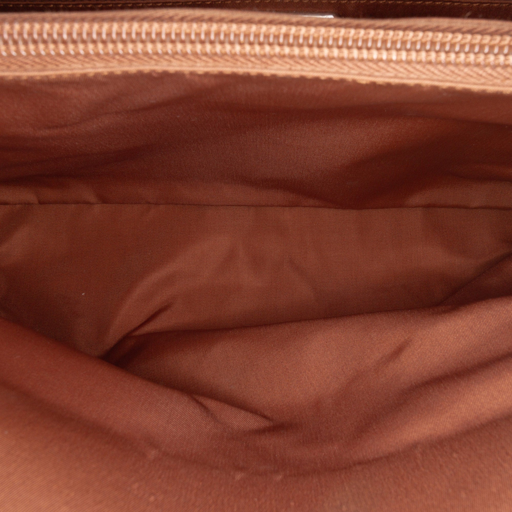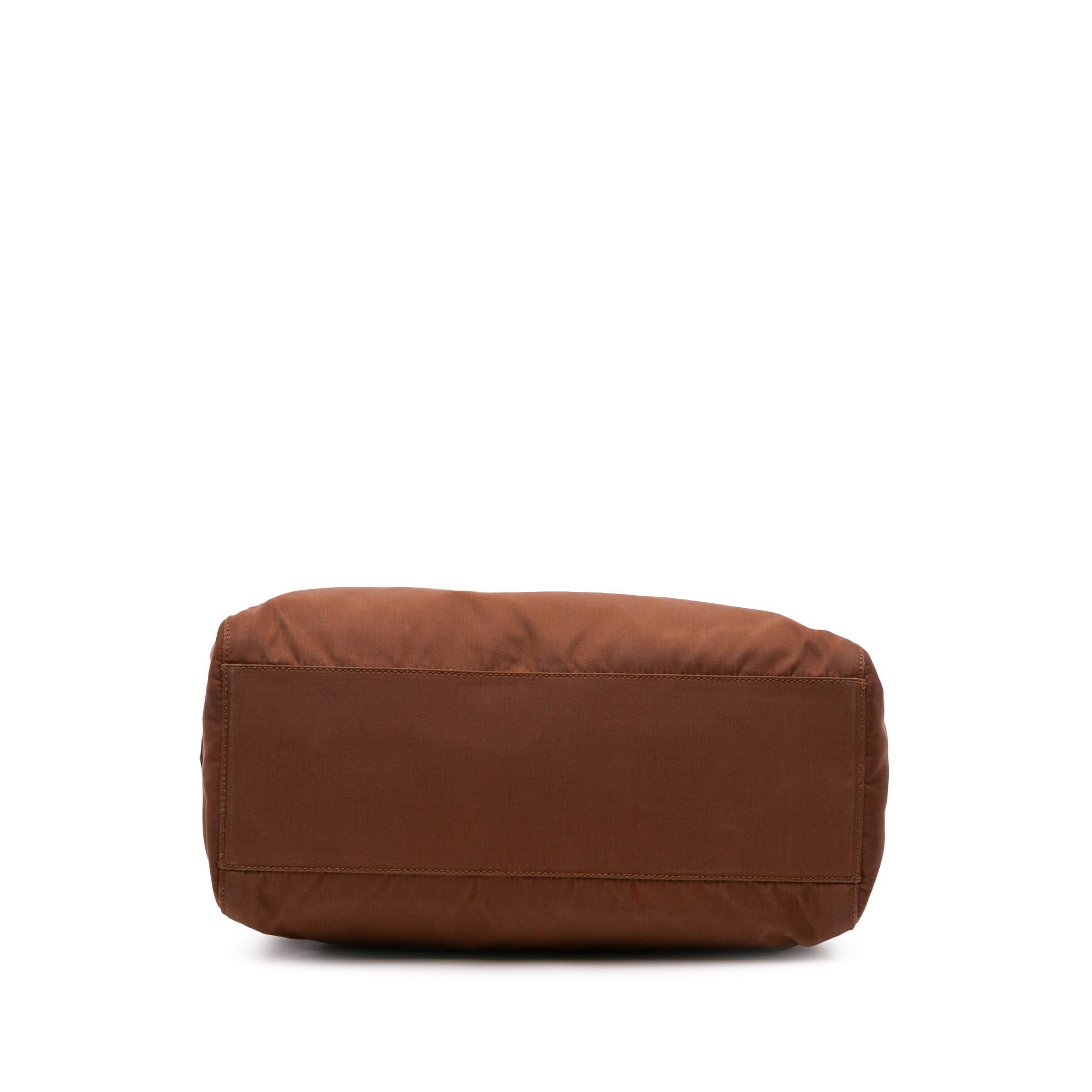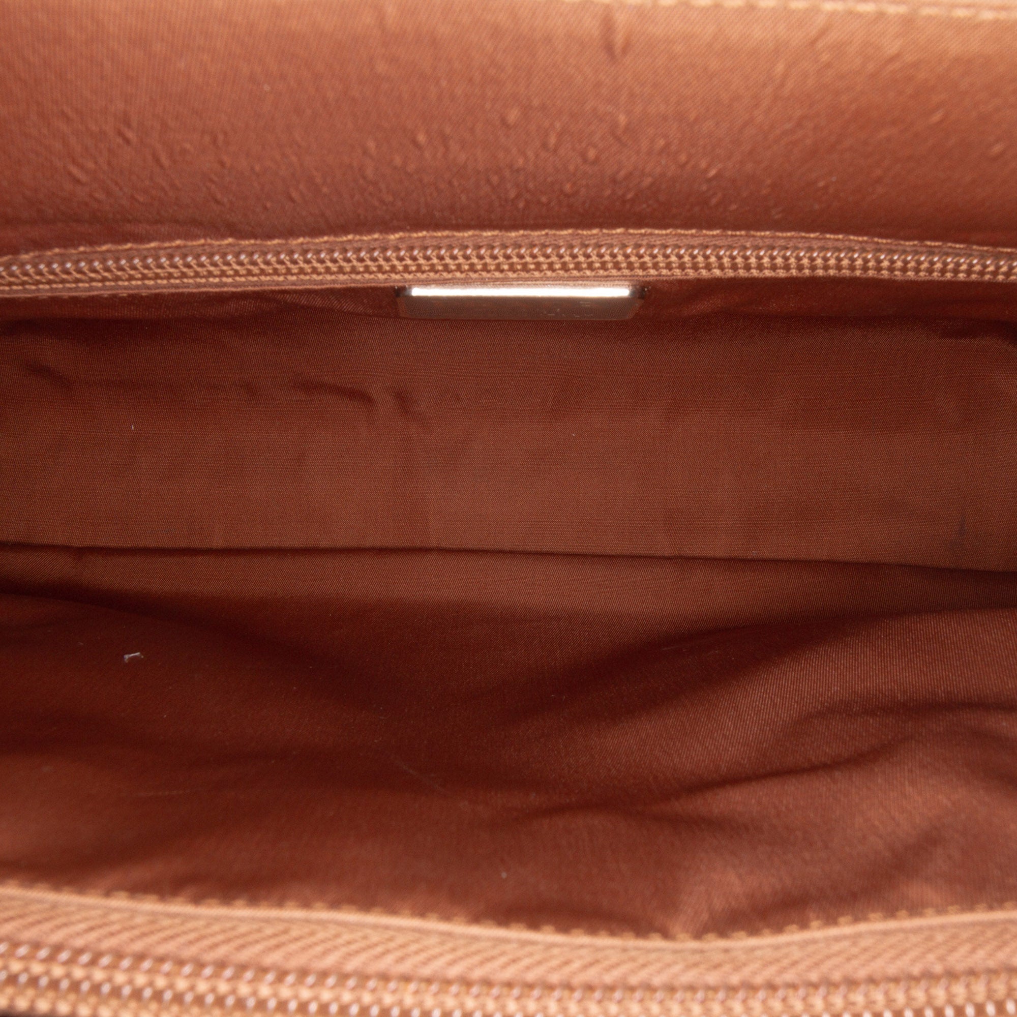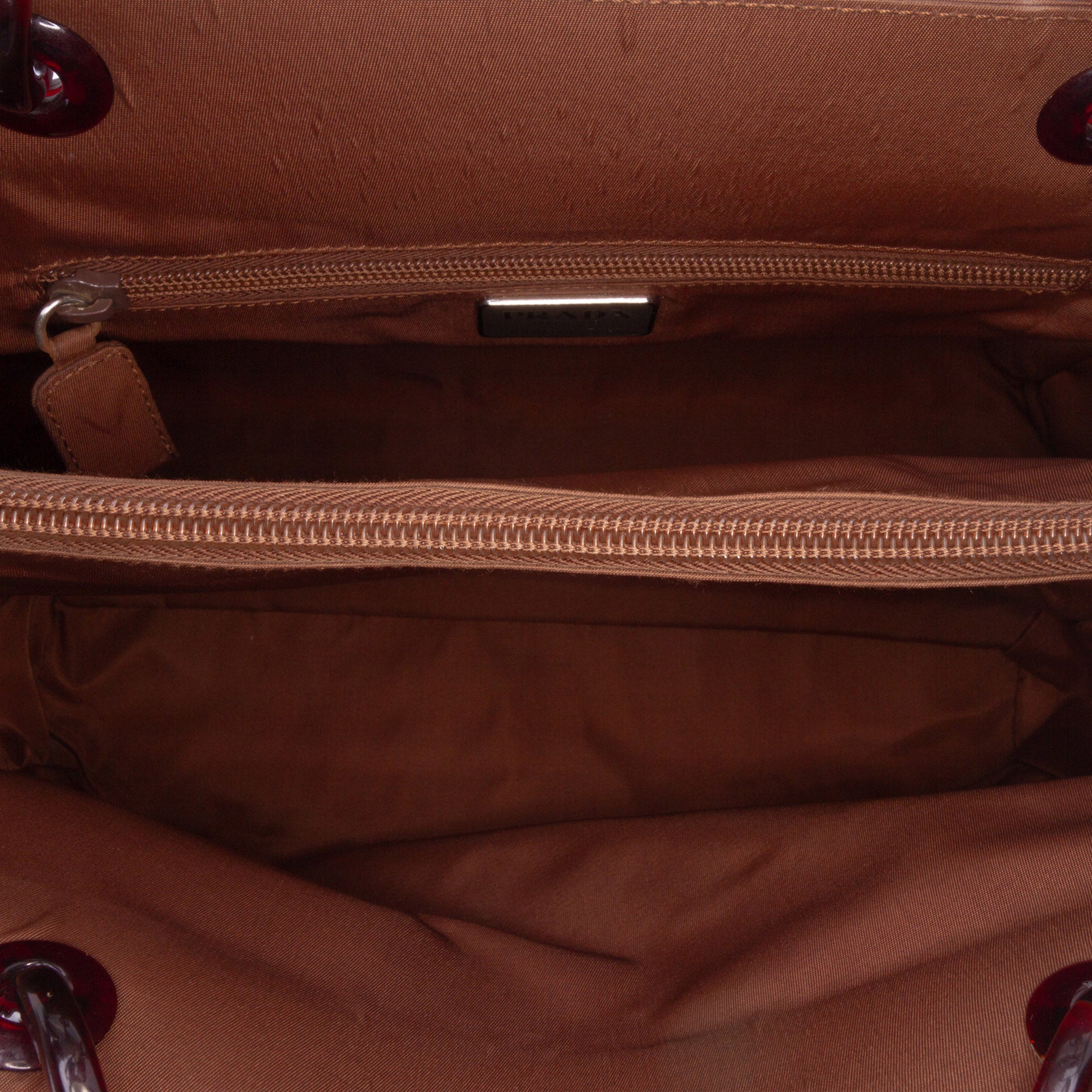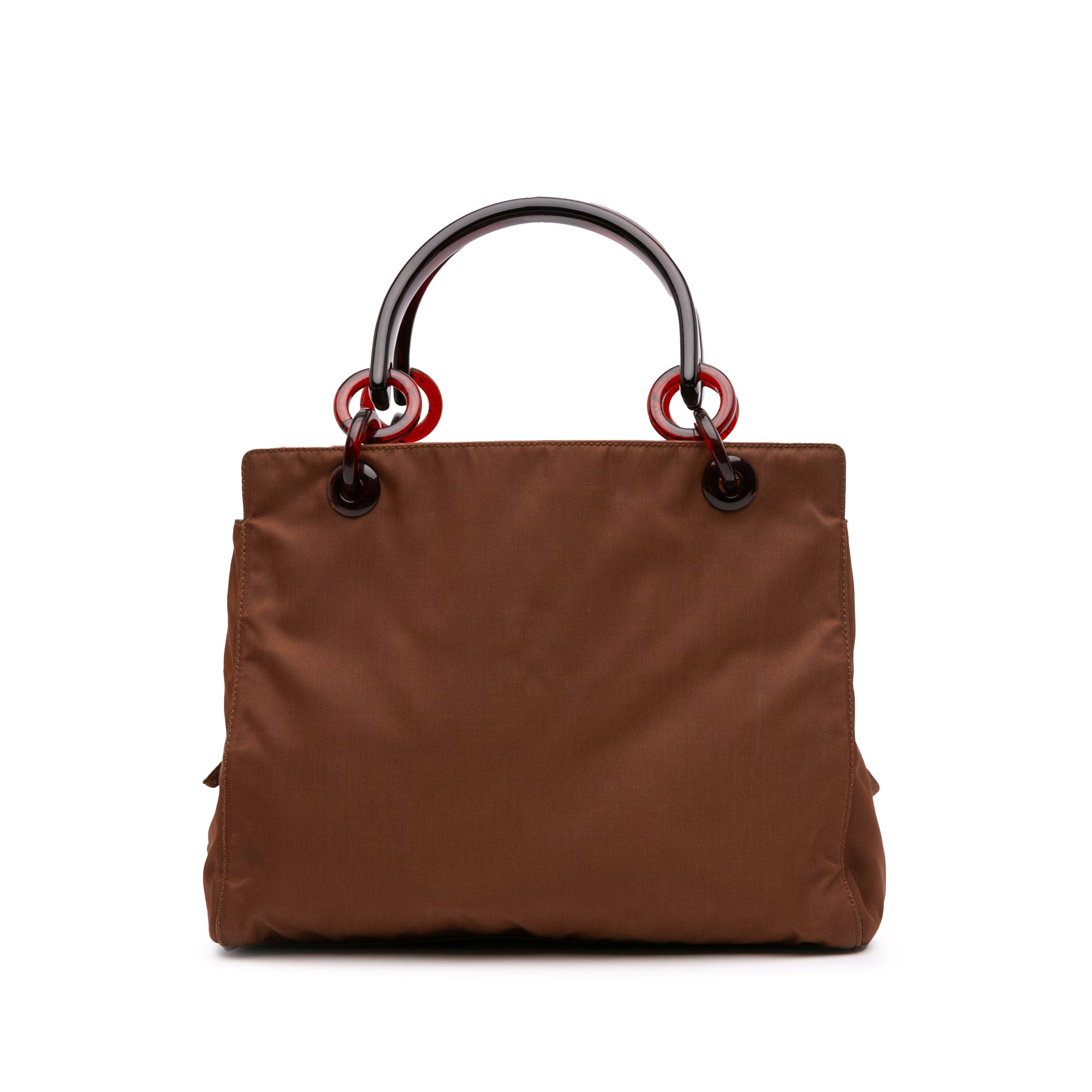 This handbag features a nylon body, acrylic handles, an open top, an interior zip compartment, and an interior zip pocket. Retail Price: 760.00