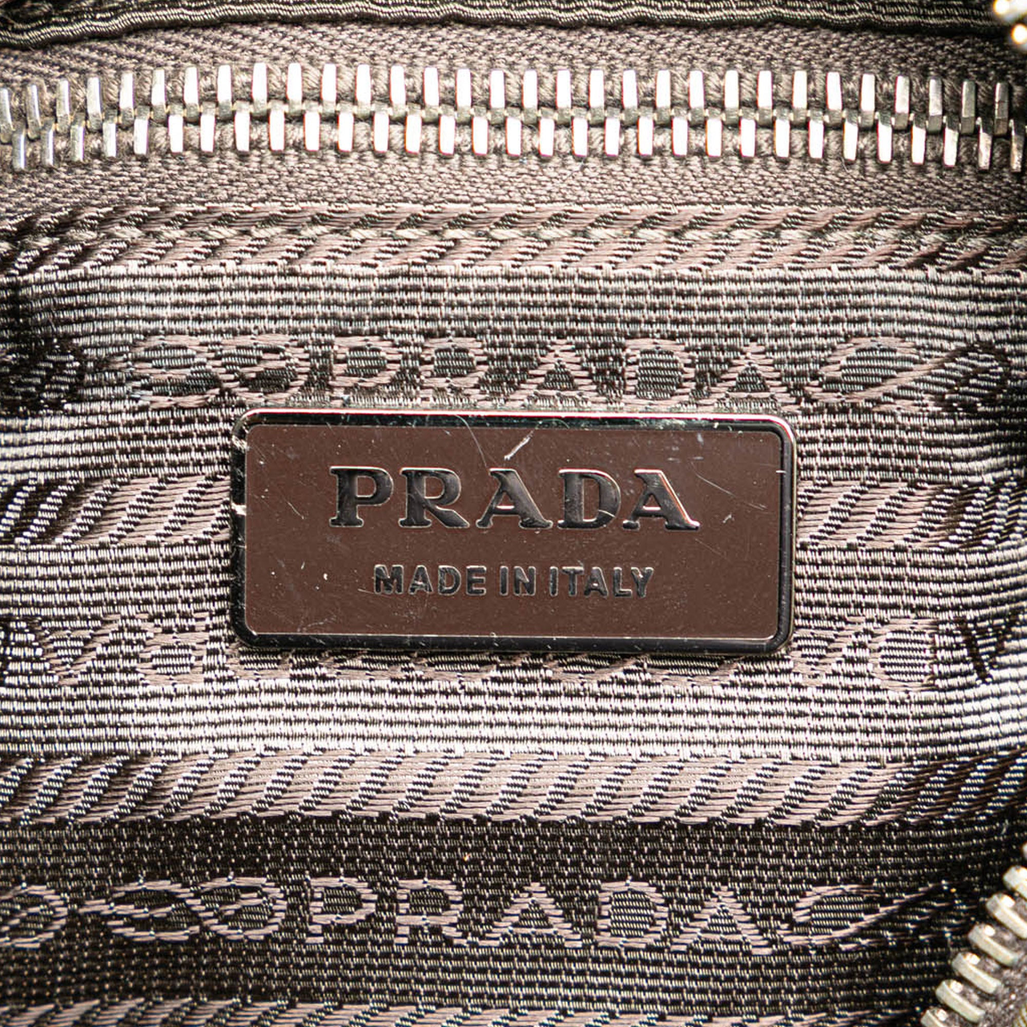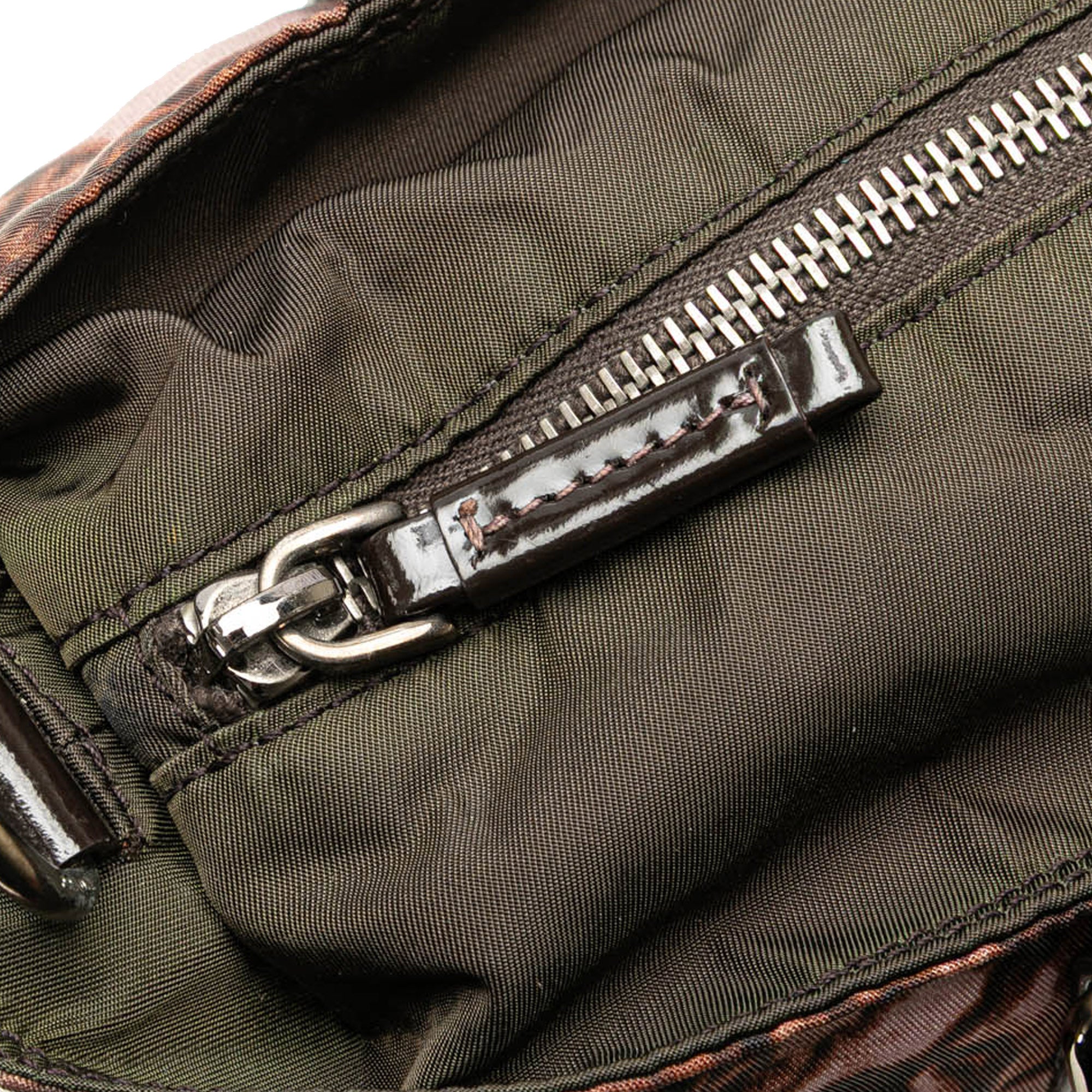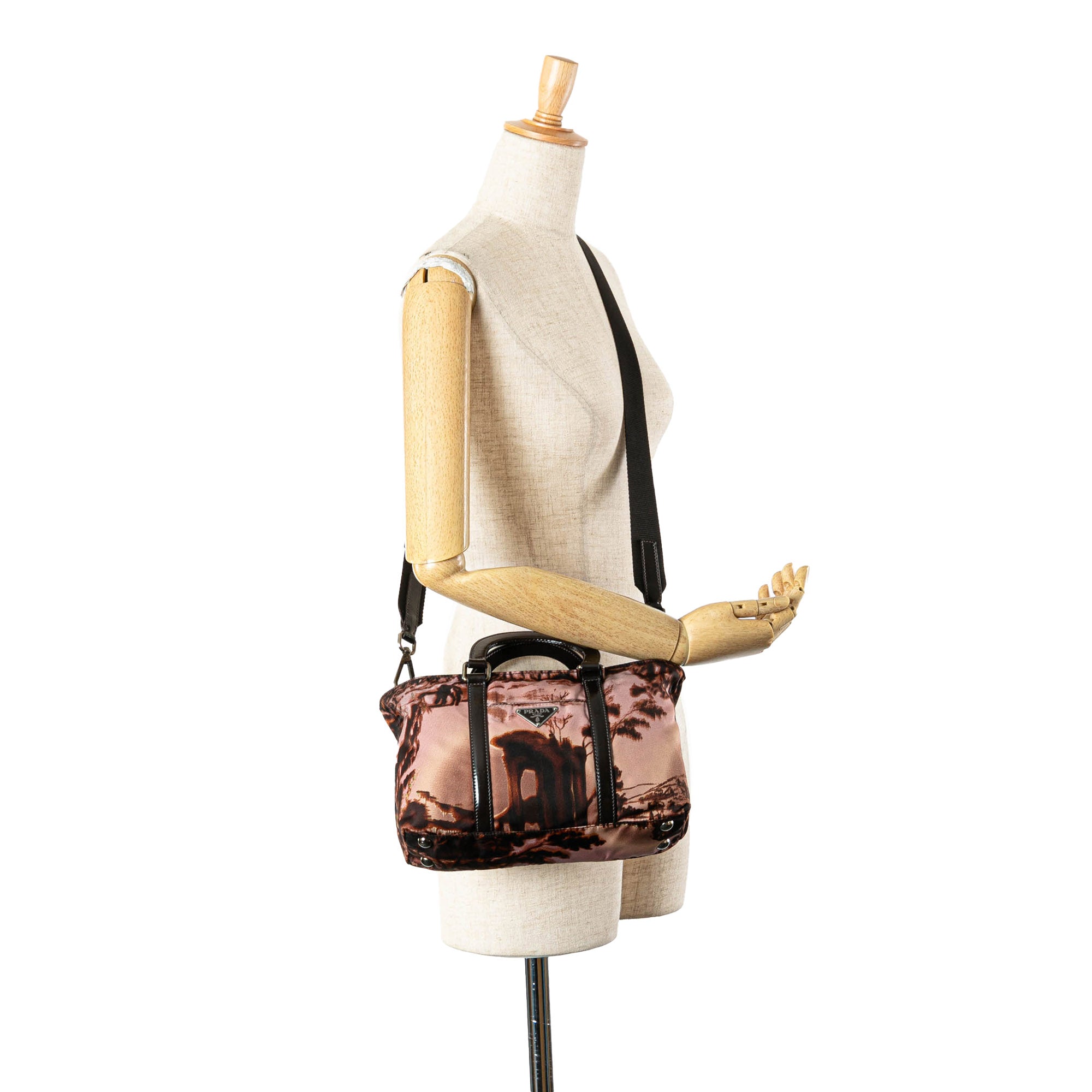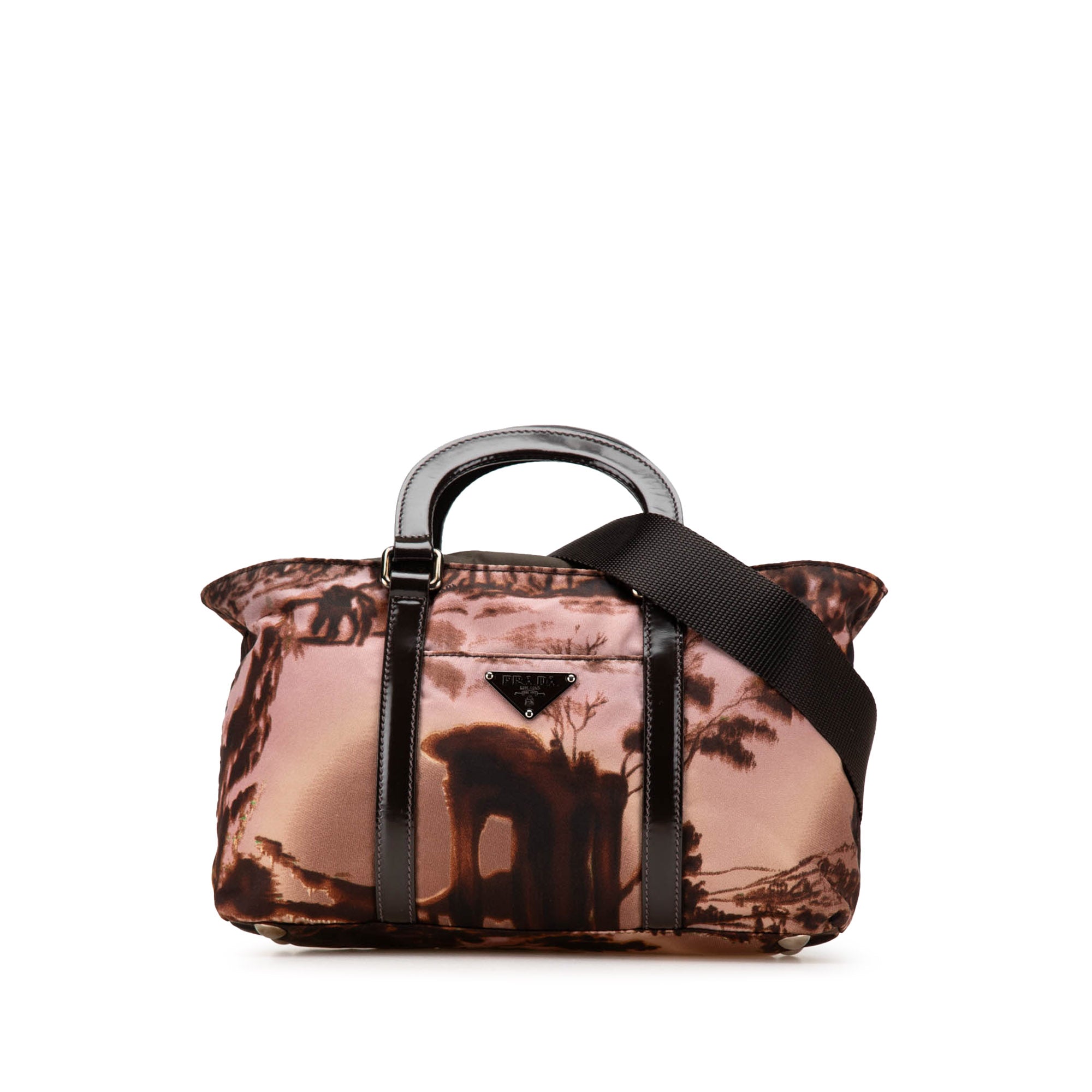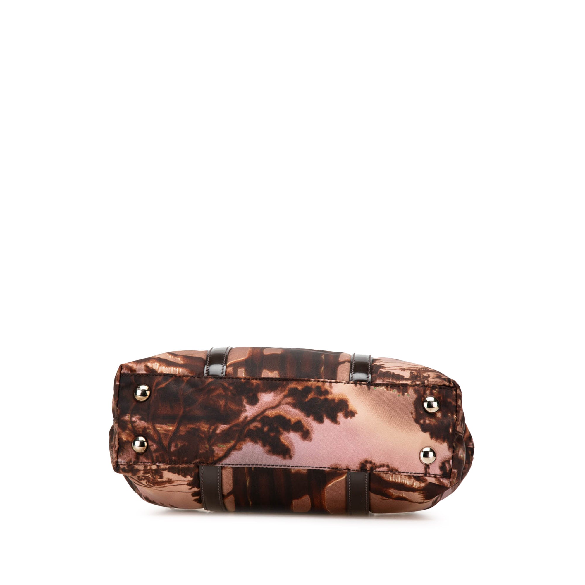 This satchel features a printed nylon body with leather trim, flat leather handles, a detachable flat strap, a top zip closure, exterior front and back slip pockets, and an interior zip pocket. Inclusion: Dust bag, authenticity card. Retail Price: 890.00