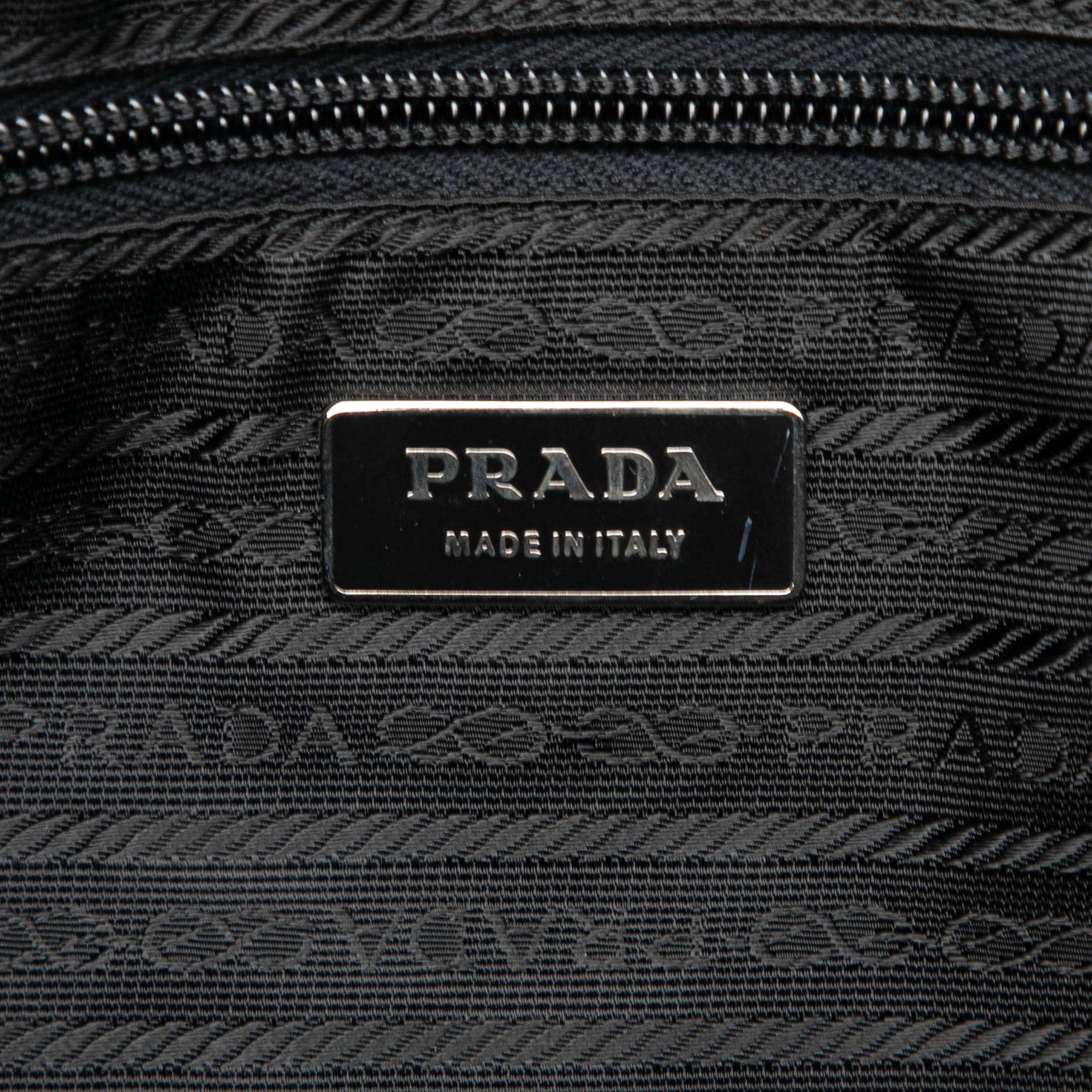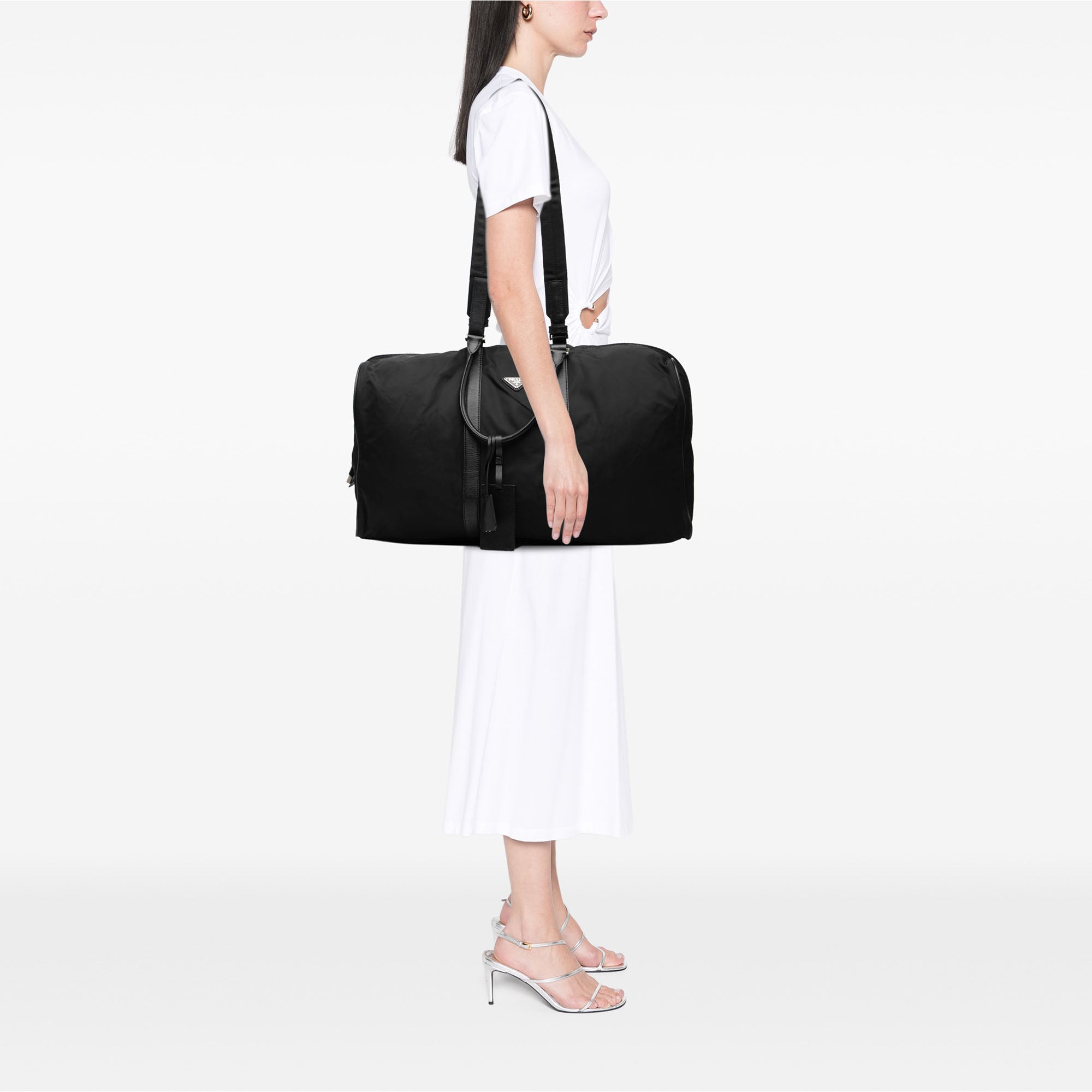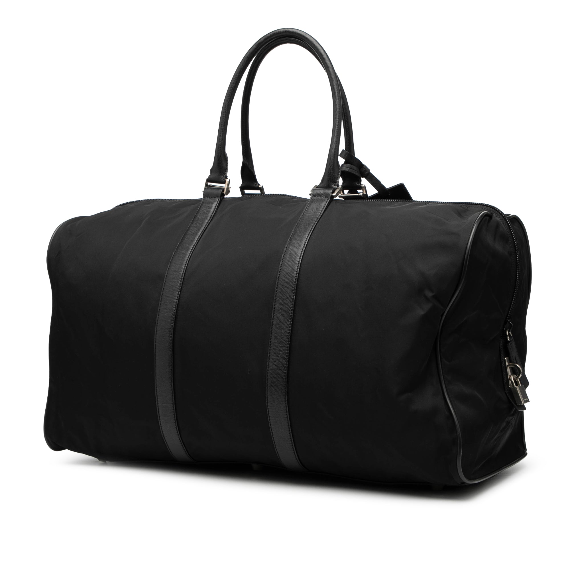 This travel bag features a nylon body with leather trim, rolled leather handles, a detachable flat strap, a top zip closure, and an interior zip pocket. Inclusion: authenticity card. Retail Price: 1175.00