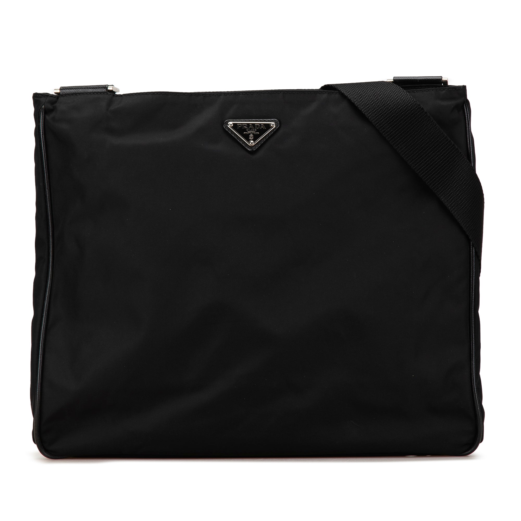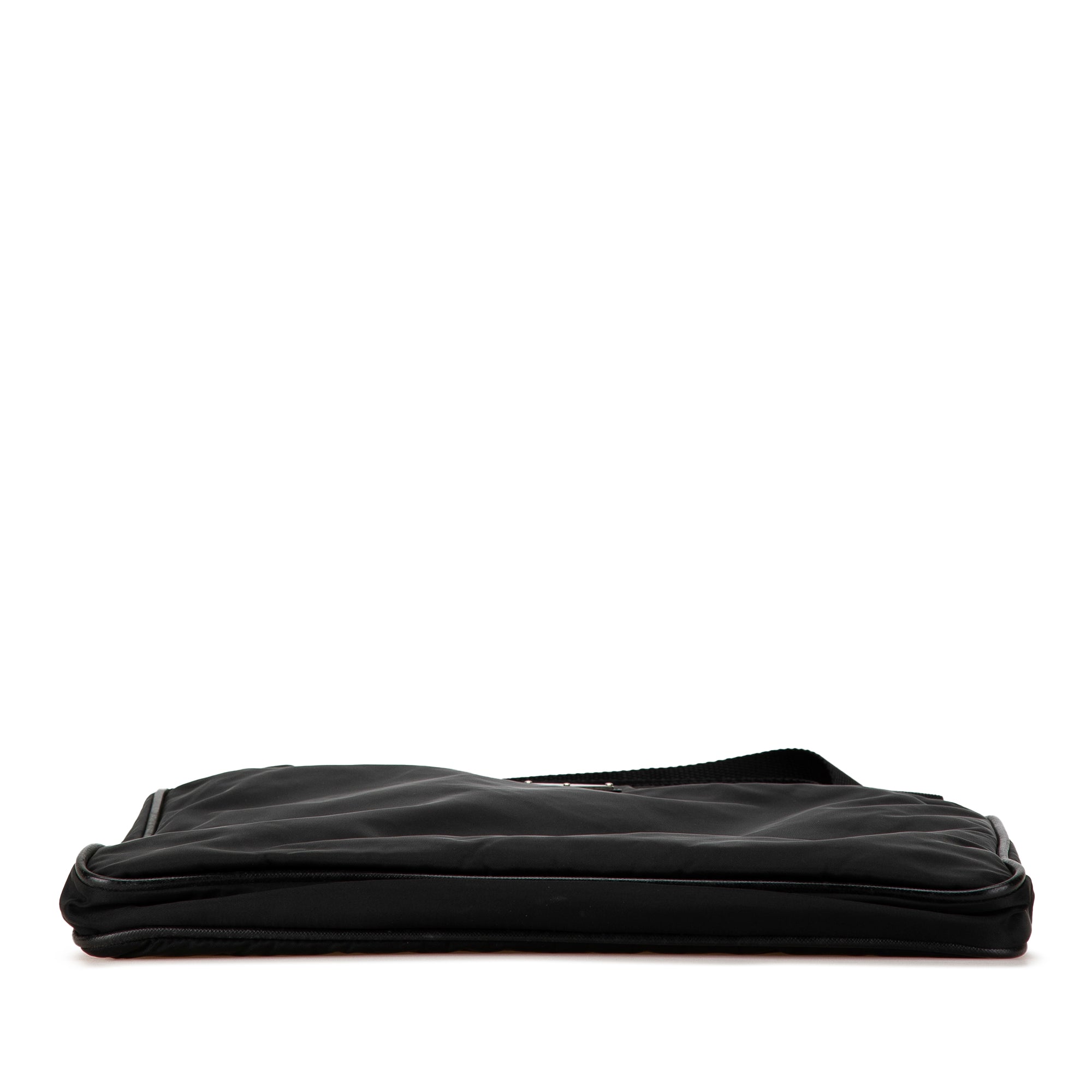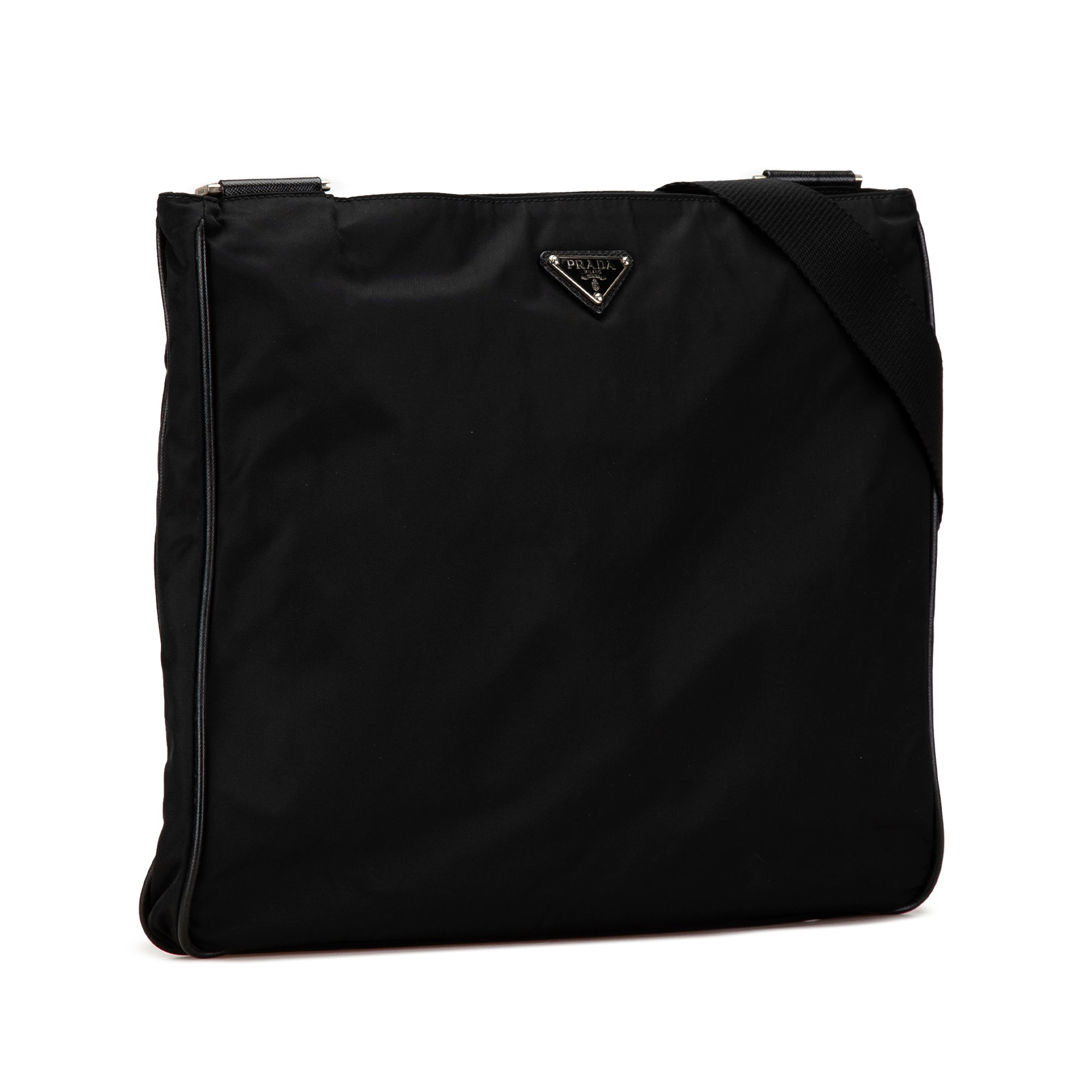 This crossbody bag features a nylon body with leather trim, a flat shoulder strap, an exterior zip pocket, a top zip closure, and an interior zip pocket. Retail Price: 1000.00