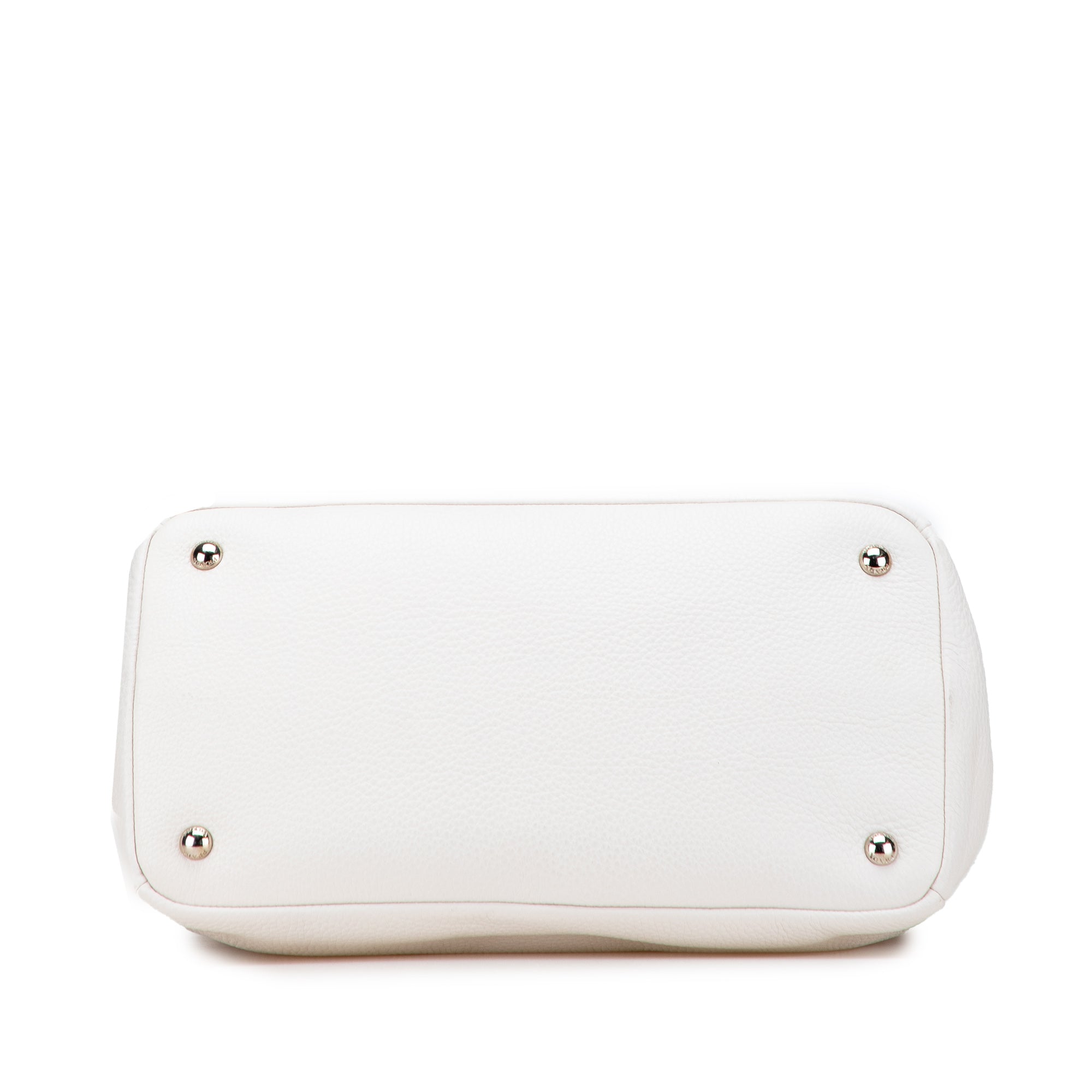 This satchel features a leather body, rolled leather handles, a detachable flat strap, an open top with a snap button closure, an interior zip compartment, and interior zip and slip pockets. Inclusion: authenticity card. Retail Price: 1695.00