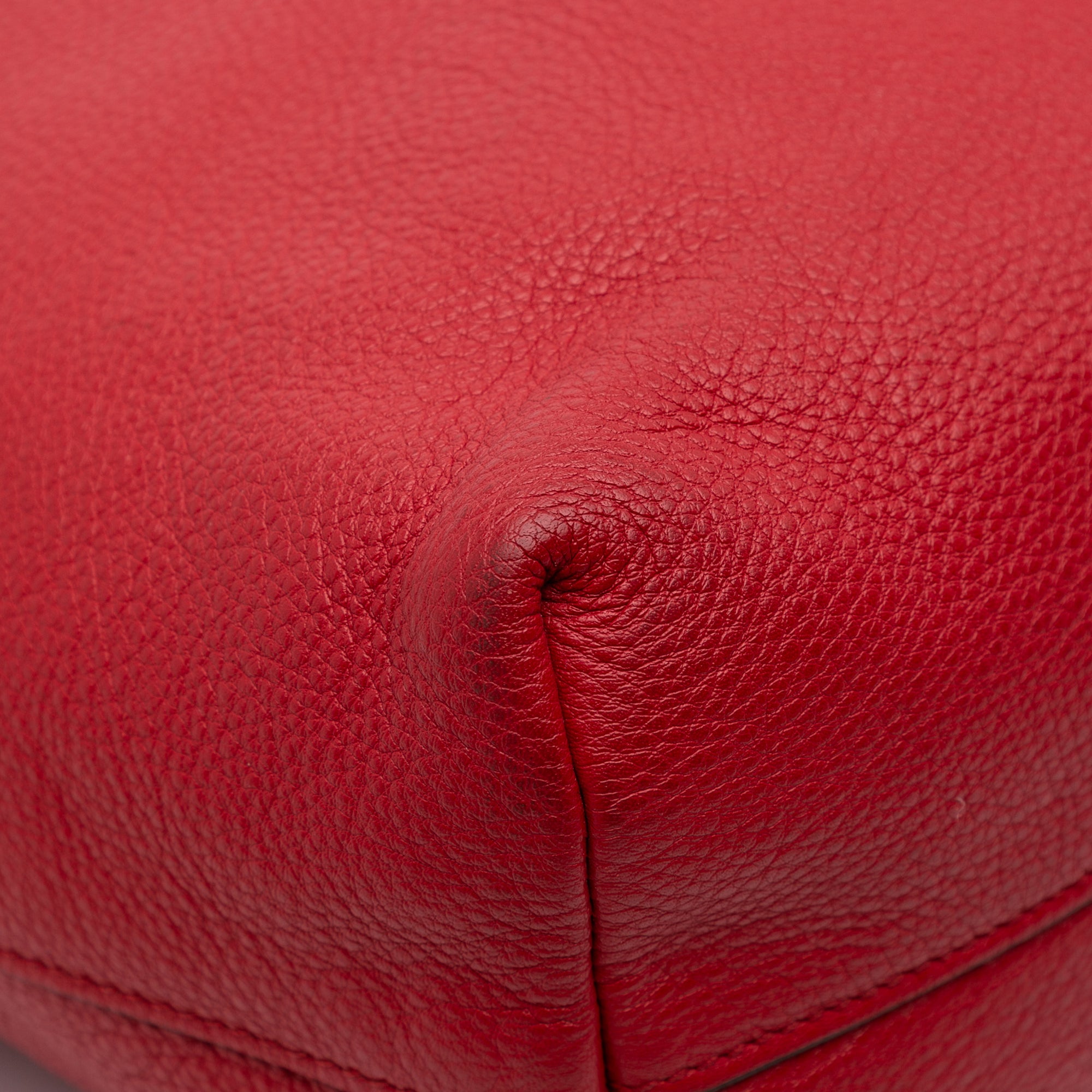 This satchel features a leather body, rolled leather handles, a detachable flat strap, an open top with a snap button closure, and interior zip and slip pockets. Retail Price: 1350.00