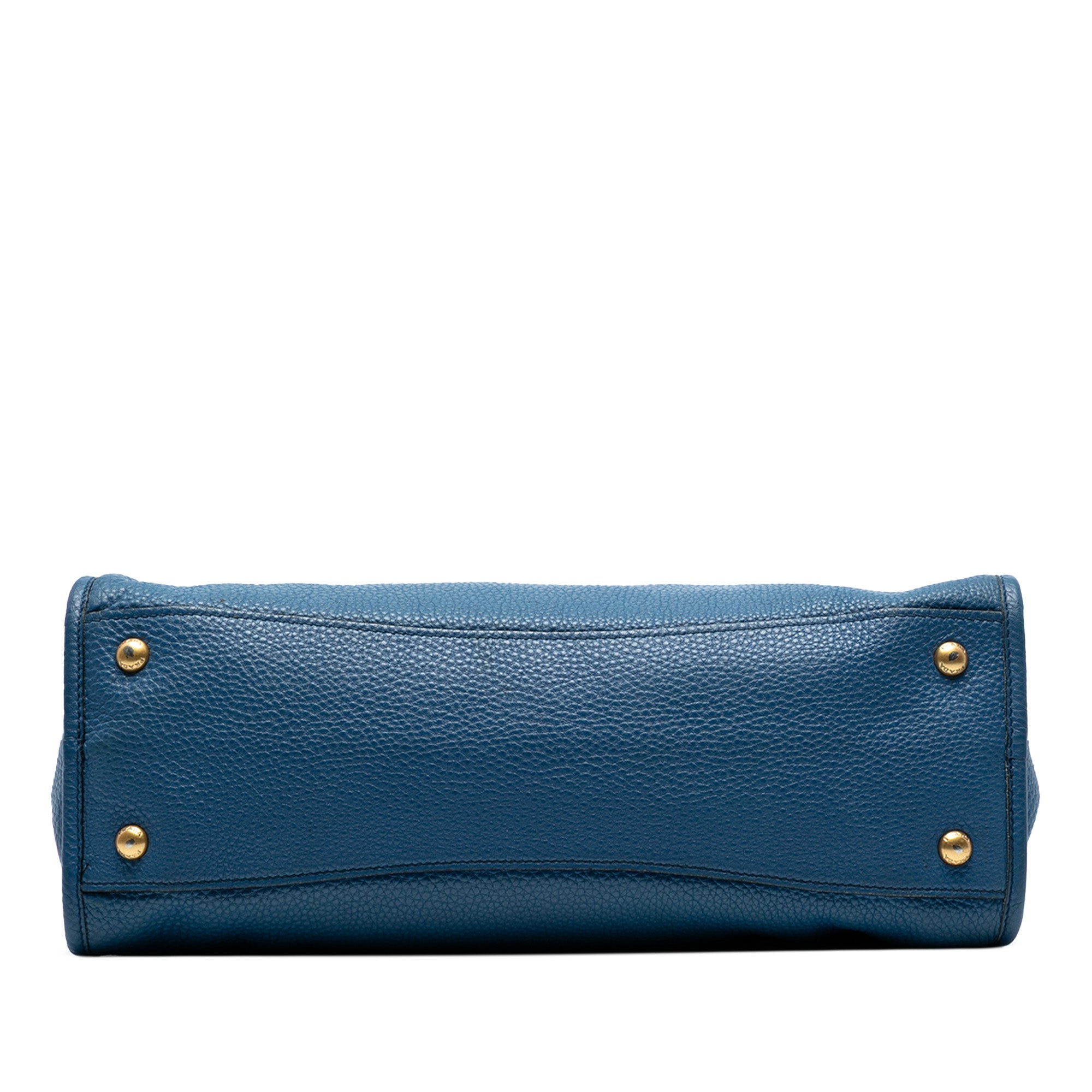 This satchel features a leather body, rolled leather handles, a detachable flat strap, a top zip closure, exterior zip pockets, and interior zip and slip pockets. Retail Price: 700.00