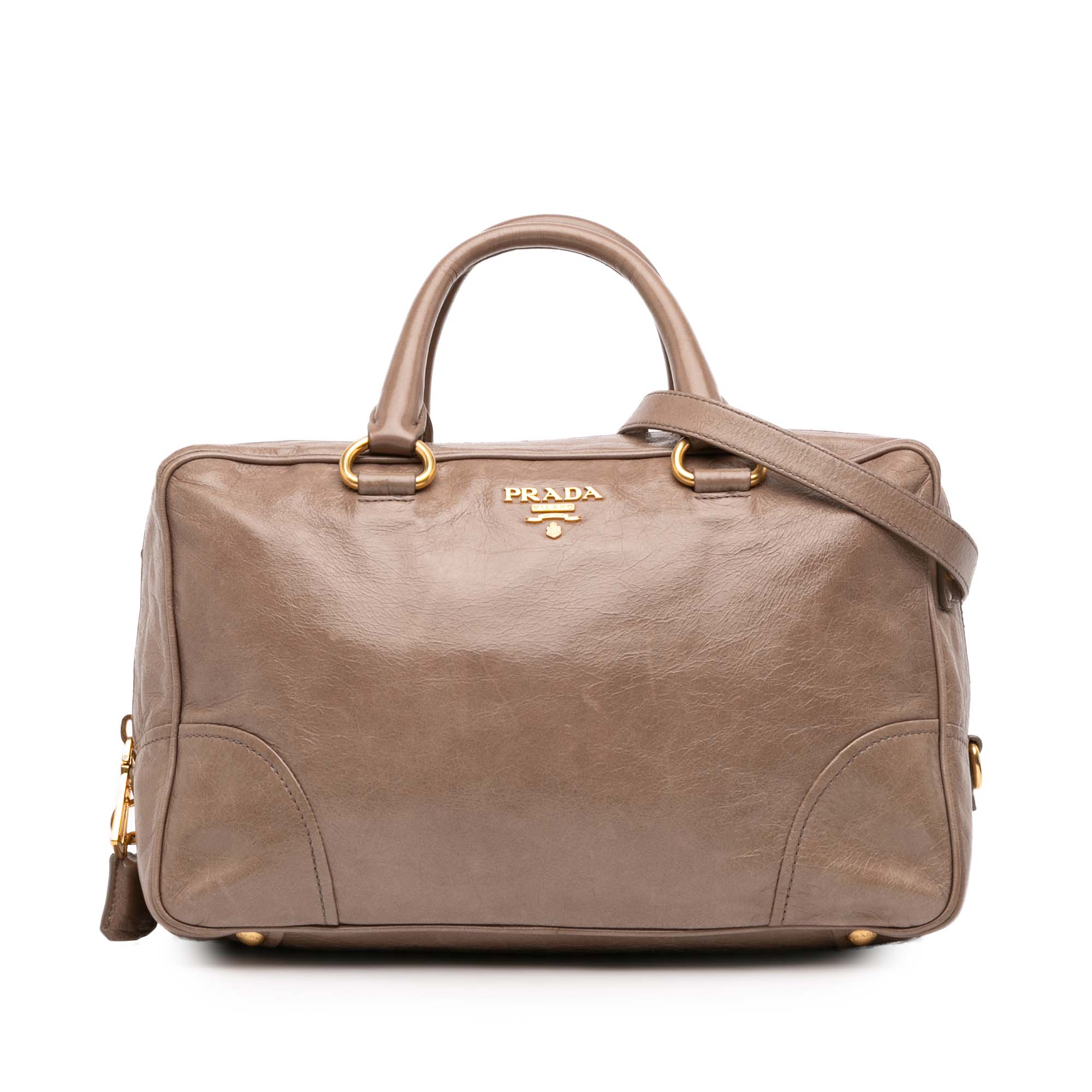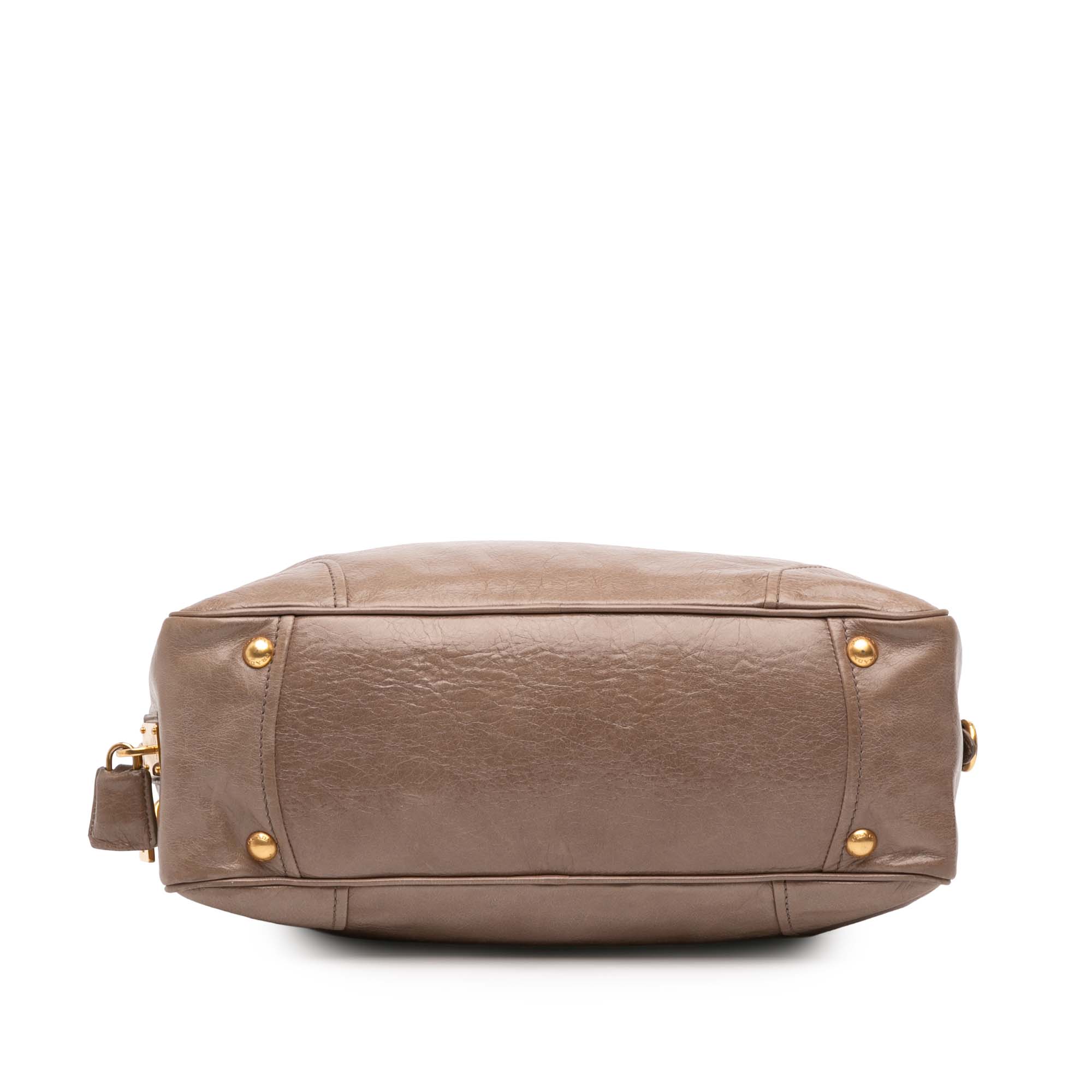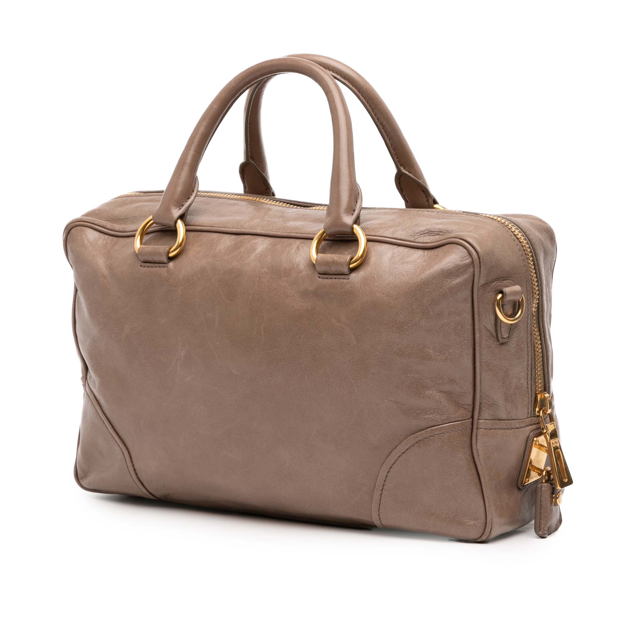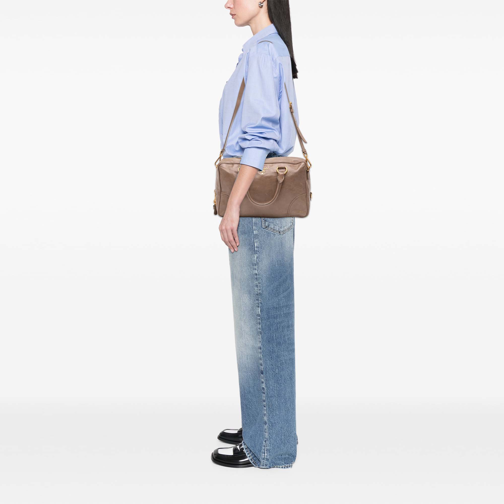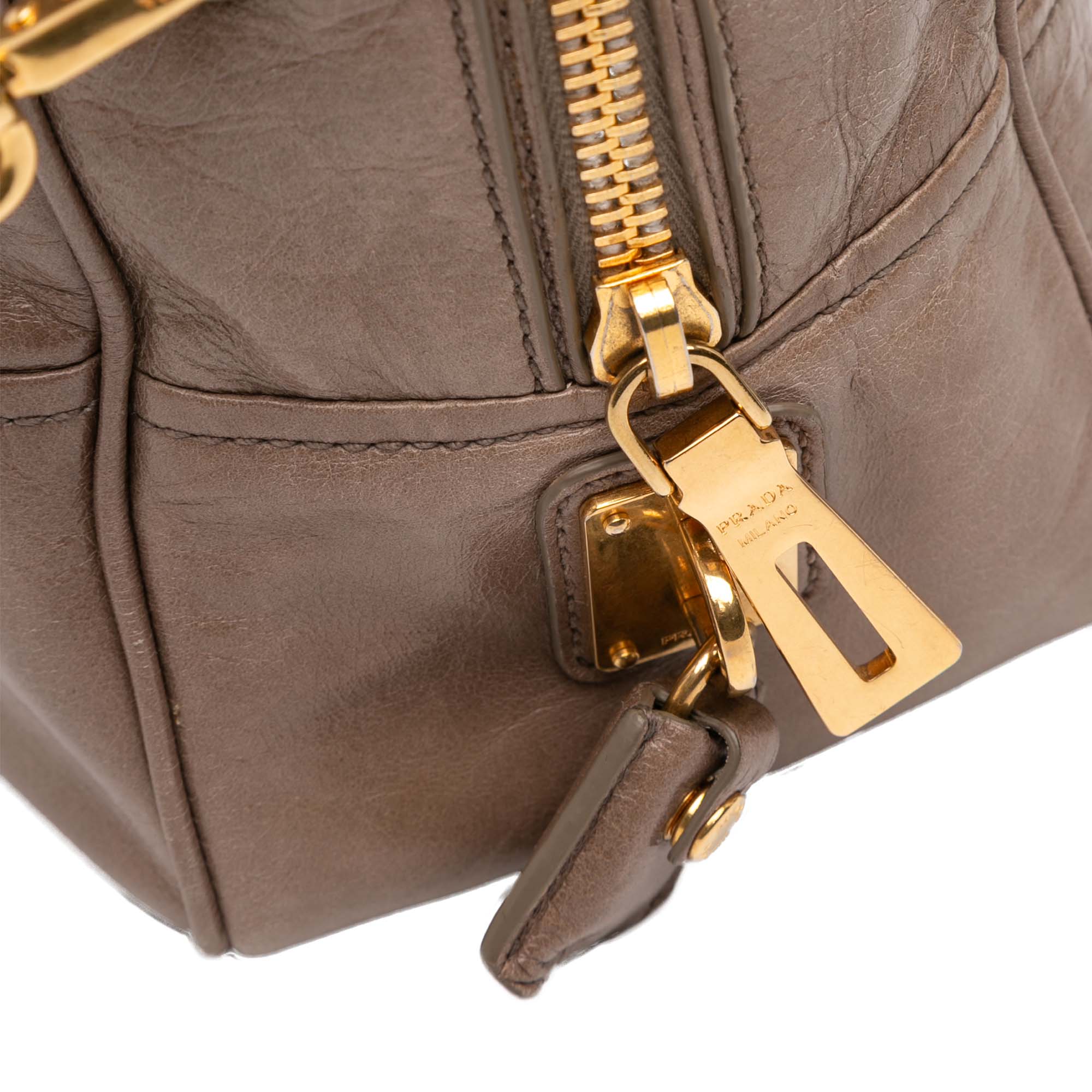 This satchel features a leather body, rolled leather handles, a detachable flat leather shoulder strap, a top zip closure, and interior zip and slip pockets. Retail Price: 1100.00