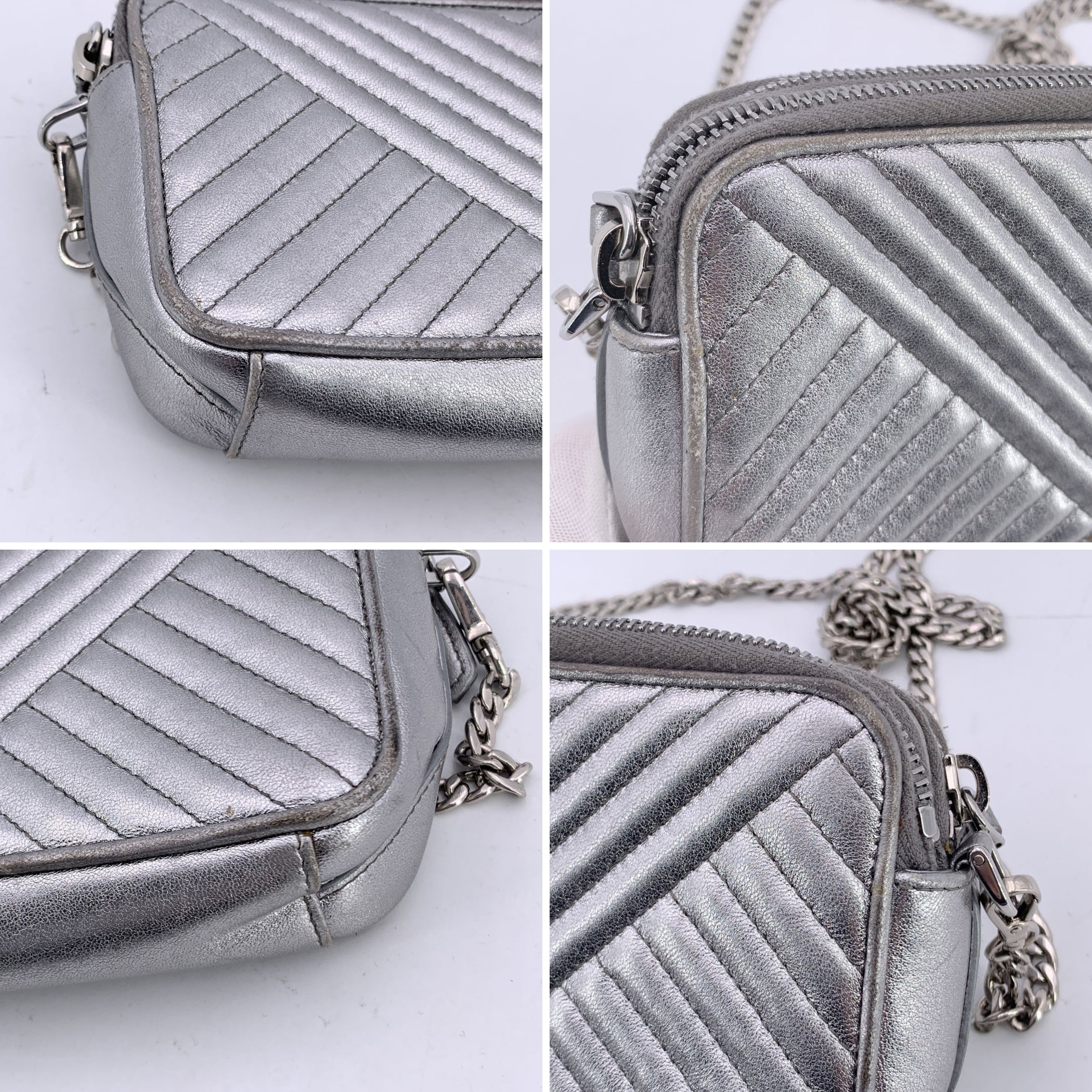 This Beautiful Bag Will Come With a Certificate Of Authenticity Provided By Entrupy. The Certificate Will Be Provided At No Further Cost The Prada Black Diagramme Leather Double Zip Shoulder Bag Is The Epitome Of Refined Elegance And Modern Sophistication. Crafted In Sleek Silver Metal Leather With Stitched Quilting, This Bag Shines With Timeless Luxury. The Iconic Enamelled Prada Triangle Logo On The Front Adds a Bold, Signature Touch, While The Silver-tone Hardware Complements The Bag's Polished, Futuristic Design. The Bag Features Two Zipped Compartments, Each Lined With a Combination Of Textile And Leather, Offering Ample Space For Your Essentials. Inside, You'll Find Three Card Slots In Each Compartment, Allowing You To Stay Organized In Style. The Central Slip Pocket Offers Additional Storage For Items You Want To Keep Separate. With a Removable Chain Shoulder Strap, This Versatile Piece Can Be Worn Over The Shoulder Or Carried As a Chic Clutch. Engraved With 'Prada - Made In Italy' Inside, This Bag Is a Testament To The Brand's Craftsmanship And Timeless Appeal. Perfect For Any Occasion, The Prada Diagramme Woc Wallet On Chain Is As Practical As It Is Beautiful-an Instant Classic.