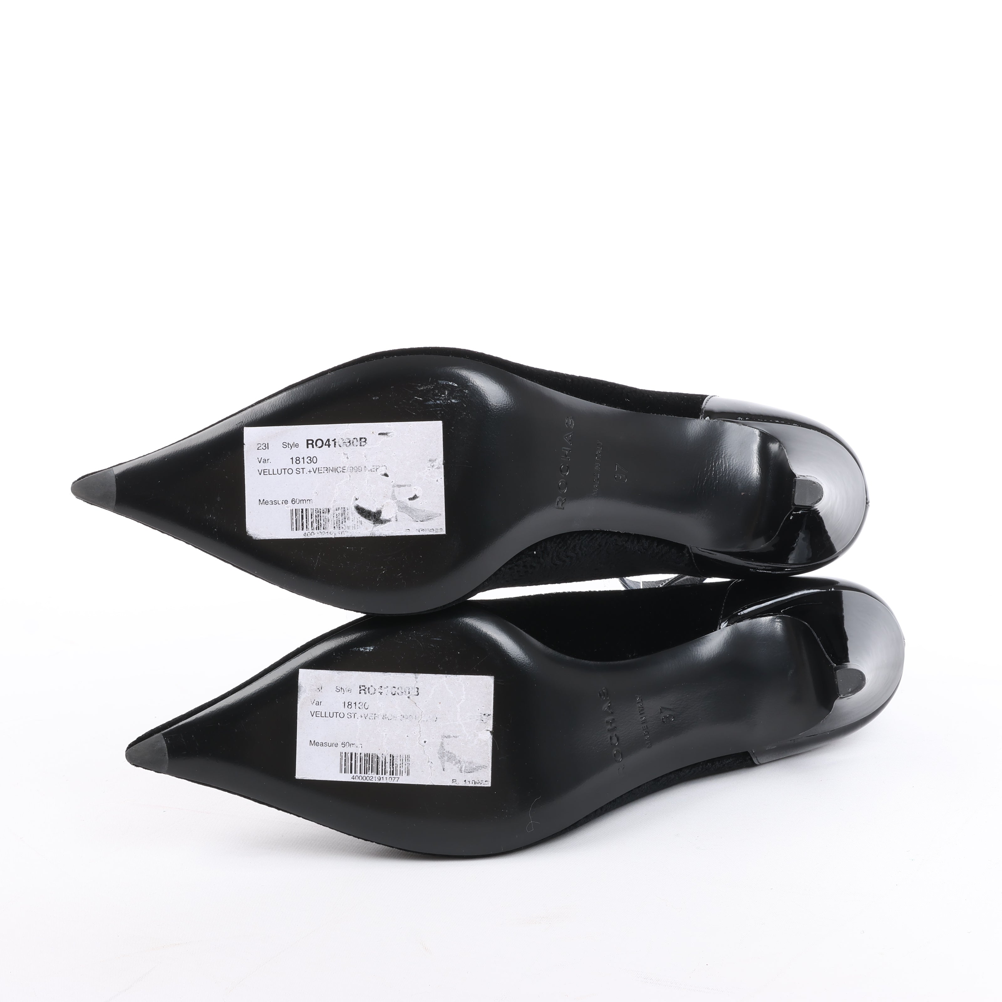 Brand: RochasSize: EU 37Heel Hight: 6 cmCondition: Never wornCondition Details: Just some scratches from trying onMain Colour: BlackColours: -Main material: VelvetMaterials: Patent LeatherProduct Code: -Manufactured In: ItalyComes With: Box