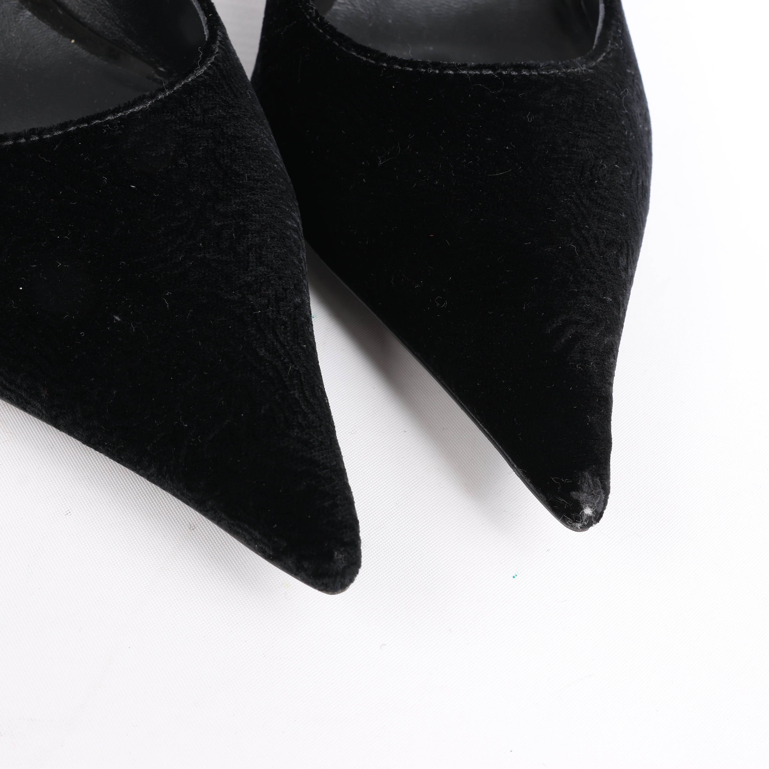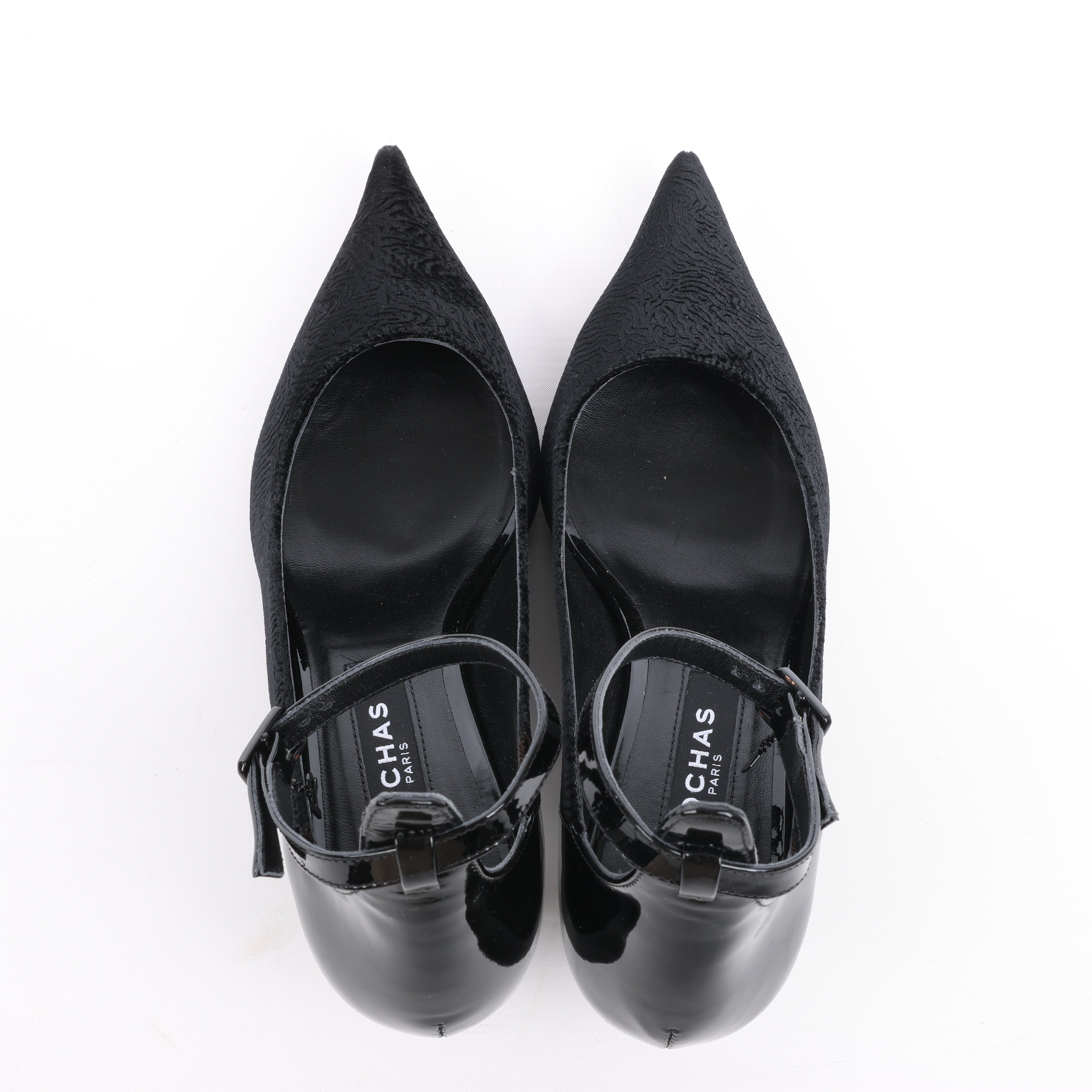 Rochas black pumps in size 37 EU feature a chic mix of velvet and patent leather, a pointed toe, and elegant ankle strap. A sleek kitten heel adds a timeless, feminine finish perfect for sophisticated day-to-night transitions.