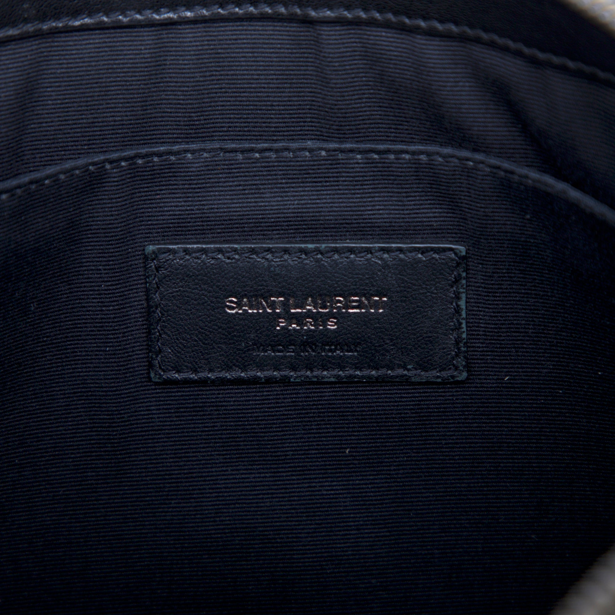 This clutch bag features a canvas body with leather trim, a detachable flat leather wrist strap, a top zip closure, and an interior slip pocket. Inclusion: Dust bag, box. Retail Price: 850.00