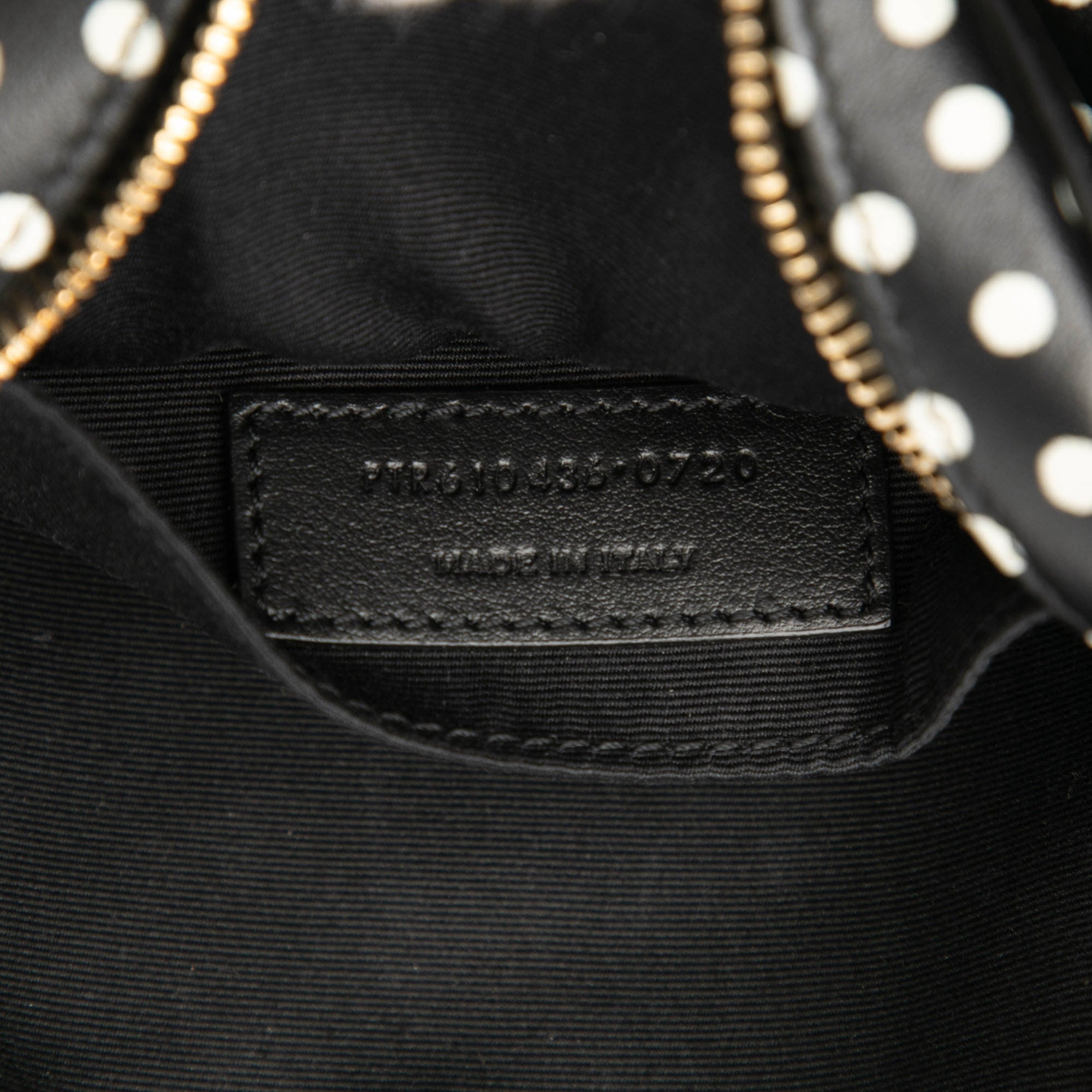 This crossbody bag features a quilted leather body with polka dot details, a chain link and leather shoulder strap, a top zip closure and an interior slip pocket. Retail Price: 1895.00