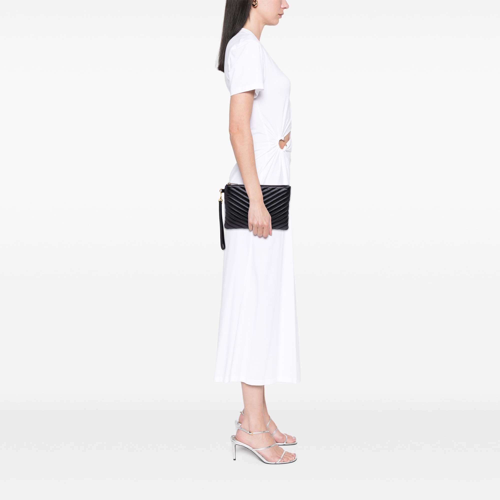 This clutch bag features a quilted leather body, a detachable flat leather wrist strap, a top zip closure, and interior slip pockets. Retail Price: 730.00
