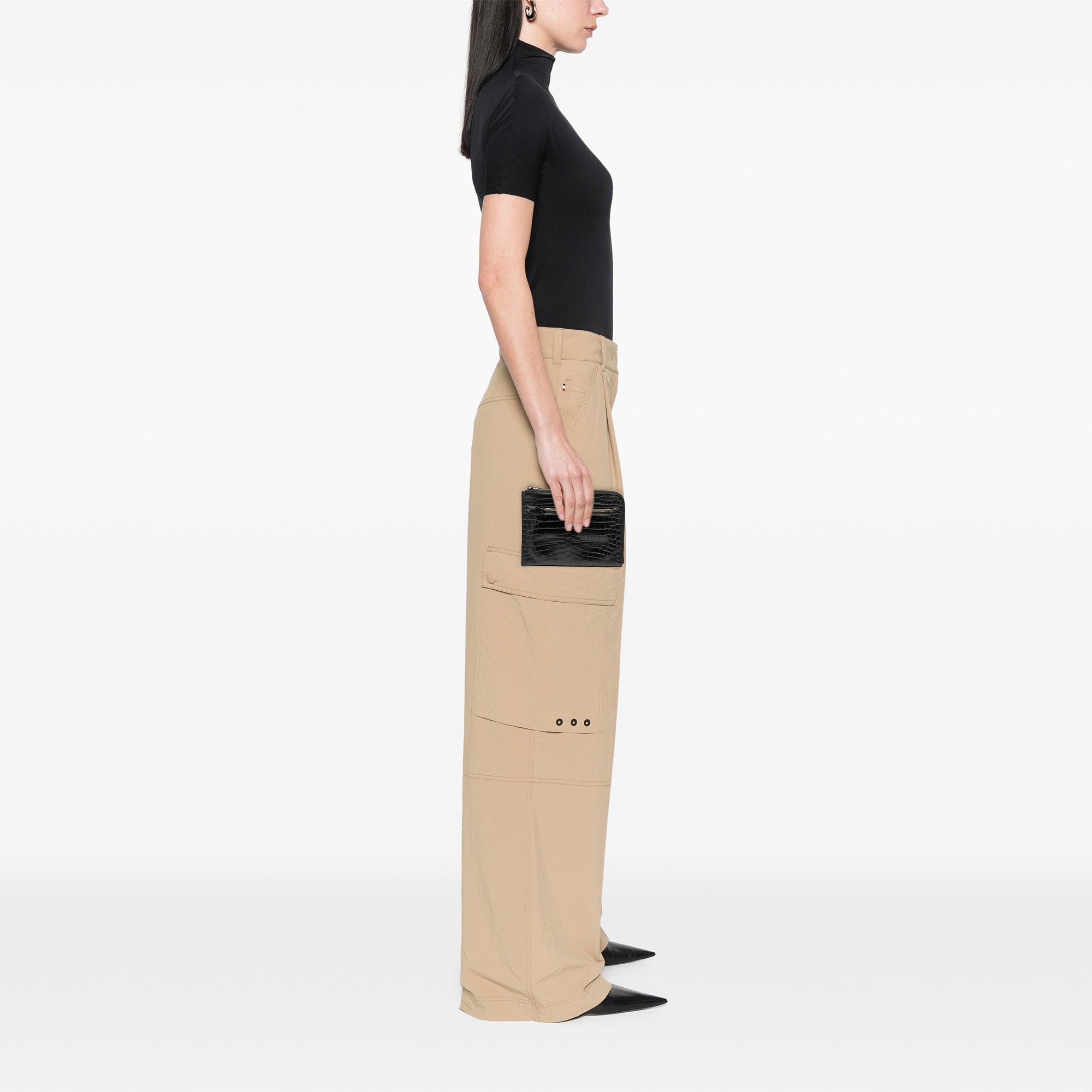 This clutch bag features a croc embossed leather body, a top zip closure, an exterior zip pocket, and interior slip pockets. Retail Price: 900.00