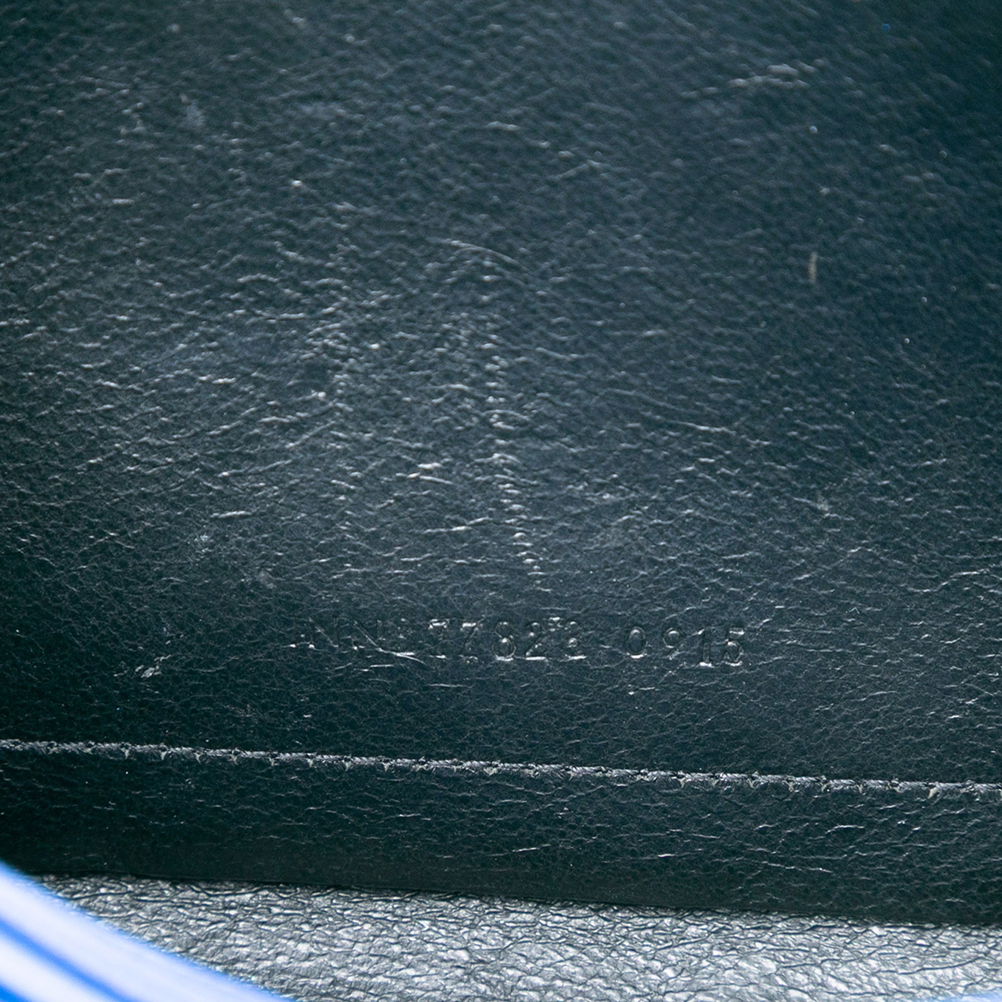 This wallet on chain features a leather body, a detachable chain link shoulder strap, a front flap with snap fastener button closure, an interior zip compartment, and an interior open compartment with card slots. Retail Price: 1100.00