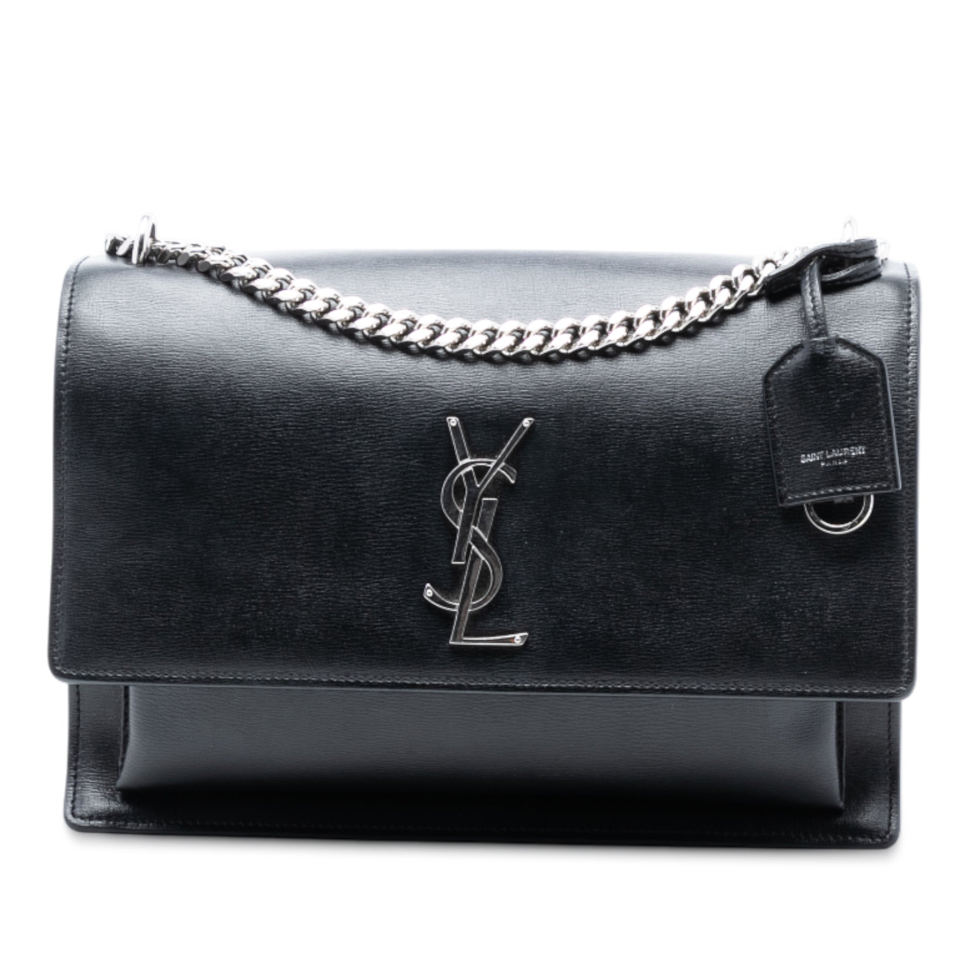 The Sunset features a leather body, a chain link shoulder strap with leather guard, a top flap with magnetic snap button closure, an exterior front open pocket, two interior compartments, and an interior slip pocket. Retail Price: 2700.00