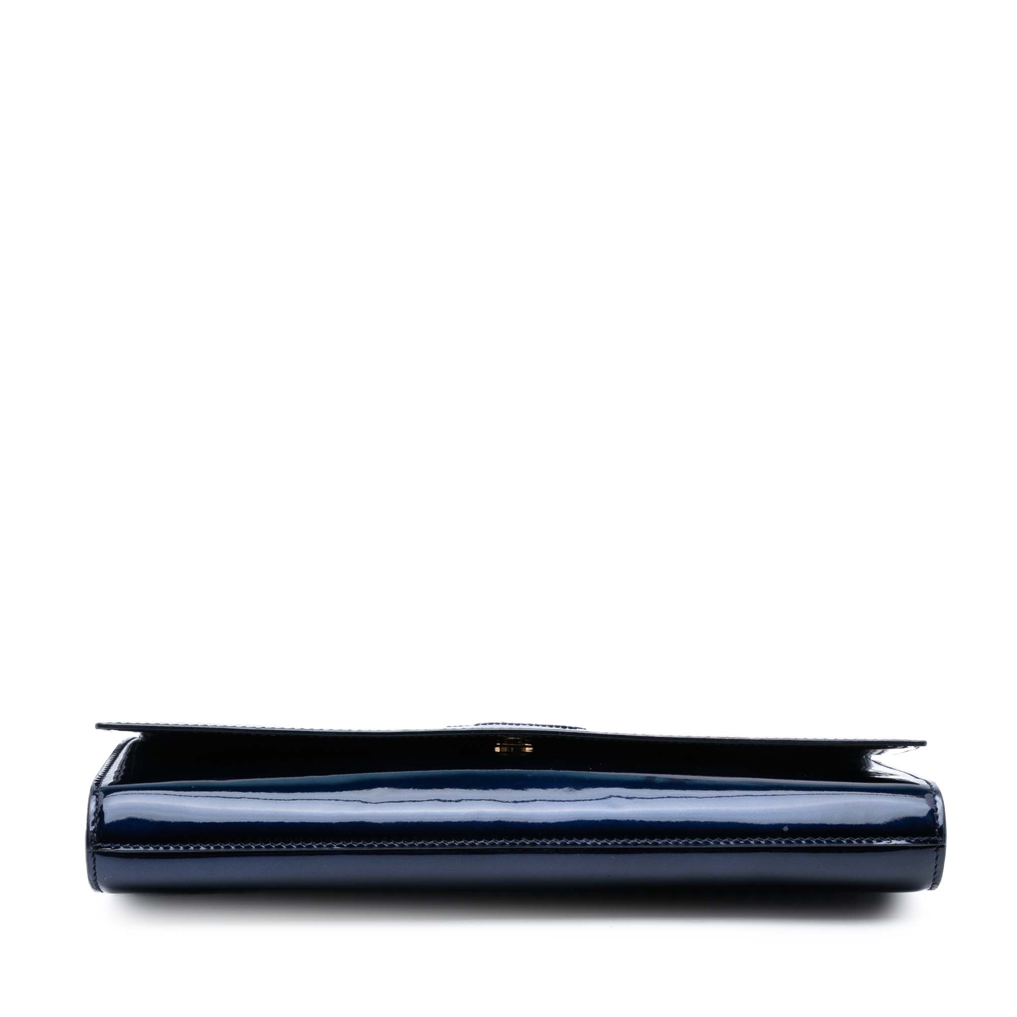 The Belle de Jour Clutch features a patent leather body, a front flap with magnetic snap closure, and an interior slip pocket. Retail Price: 995.00