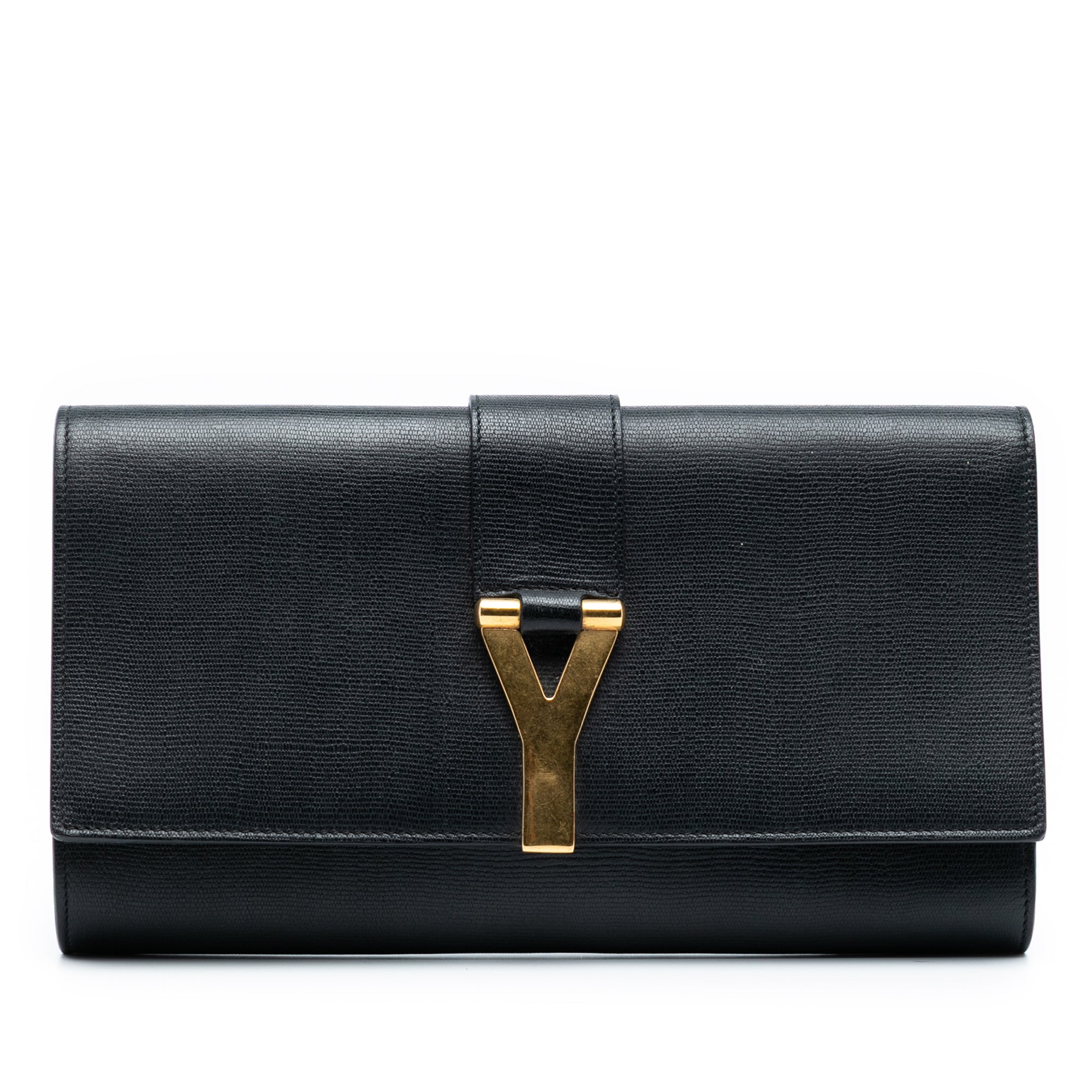 The Chyc Ligne Clutch features a leather body, a front flap with gold-tone Y hardware, and an interior slip pocket. Retail Price: 995.00