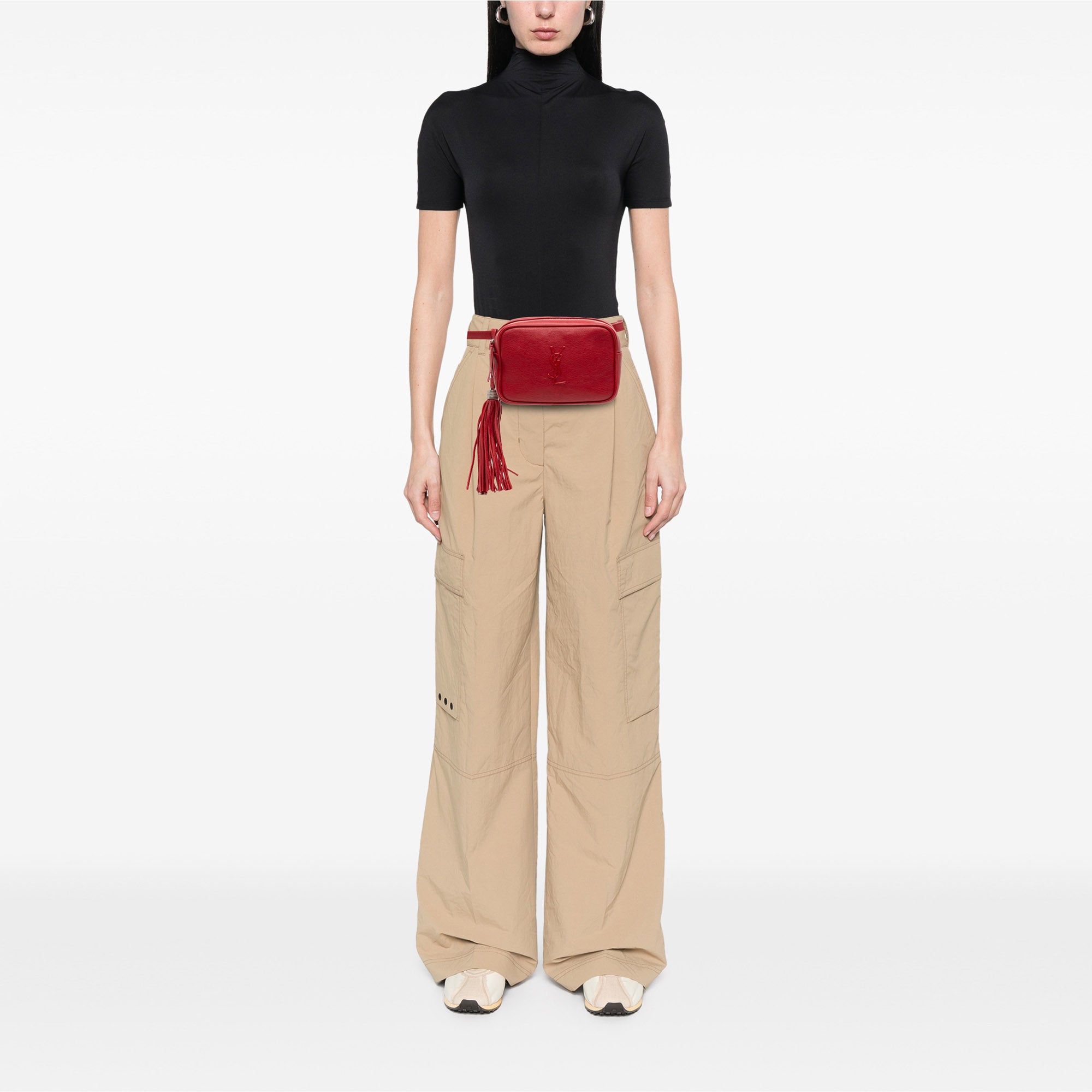 The Lou belt bag features a leather body, an adjustable flat leather waist strap, a top zip closure, an exterior zip pocket, and interior slip pockets. Inclusion: Dust bag. Retail Price: 1200.00