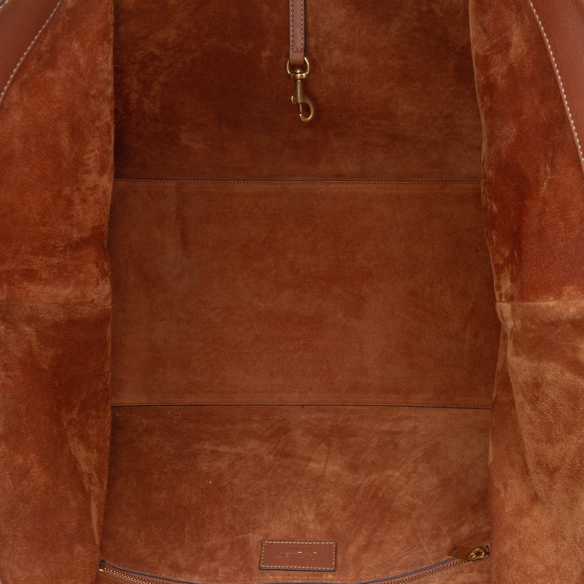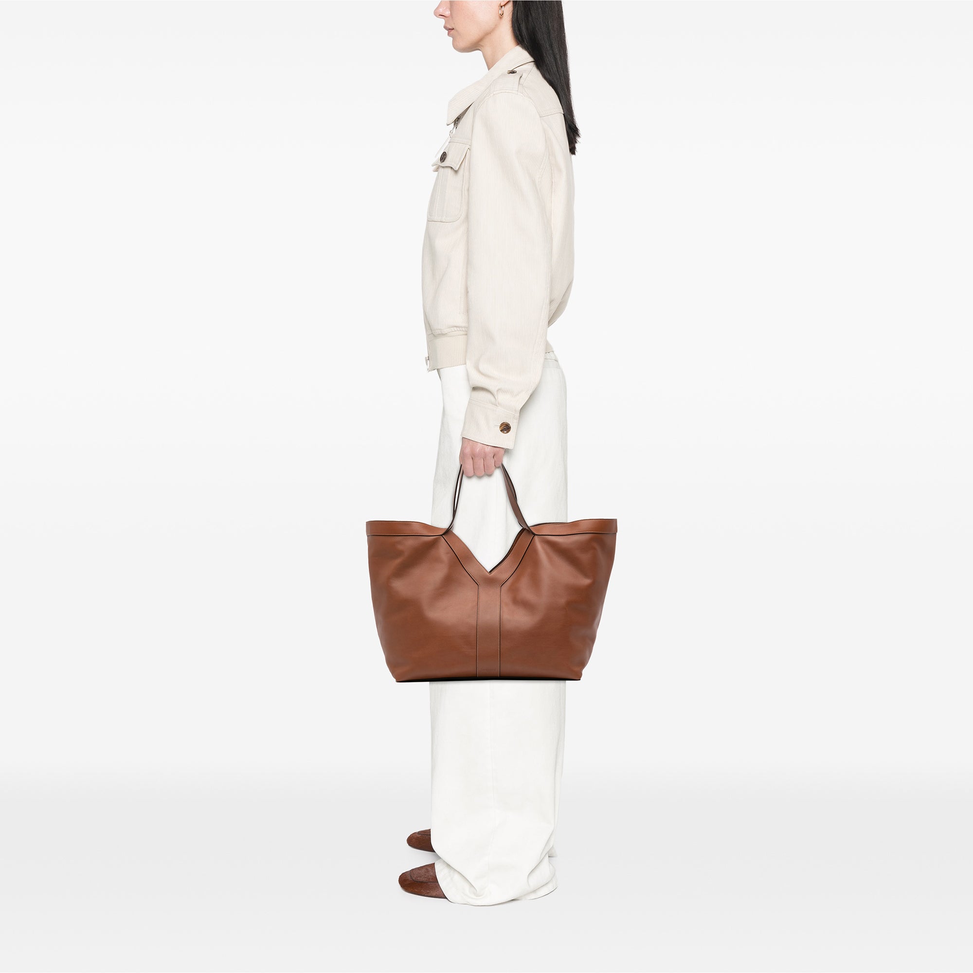 The Y Tote features a leather body, flat straps, an open top with hook closure, and an interior zip pocket. Inclusion: Dust bag. Retail Price: 4300.00