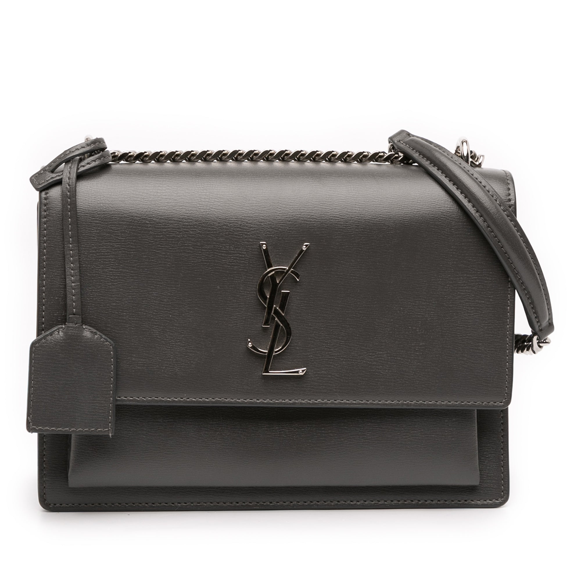 The Sunset features a leather body, a curb chain link shoulder strap with leather guard, a flap with magnetic snap button closure, an under flap open pocket, two interior compartments, and an interior slip pocket. Inclusion: Dust bag. Retail Price: 2700.00