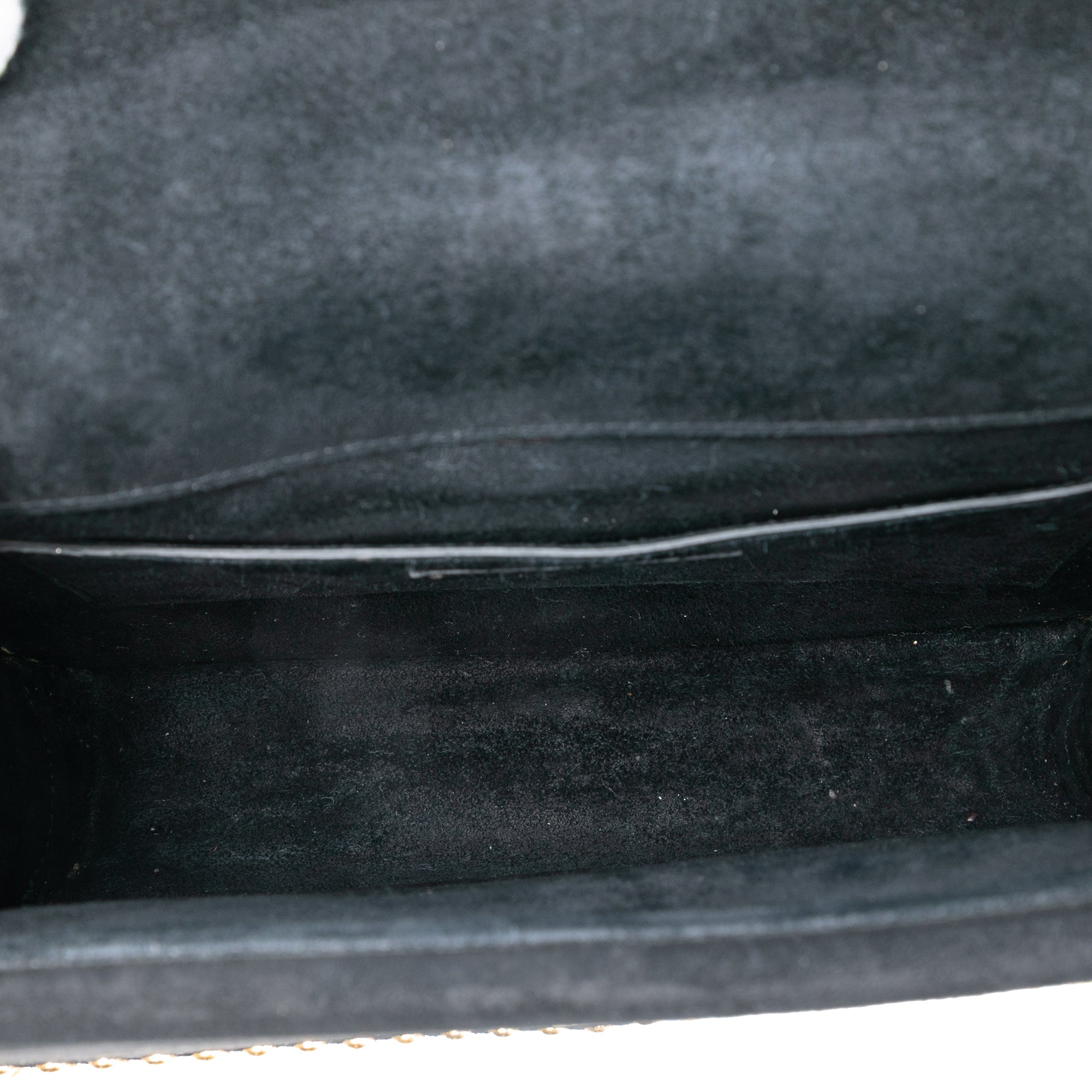 This crossbody bag features a studded suede leather body, a chain-link strap with leather shoulder guard, a front flap with magnetic snap closure, and an interior slip pocket. Retail Price: 3100.00