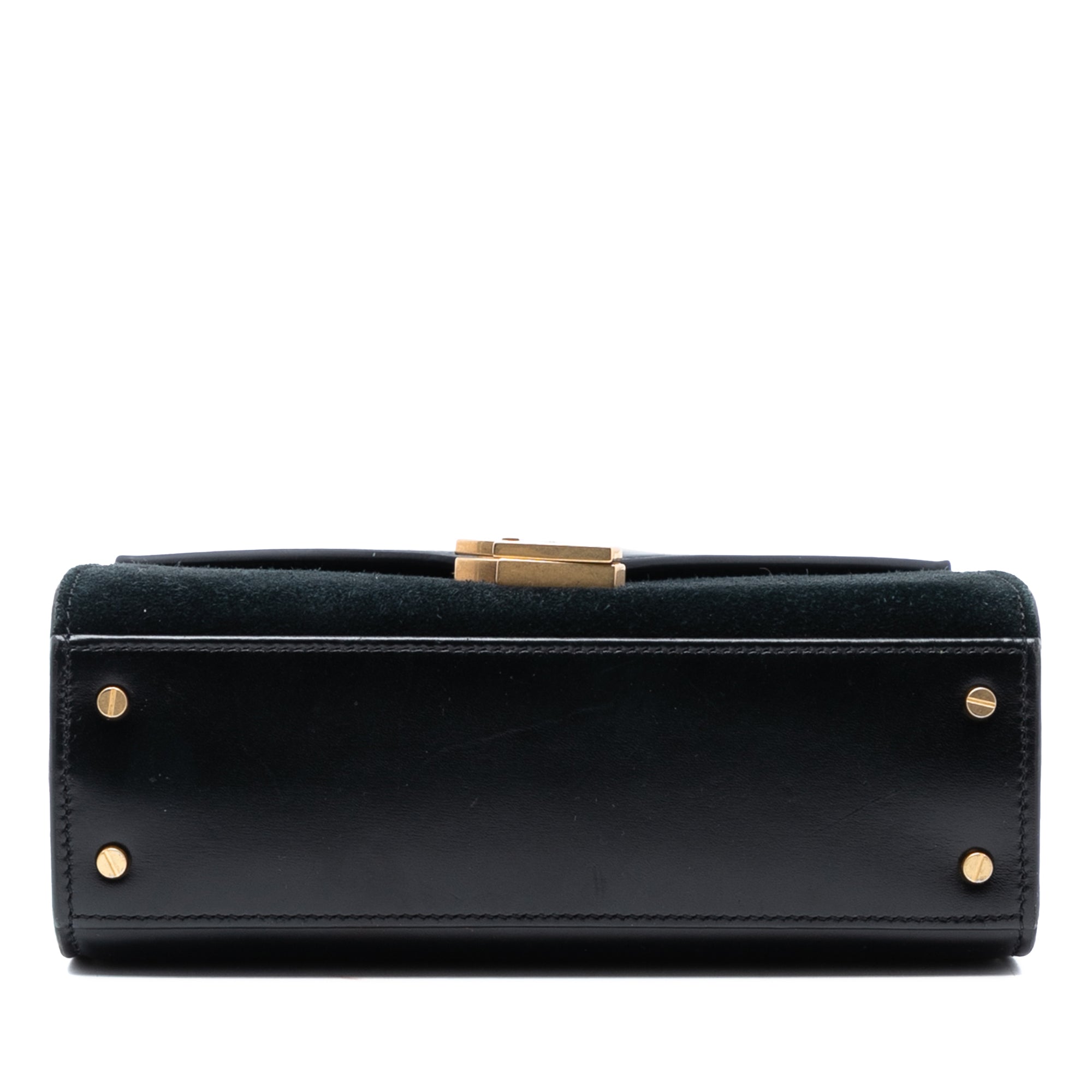 The Cassandra Top Handle bag features a suede and calf leather body, a flat leather top handle, a detachable leather strap, a printed front flap with magnetic closure, two interior open compartments, and an interior slip pocket. Retail Price: 2890.00