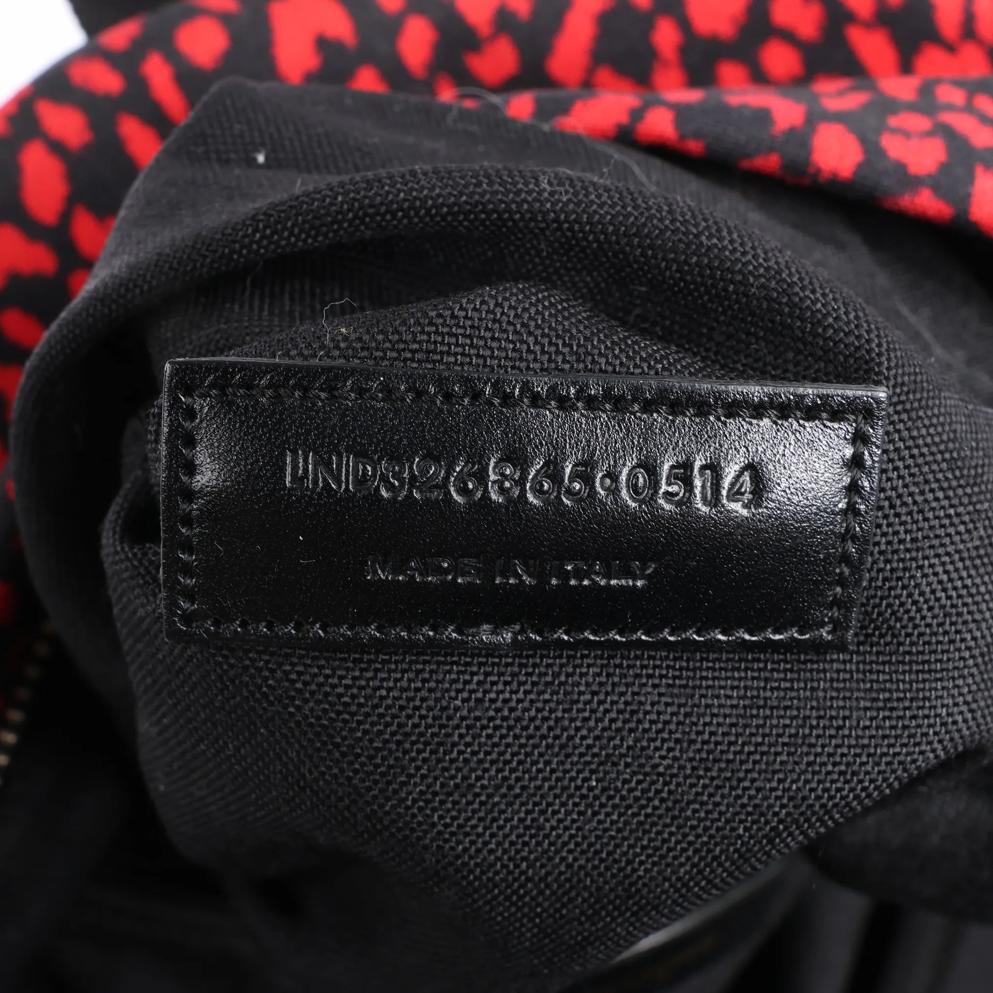 Make a bold statement with the Saint Laurent Paris Leopard Hunting Backpack 326865, crafted in red and black leopard-print canvas with black leather trim. This edgy piece blends high-fashion flair with functional design for standout everyday wear.