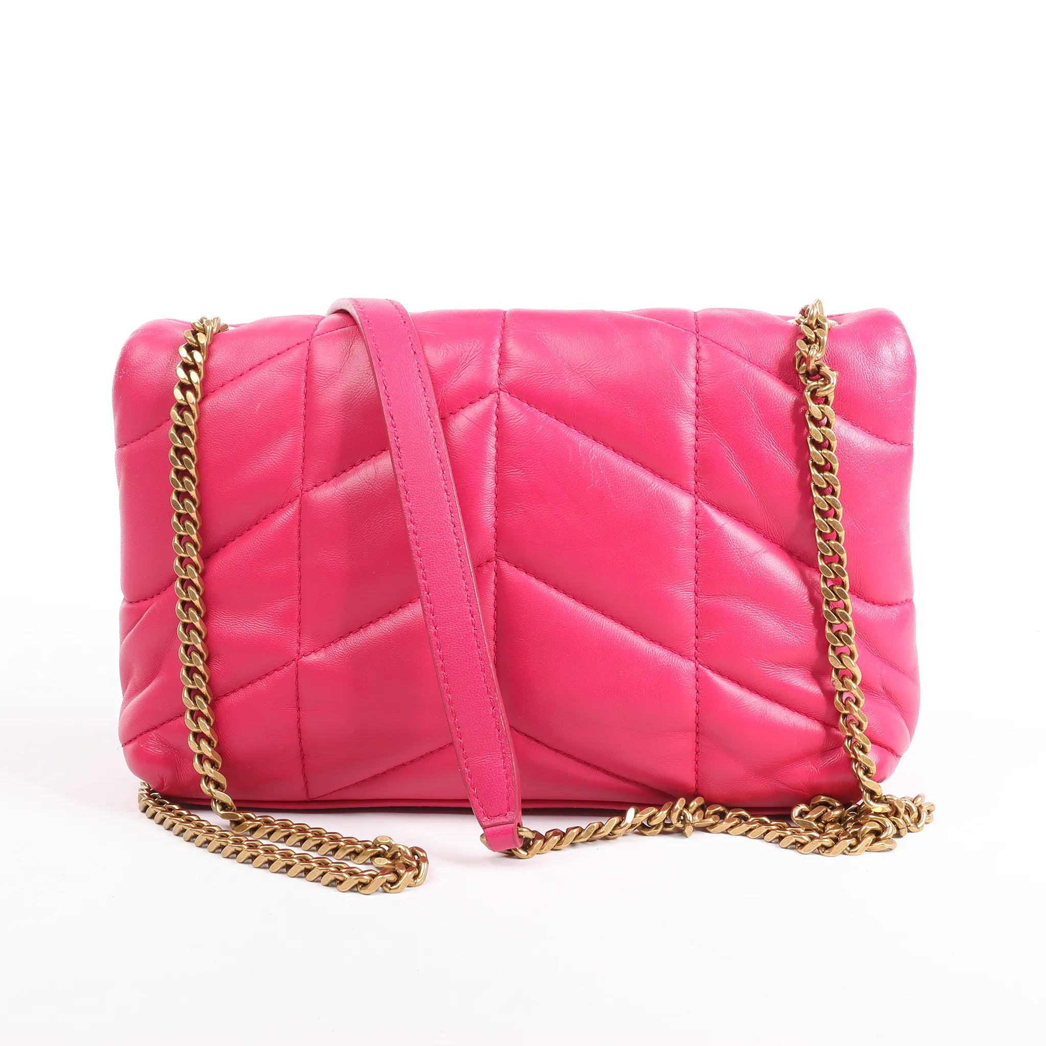 Elevate your look with the Saint Laurent Paris Loulou Puffer 620333 in vibrant pink. Made from supple quilted lambskin leather, this eye-catching chain shoulder bag delivers bold elegance with signature YSL gold-tone hardware.