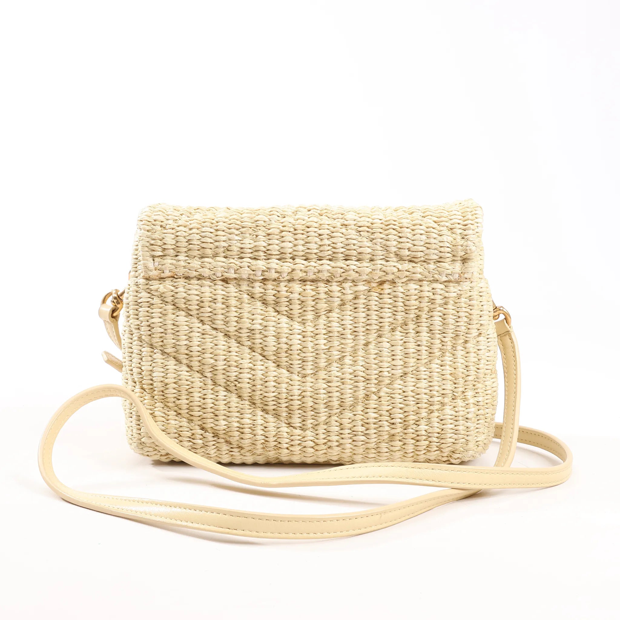 The Saint Laurent Paris Loulou Crossbody Bag 467072 in beige raffia and leather brings chic summer vibes with its iconic YSL logo and lightweight woven texture - perfect for warm-weather style.