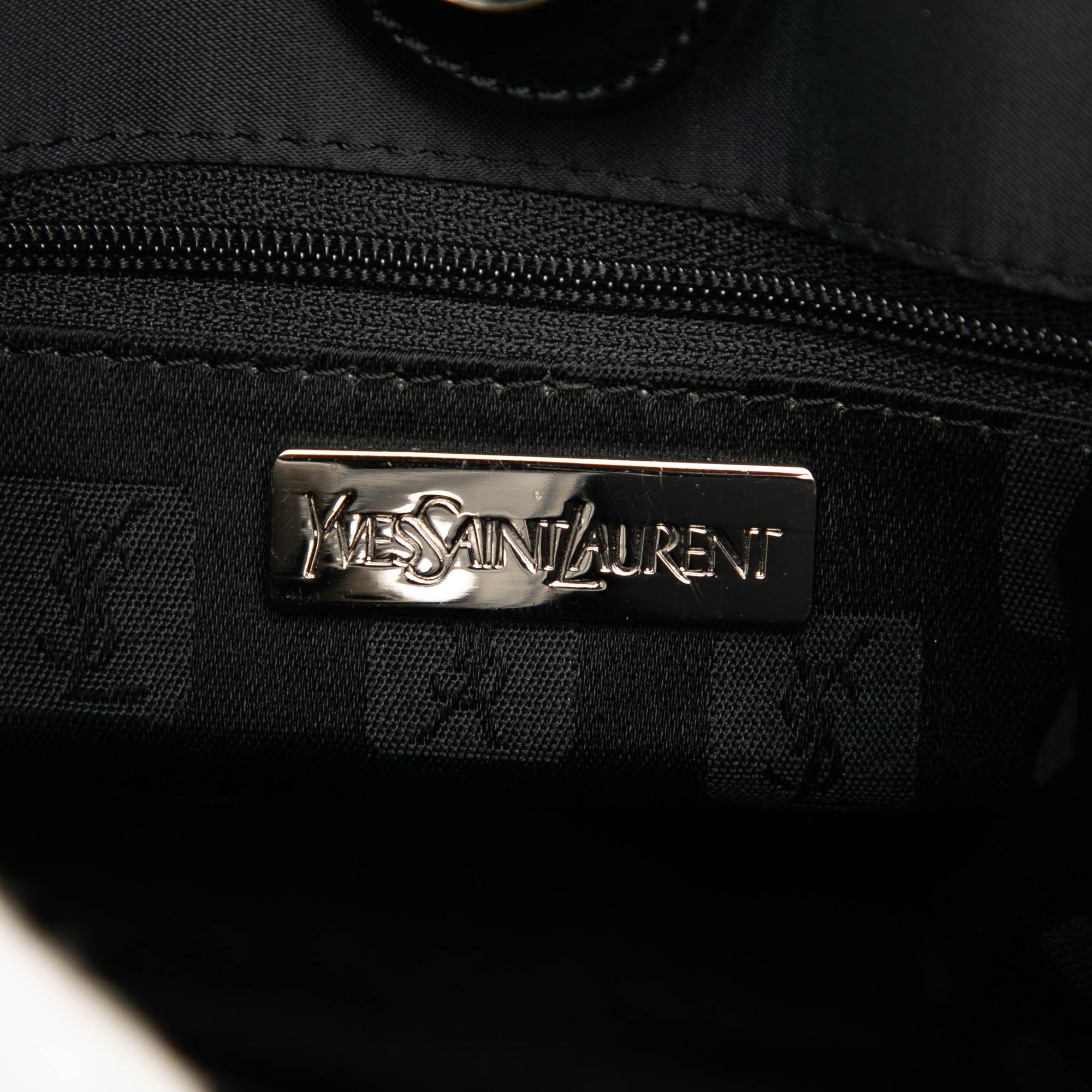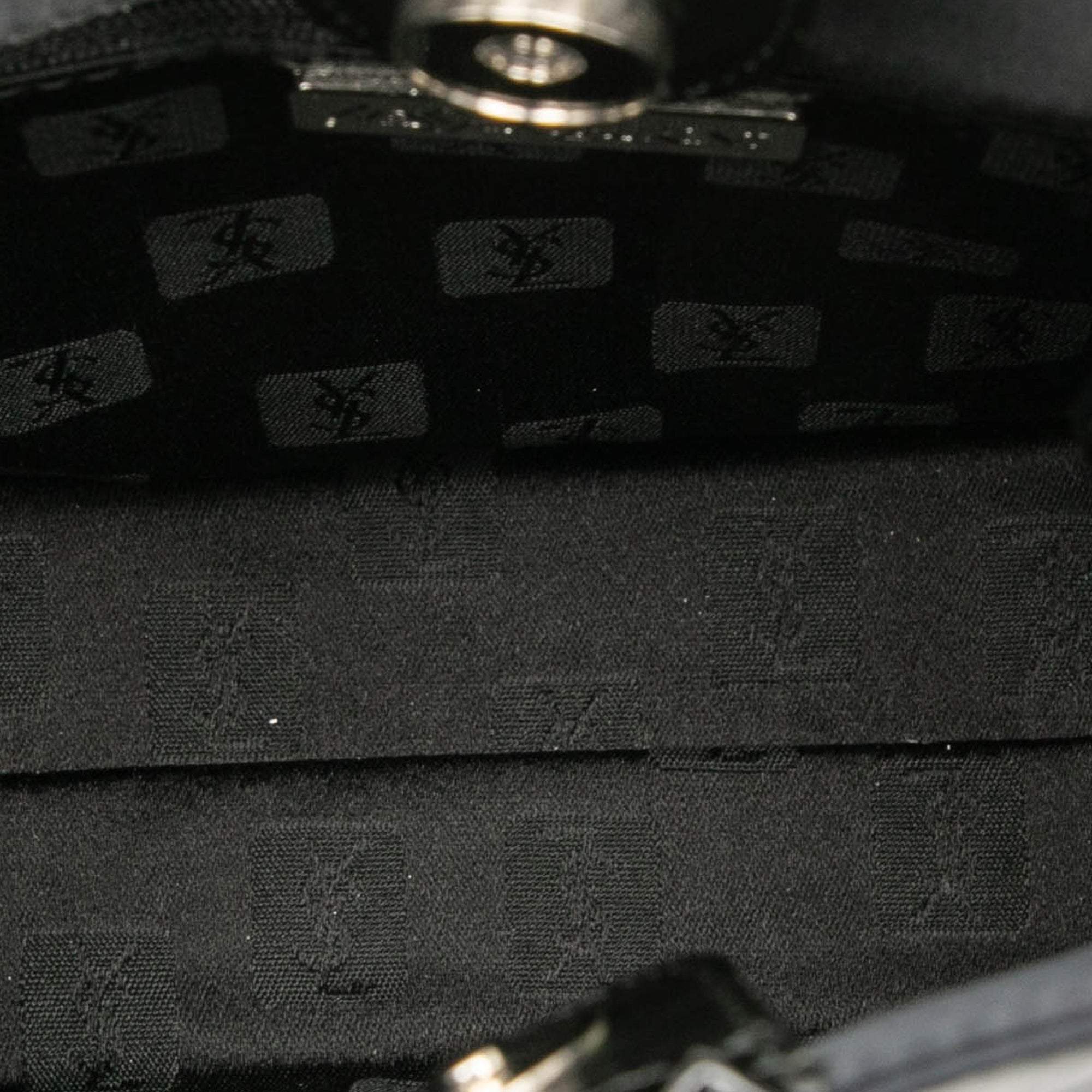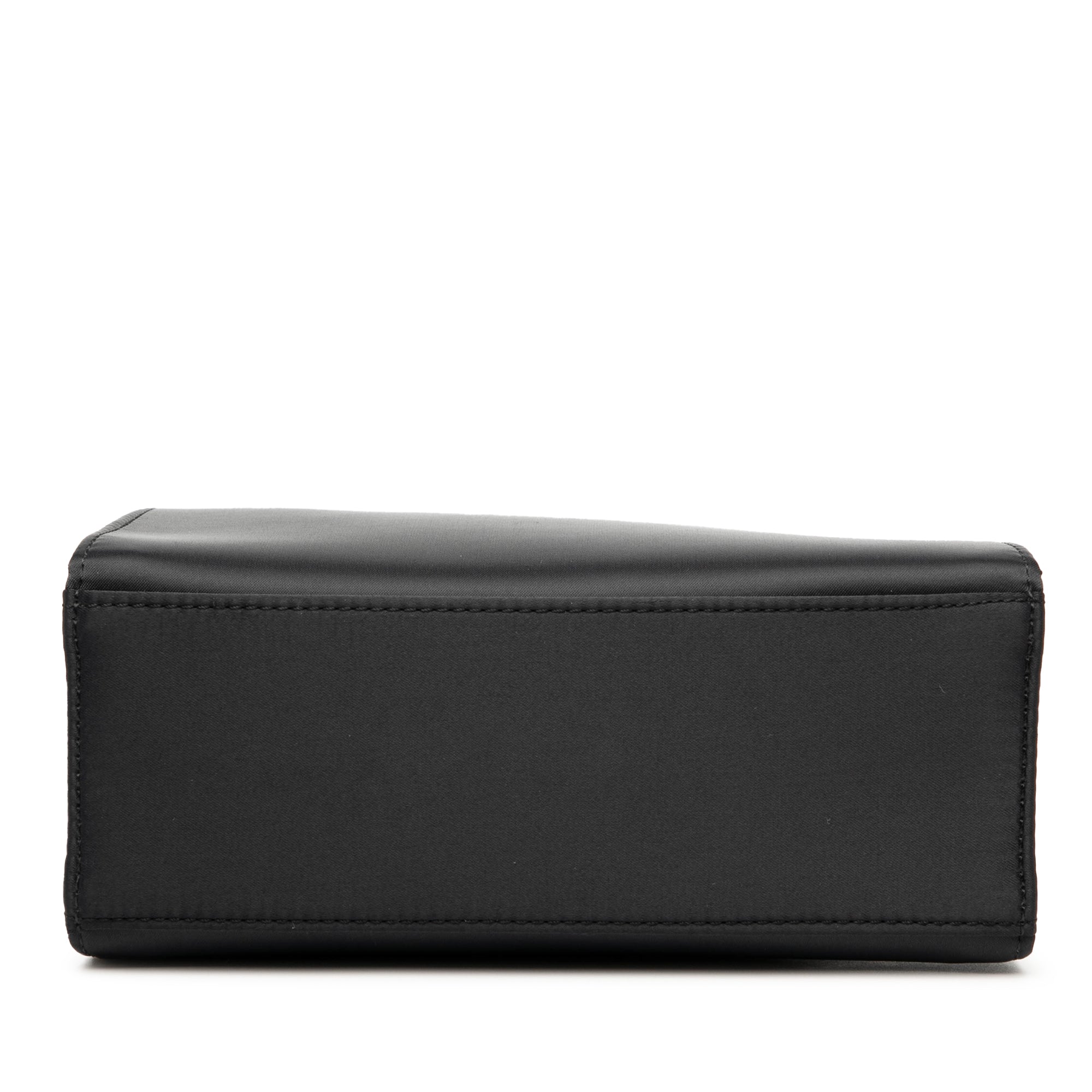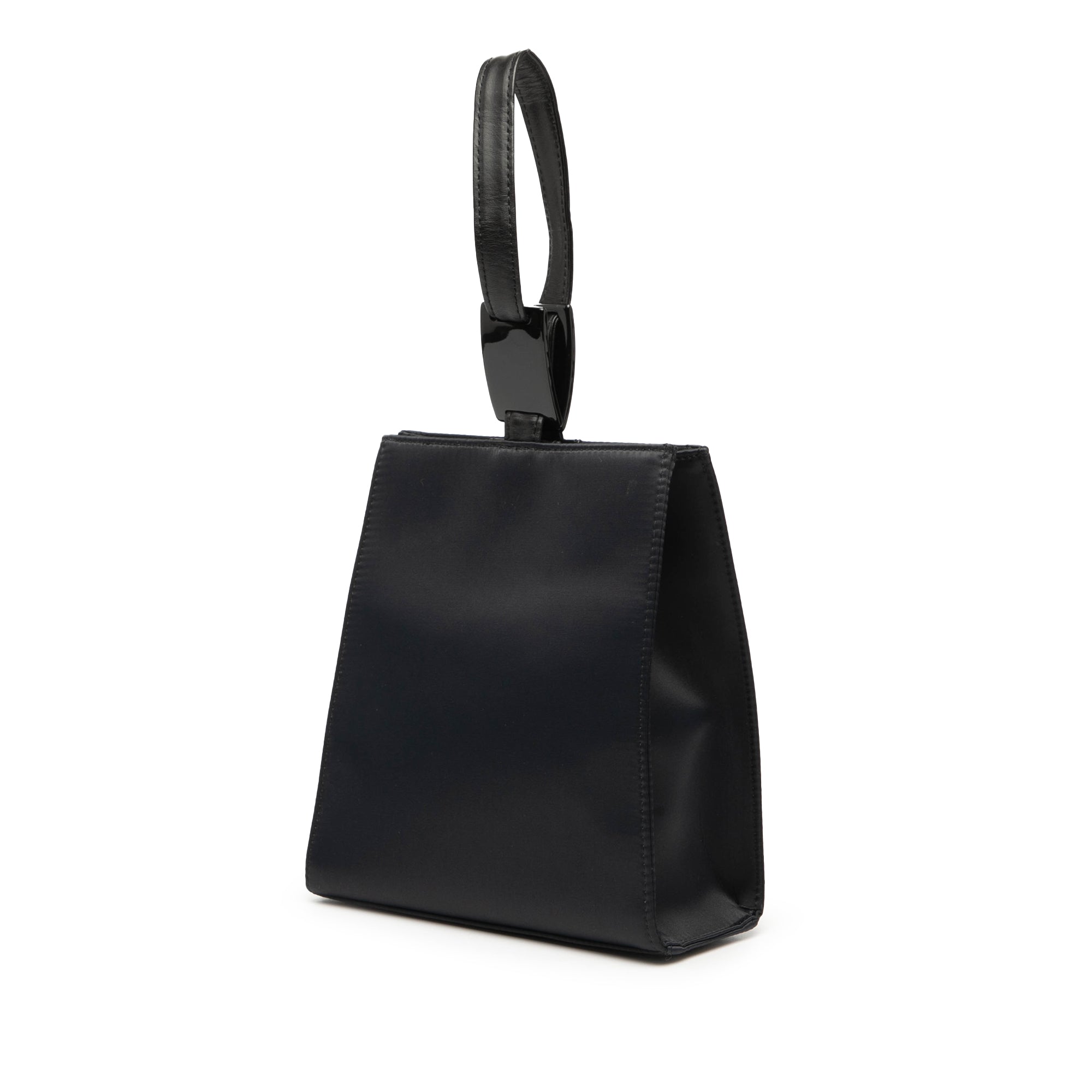 This handbag features a satin body, a flat leather top handle, an open top with magnetic snap closure, and an interior zip pocket. Retail Price: 675.00