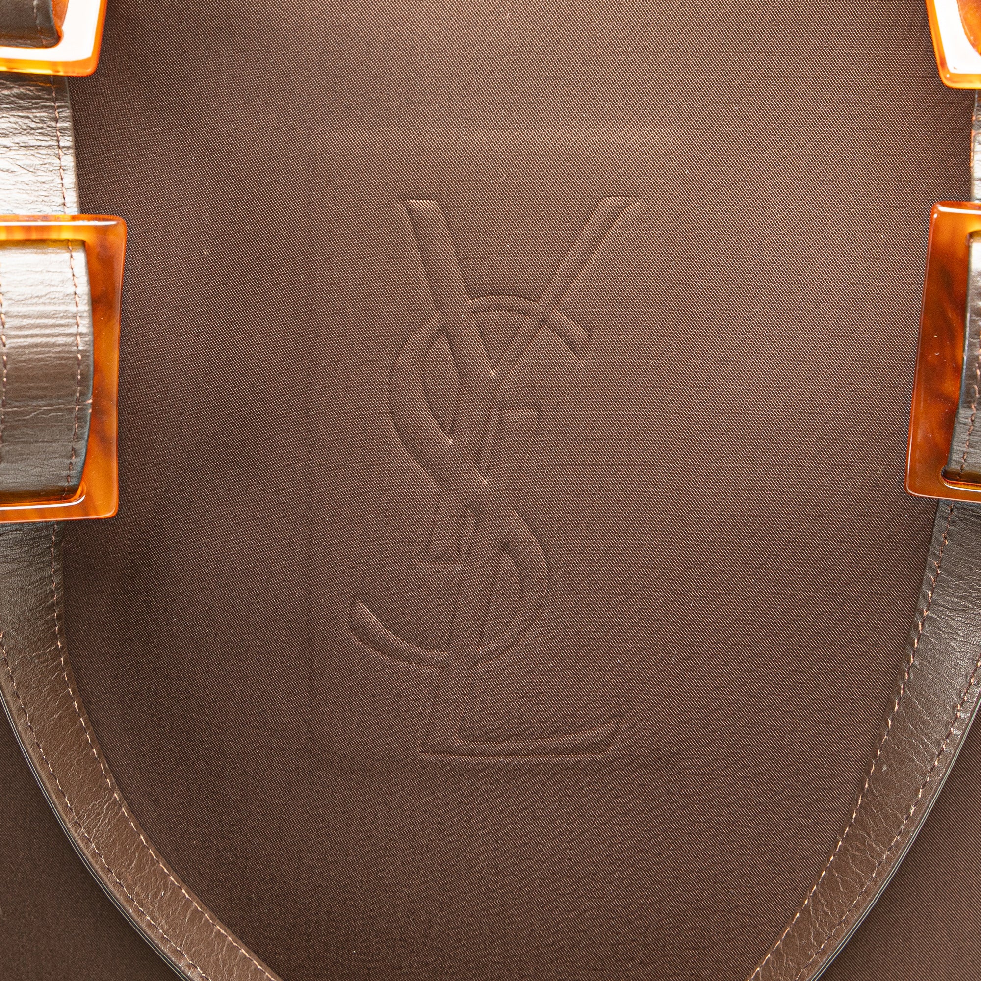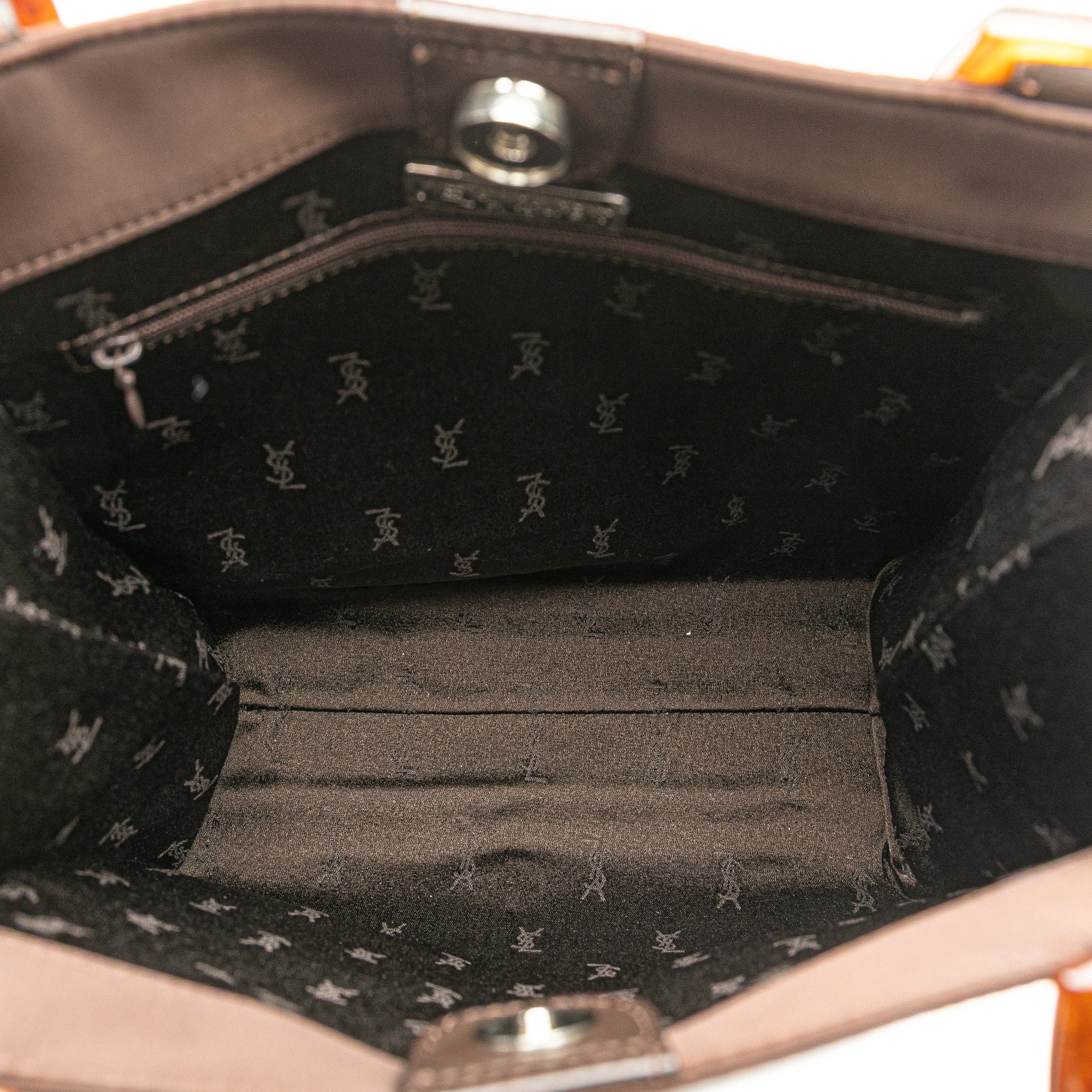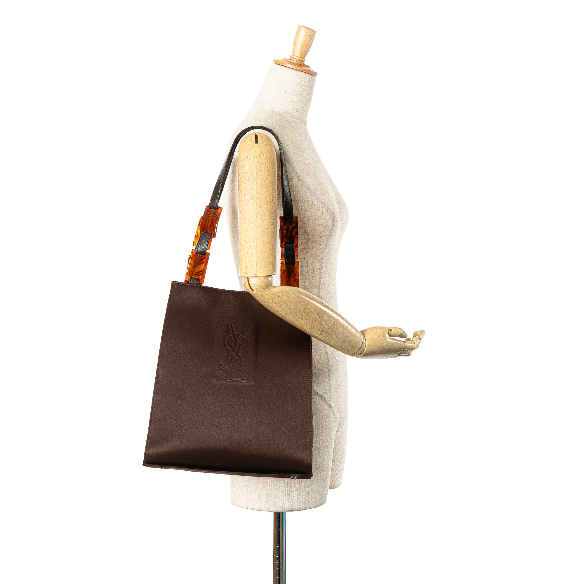 This tote features a satin body, flat leather straps with resin, an open top with magnetic closure, and an interior zip pocket. Retail Price: 450.00