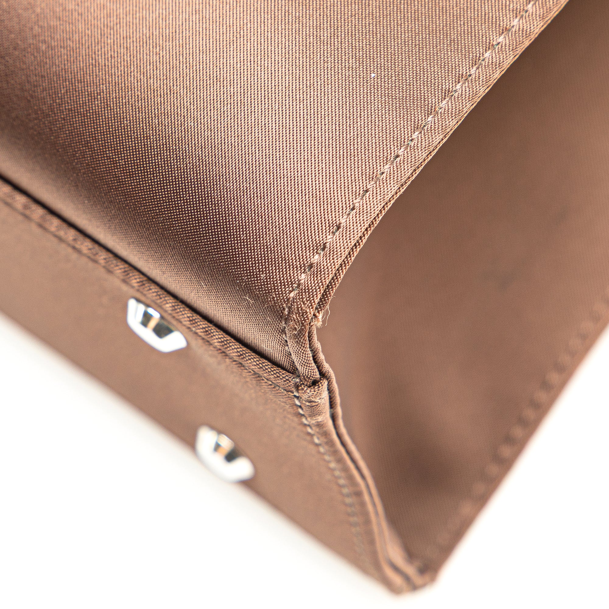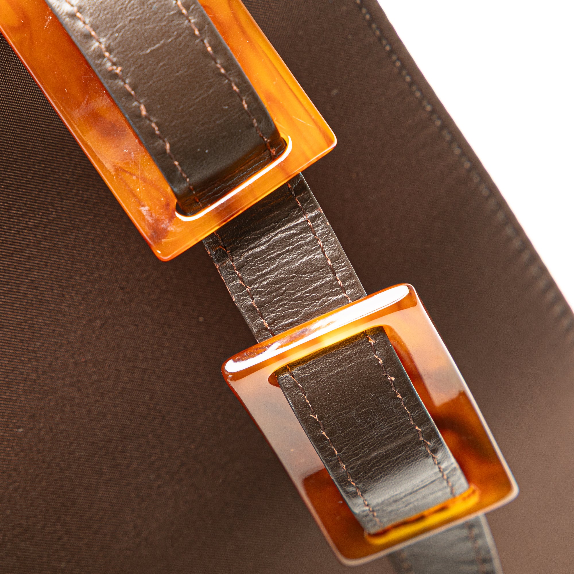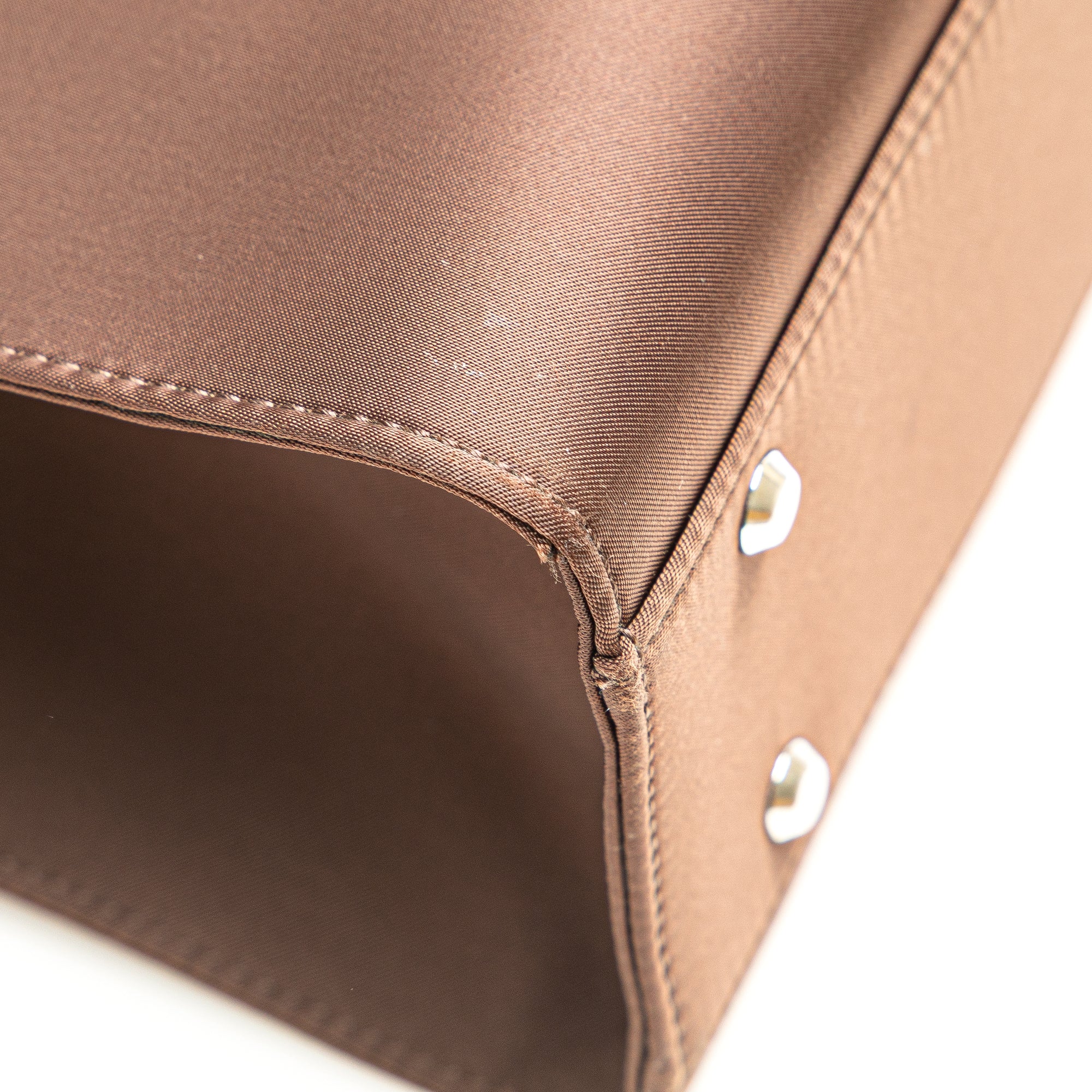 This tote features a satin body, flat leather straps with resin, an open top with magnetic closure, and an interior zip pocket. Retail Price: 450.00