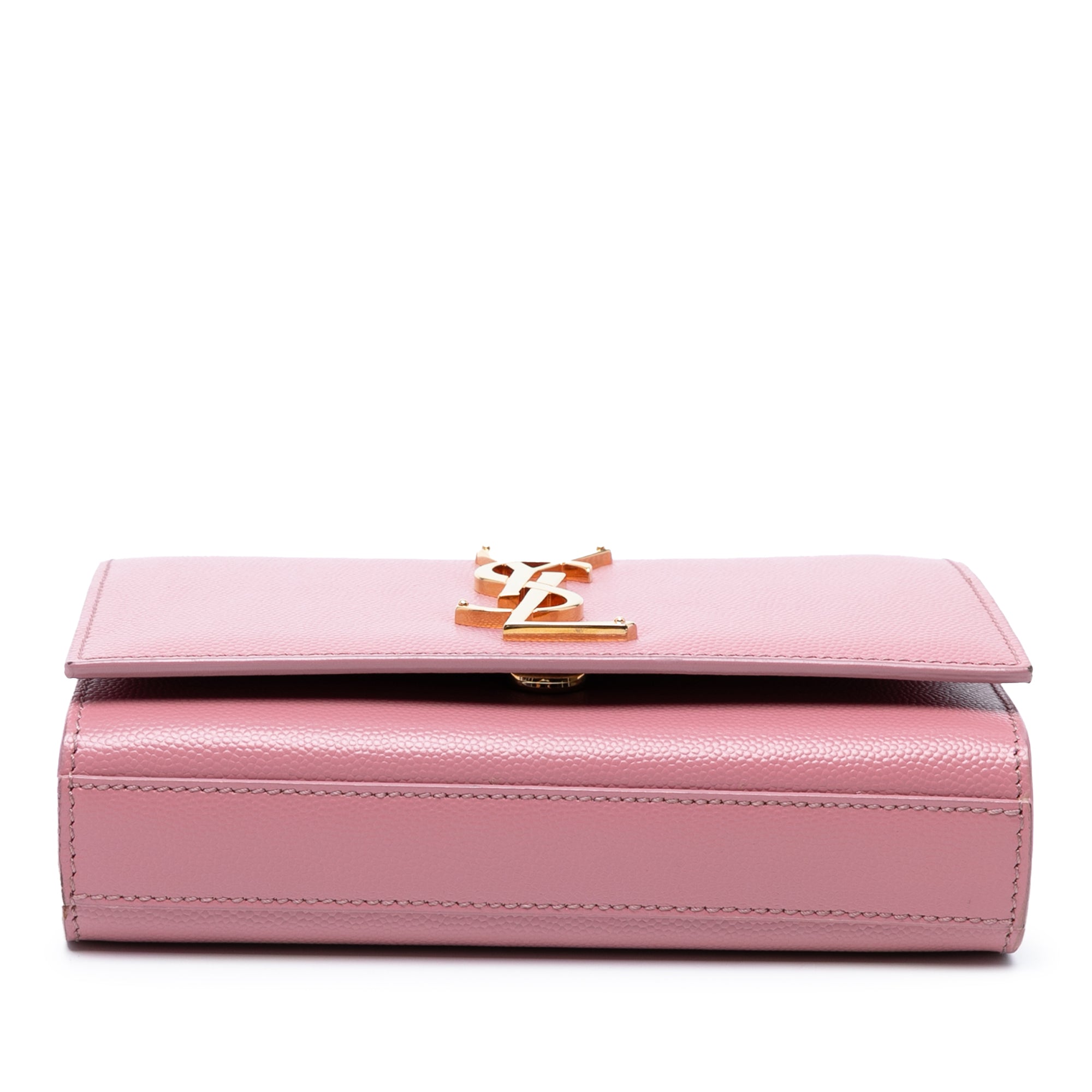 The Kate crossbody bag features a leather body, a gold-tone chain link shoulder strap, a front flap with a metal YSL logo and magnetic closure, and an interior slip pocket. Inclusion: Dust bag. Retail Price: 2400.00