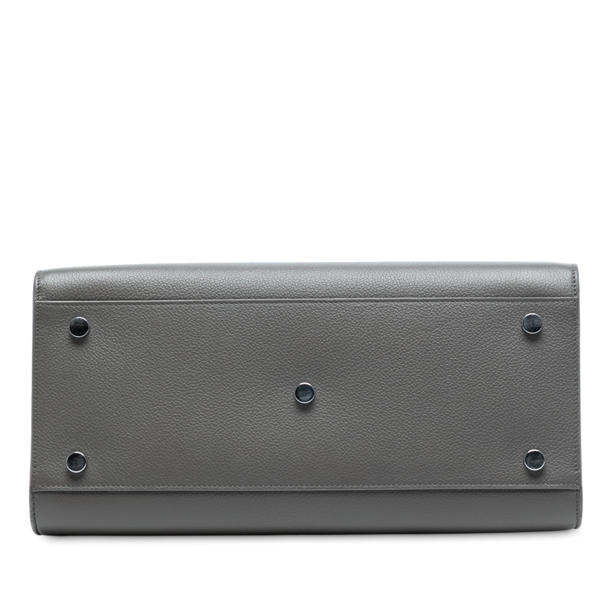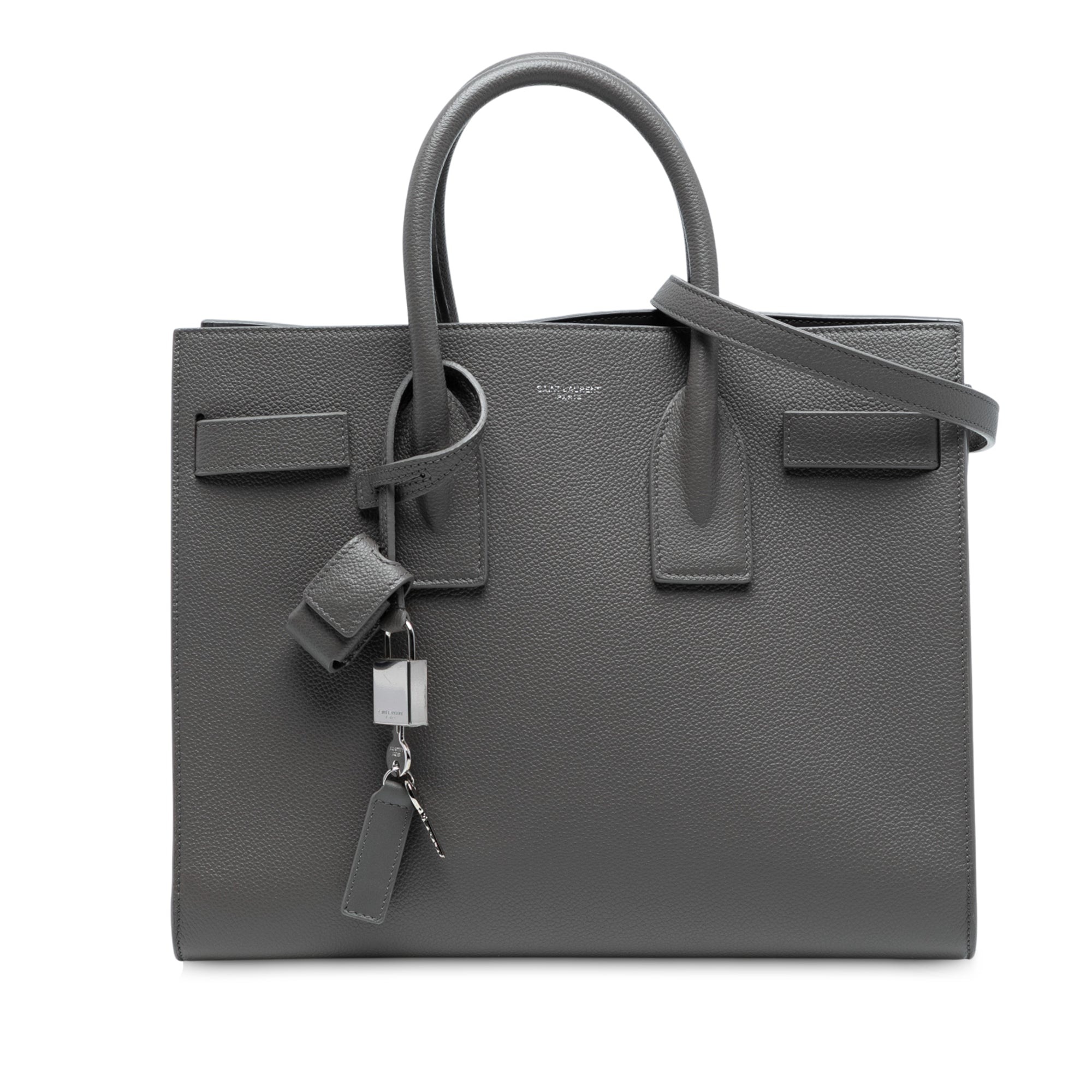 The Sac De Jour features a leather body, a clochette, rolled leather top handles, a detachable flat leather strap, an open top, and interior zip and slip pockets. Retail Price: 1670.00