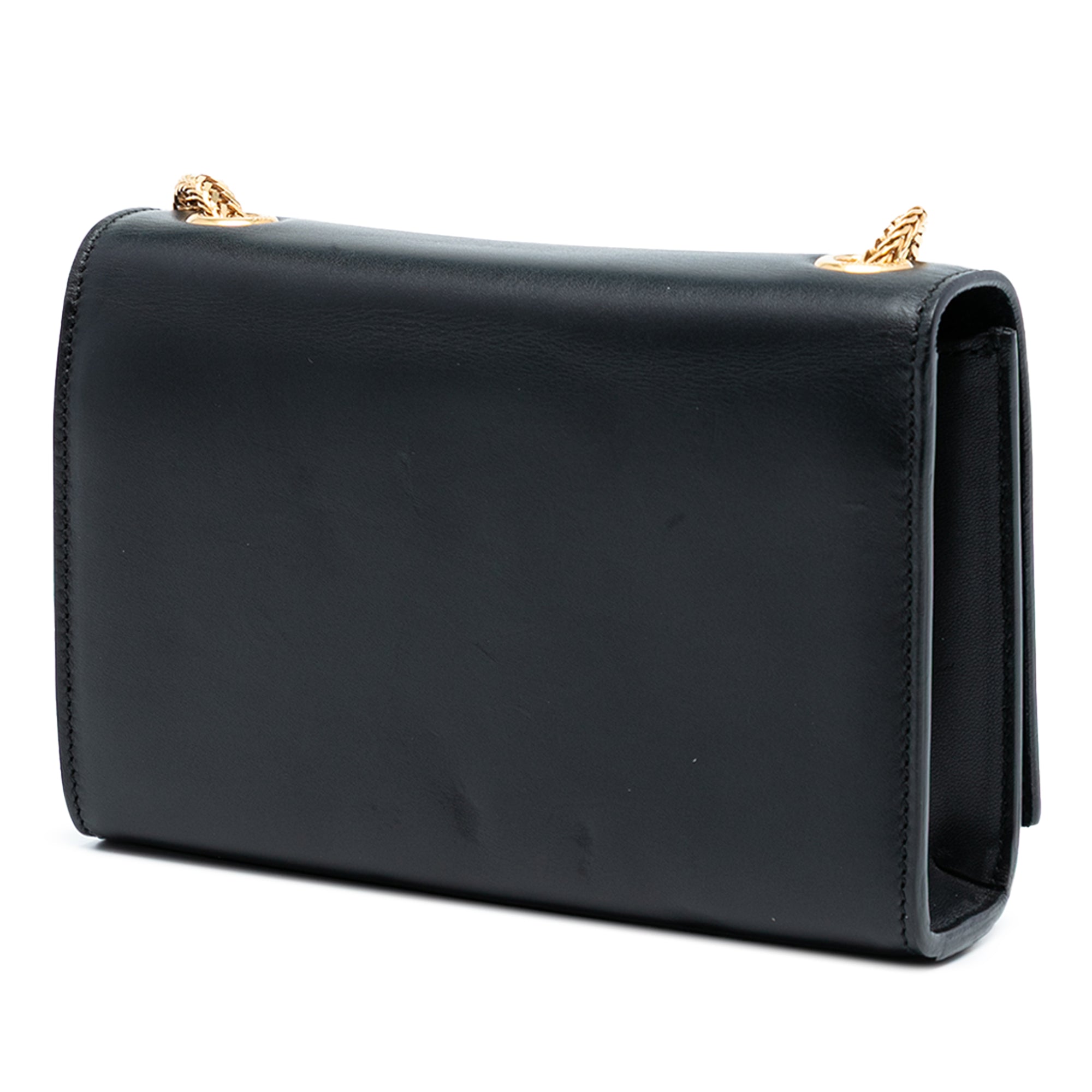The Kate features a leather body with a metal tassel detail, a gold-tone chain-link shoulder strap, a front flap with magnetic snap closure, and an interior slip pocket. Inclusion: Dust bag. Retail Price: 2190.00