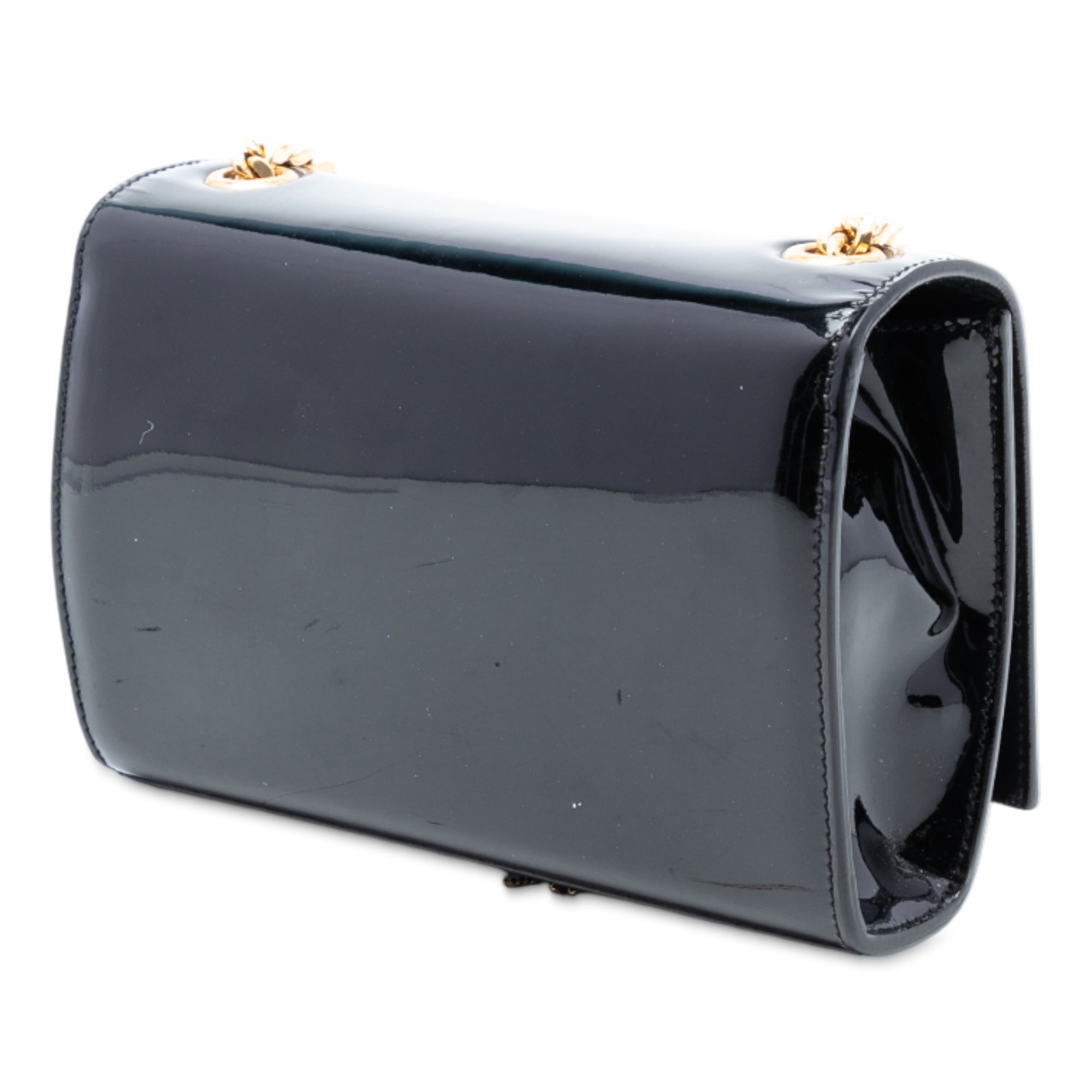 The Kate features a patent leather body with a tassel, a gold-tone chain-link shoulder strap, a front flap with magnetic snap closure, and an interior slip pocket. Retail Price: 2200.00
