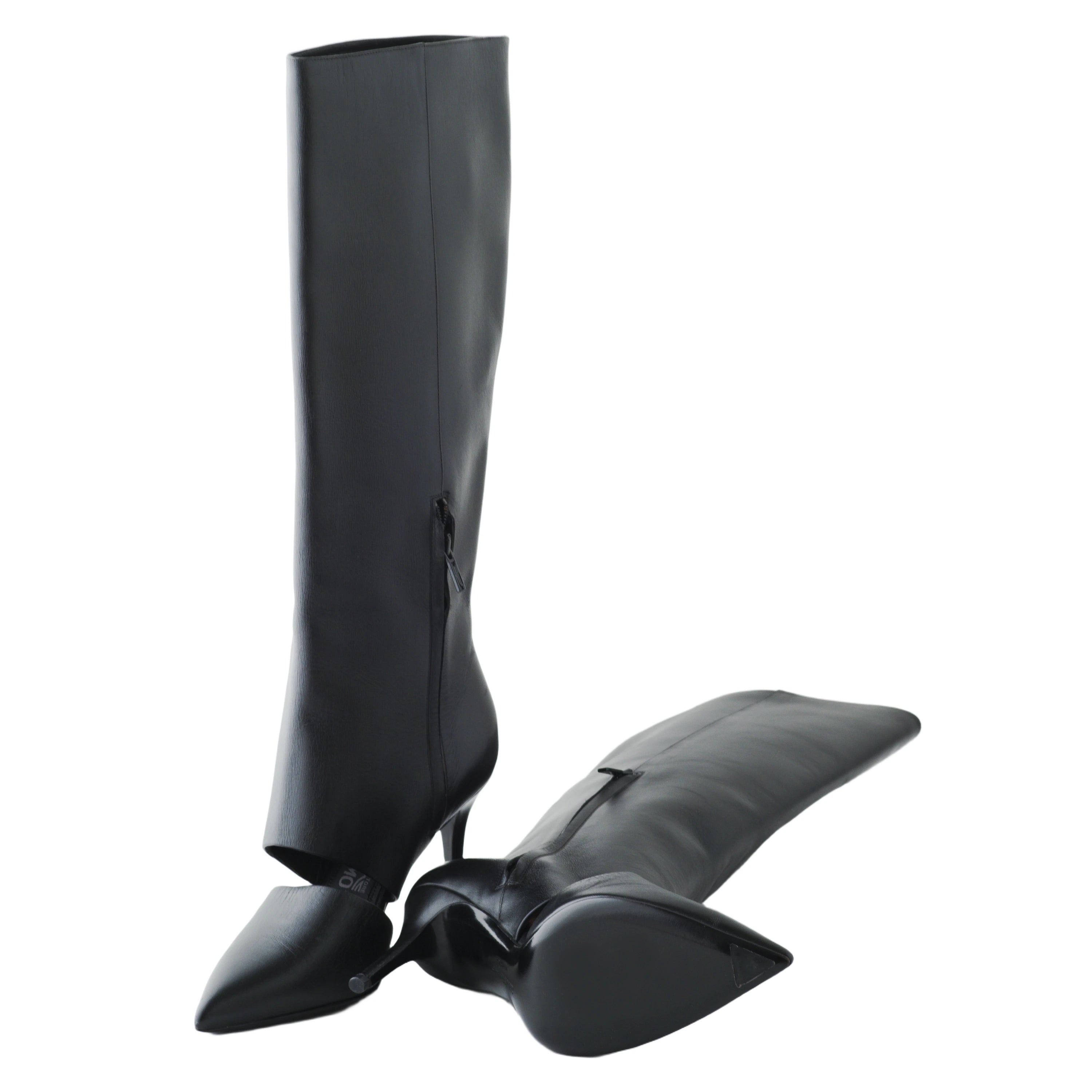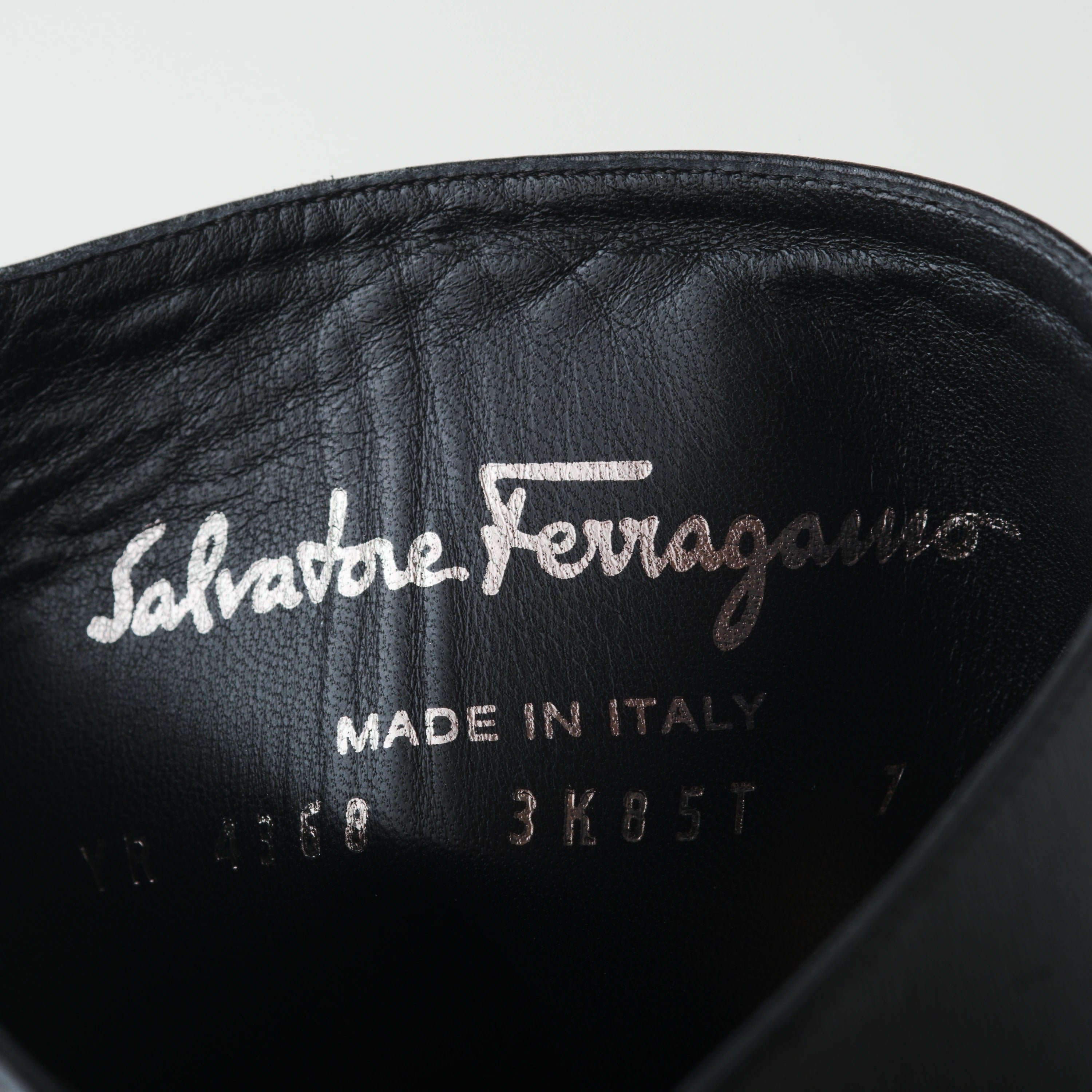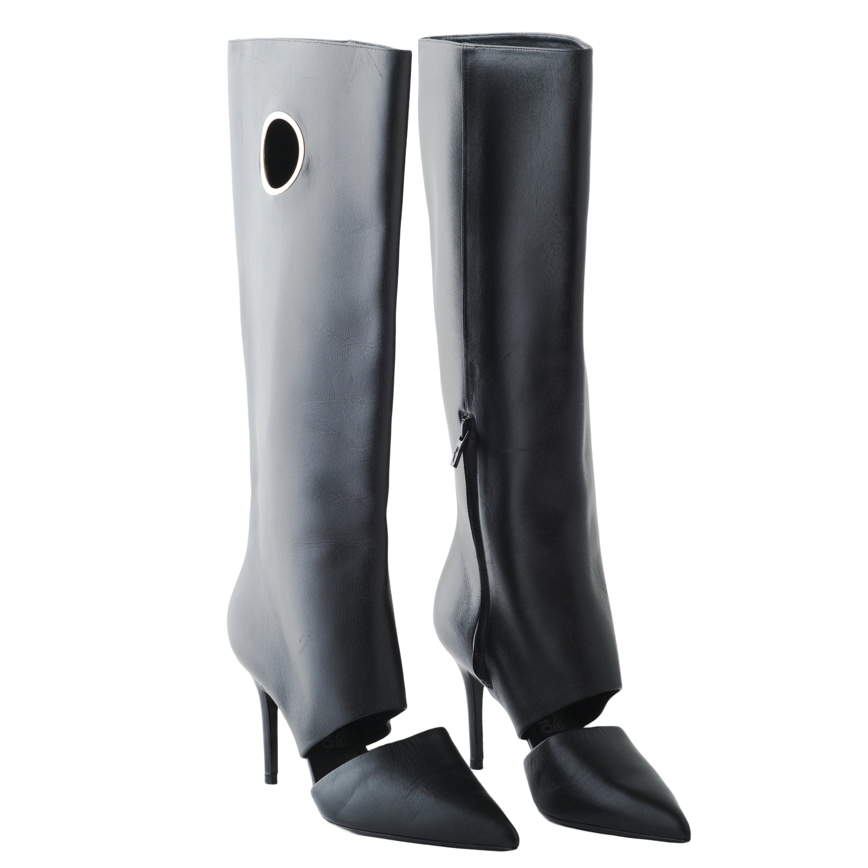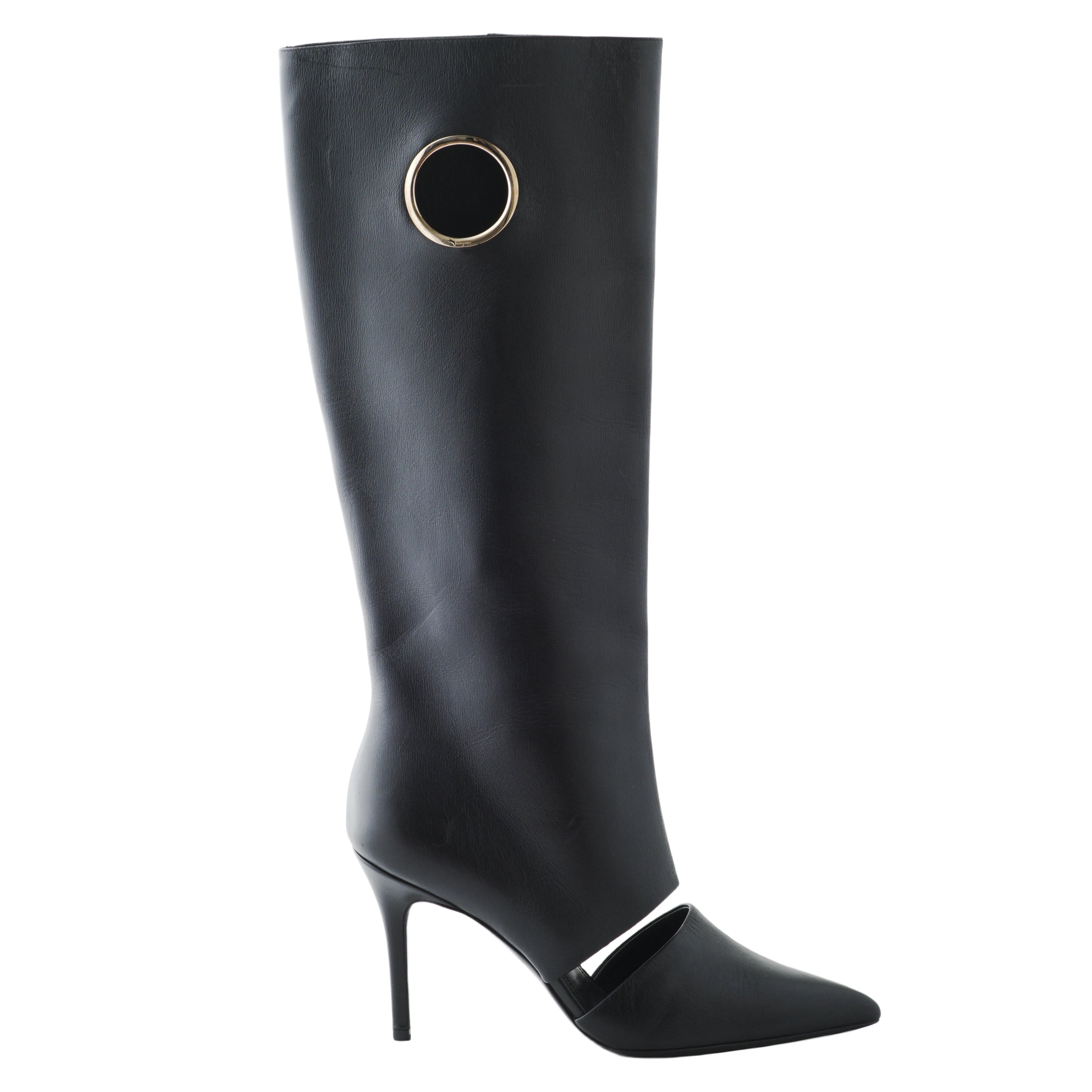These black knee-high boots by Salvatore Ferragamo are crafted from premium leather and showcase the excellence of Italian craftsmanship. The design features refined cut-out details and elegant decorative eyelets, adding personality and a contemporary touch to the boot’s sleek silhouette.