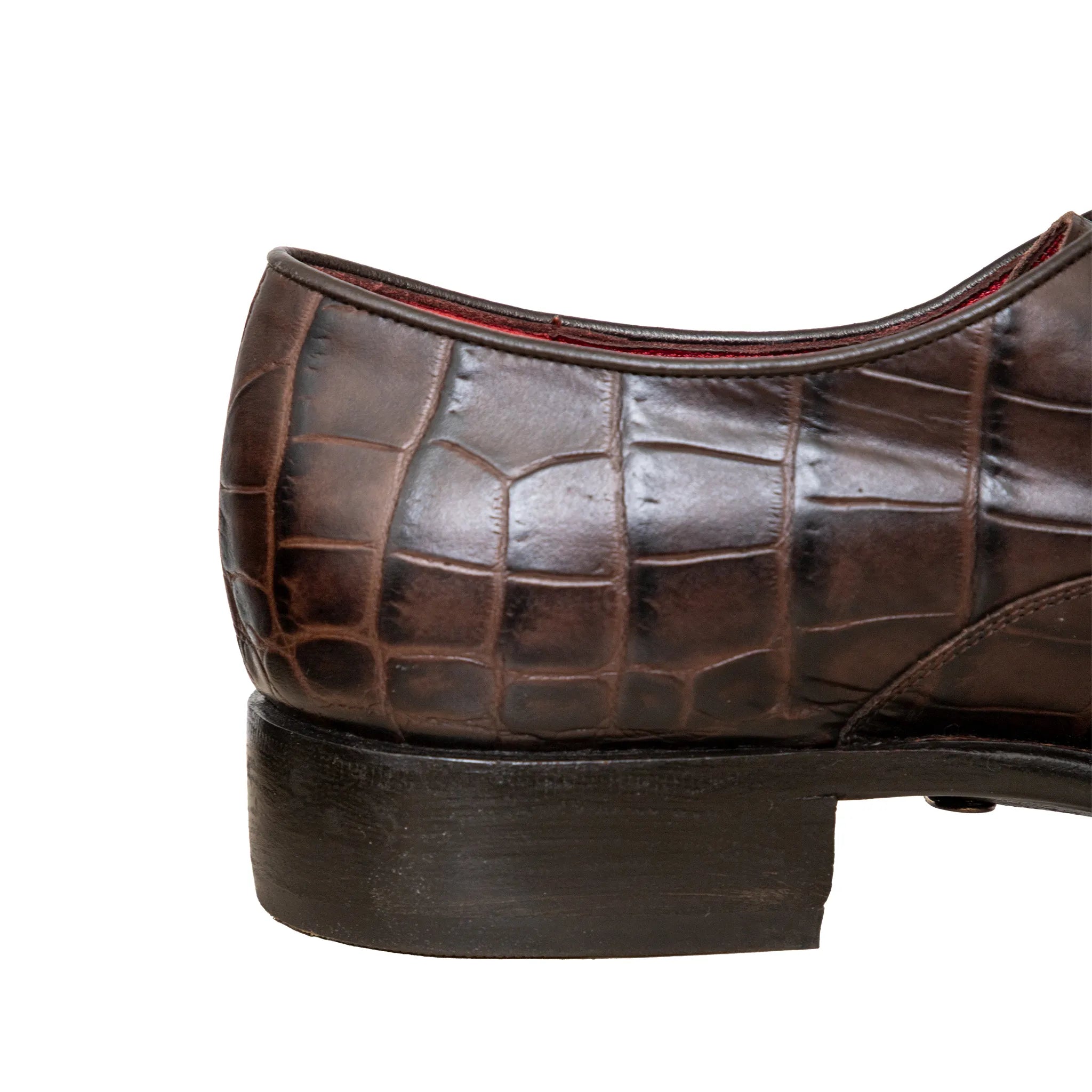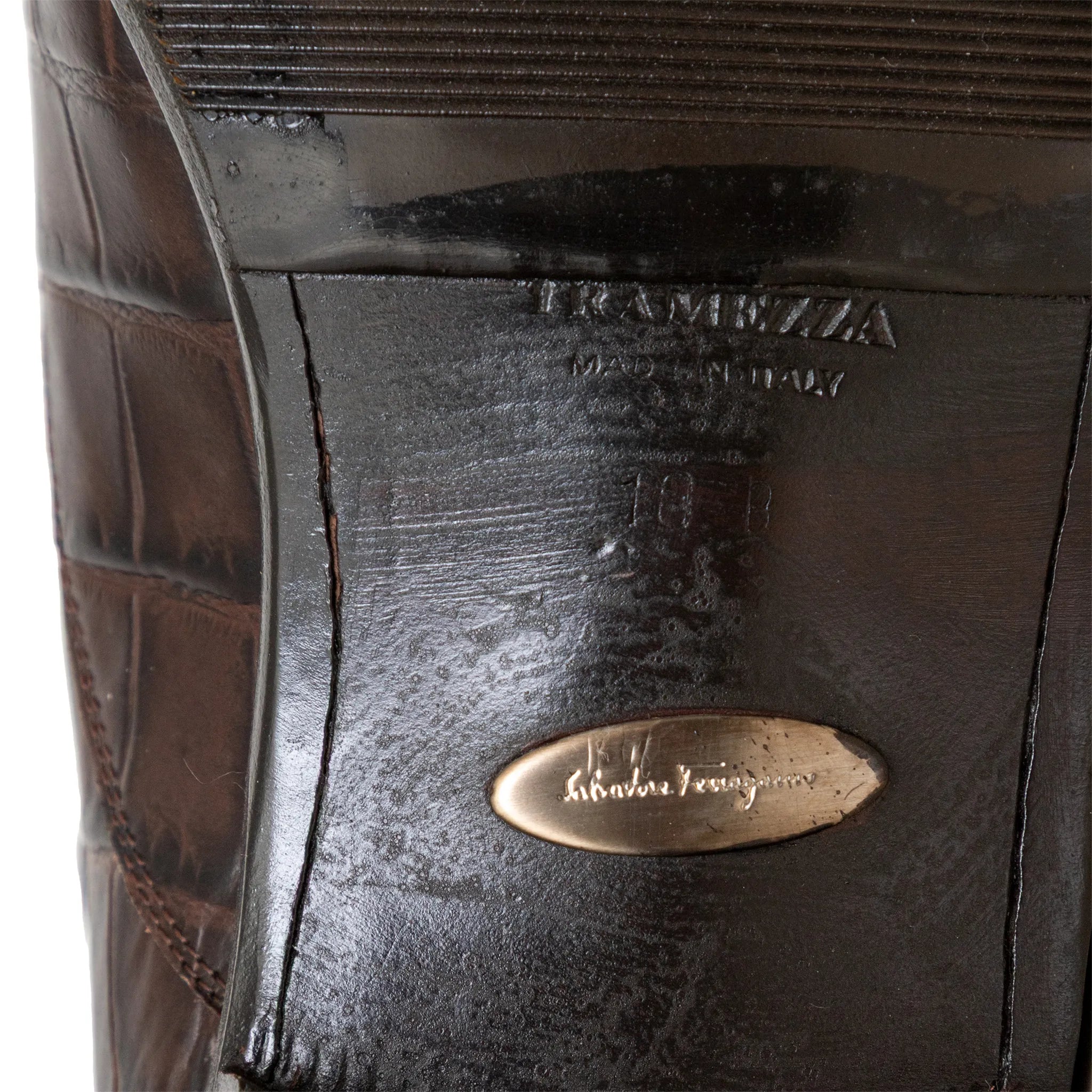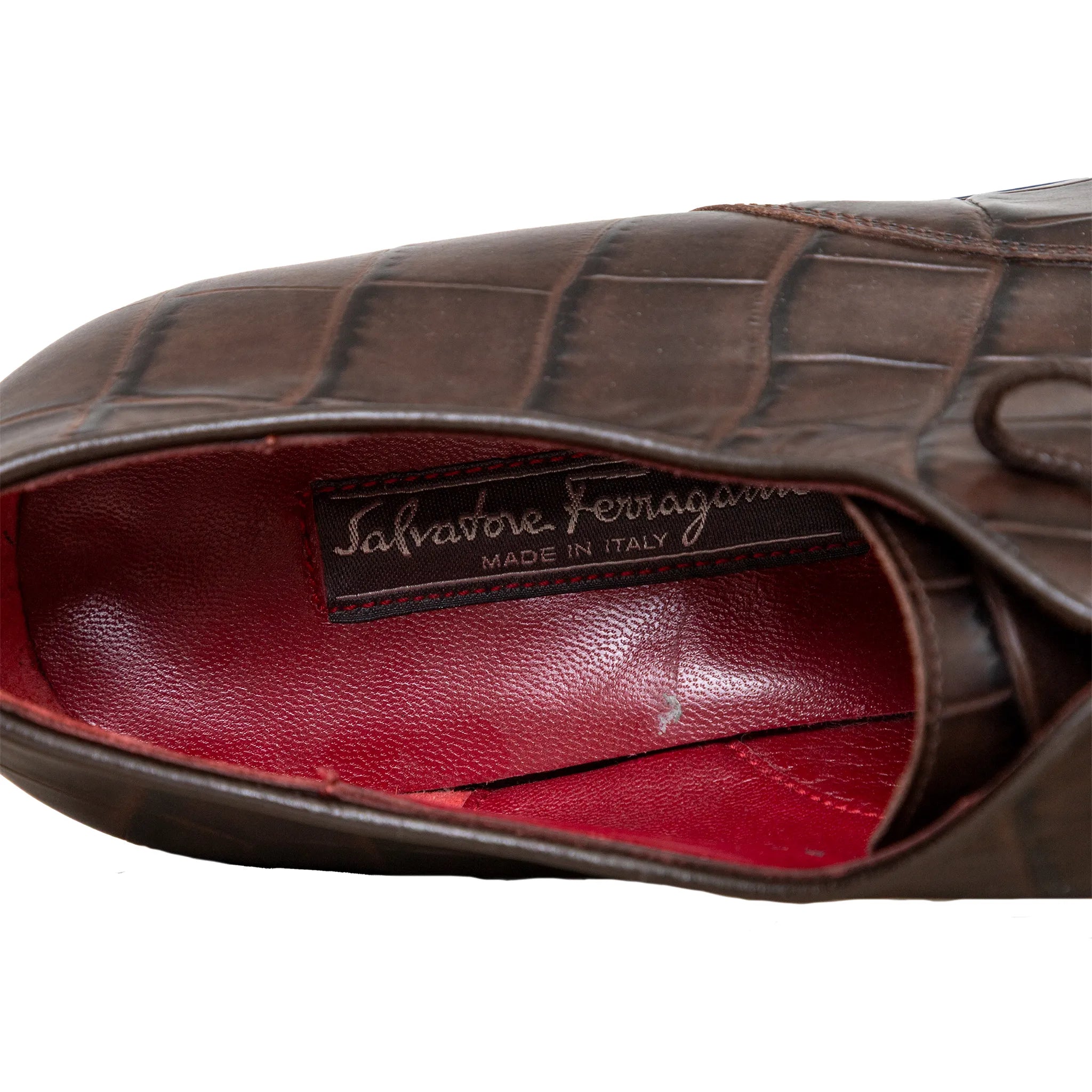 Salvatore Ferragamo Oxford shoes in brown embossed leather. Slim fit with a straight, narrow tip. Classic design with a modern, polished edge.