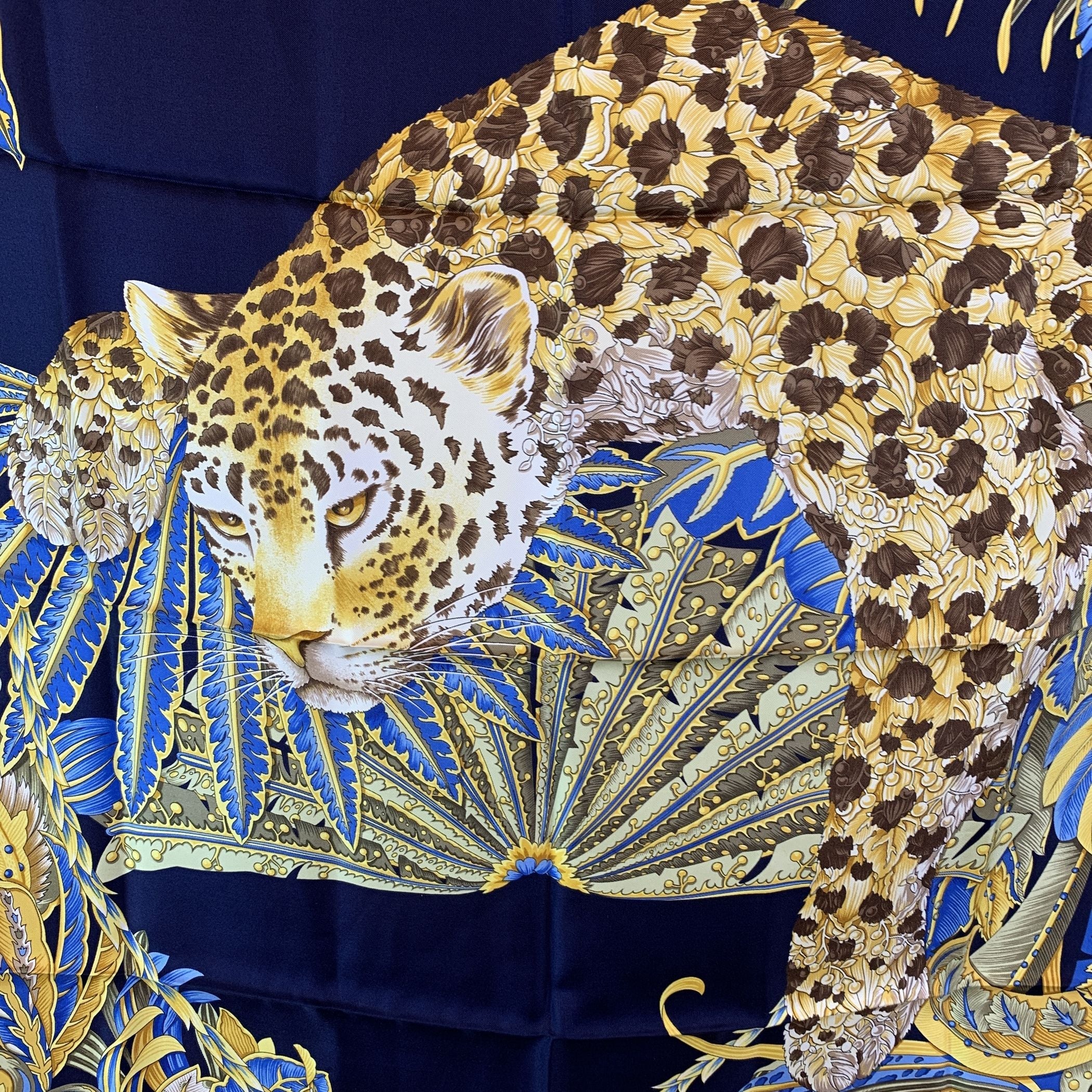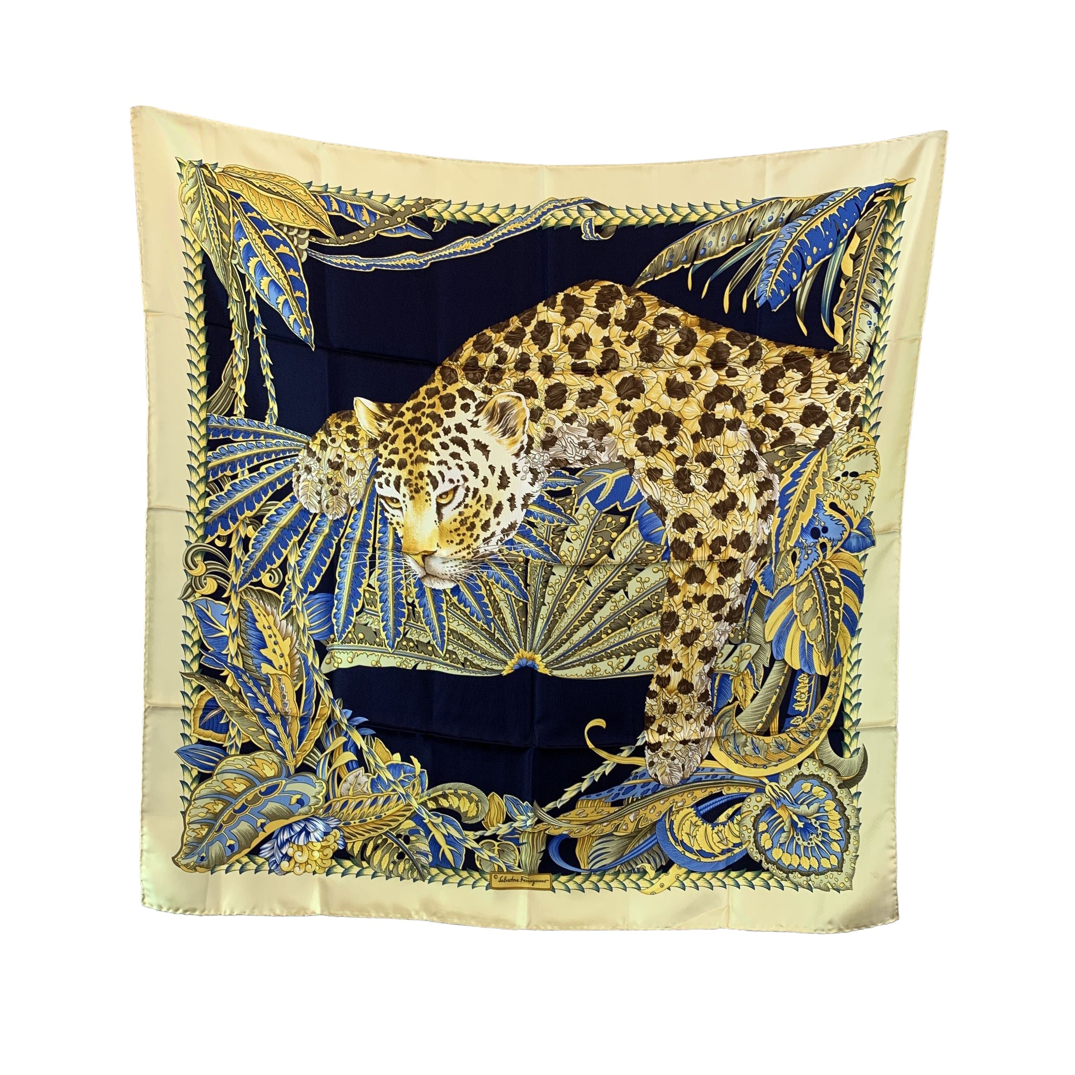 Vintage Salvatore Ferragamo Silk Scarf Featuring An Elegant Central Jaguar Motif Surrounded By Tropical Foliage Detailing. Main Colors Are Beige, Yellow, Navy Blue , Brown And Light Blue. Ferragamo Scarves Are Crafted From High-quality Silk And Are Celebrated As Luxury Made In Italy Accessories. The Brand's Prints Often Draw Inspiration From Wildlife, Particularly Big Cats, Birds, And Botanical Elements, Transforming Anatomically Precise Illustrations Into Refined Works Of Art. Versatile And Timeless, These Scarves Can Be Worn Around The Neck, In The Hair, As a Belt, Or To Adorn a Handbag. Production Of Ferragamo Scarves Began In The 1970s, Thanks To The Creative Vision Of Fulvia Ferragamo, Who Turned Them Into One Of The Maison's Most Iconic Symbols Of Elegance.