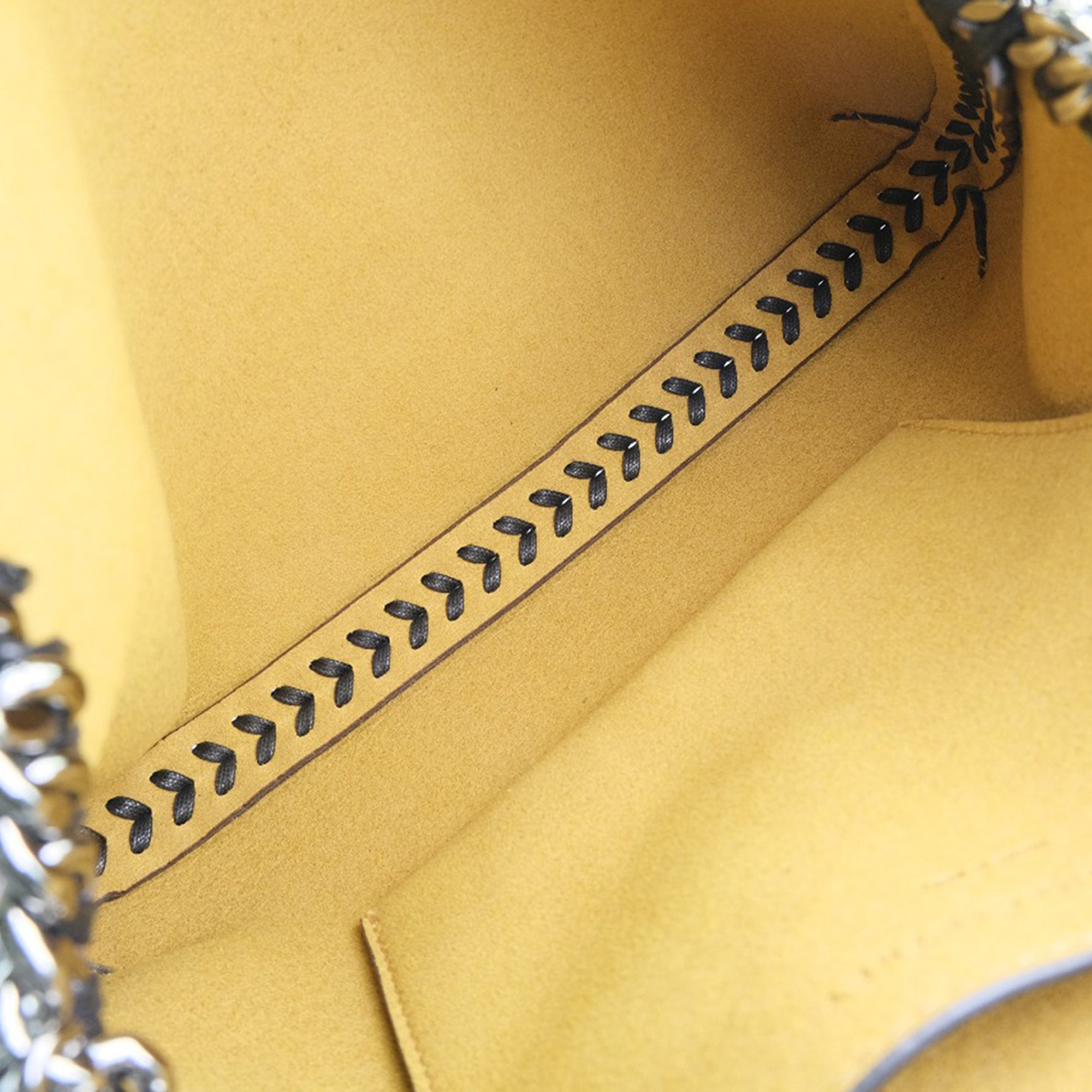 The Falabella satchel features a faux leather body, silver-tone chain handles and strap, an open top with magnetic snap closure, and an interior zip pocket. Retail Price: 720.00