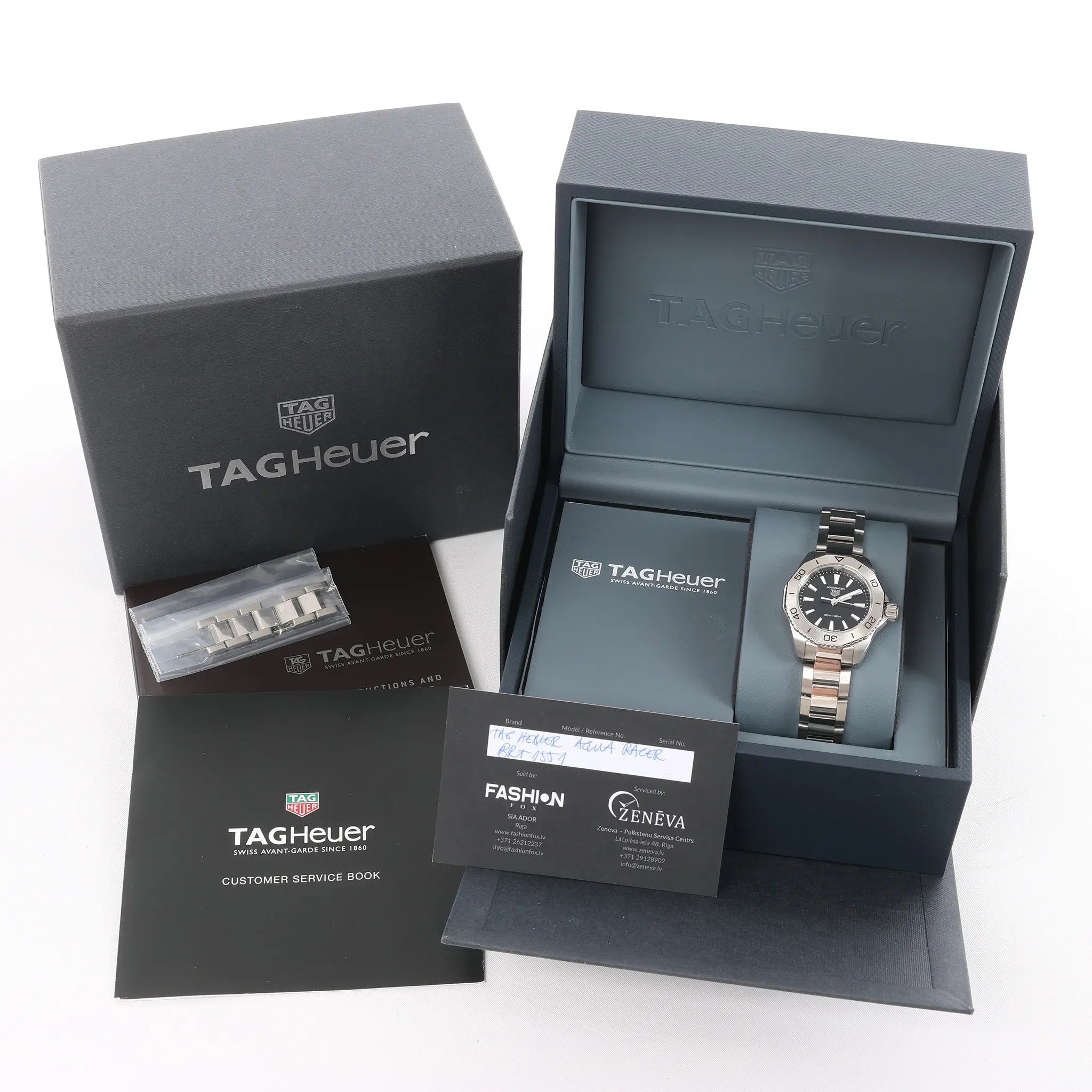 Brand: TAG HeuerModel: AquaracerReference: WBP1410Serial No.: BRT1551Condition: ExcellentCondition Details: Excellent overall condition with almost no visible signs of use. Barely noticeable hairline marks may be present, but they are not visible to the naked eye. Please see photos for details. Dial Colour: BlackDial Material: SteelStarp Colour: SilverStrap material: SteelMovement: QuartzClosure: Fold claspDial Diameter: 30 mmApprox. max circumference: 20 cmComes With: Box, Papers, Extra links, Service card