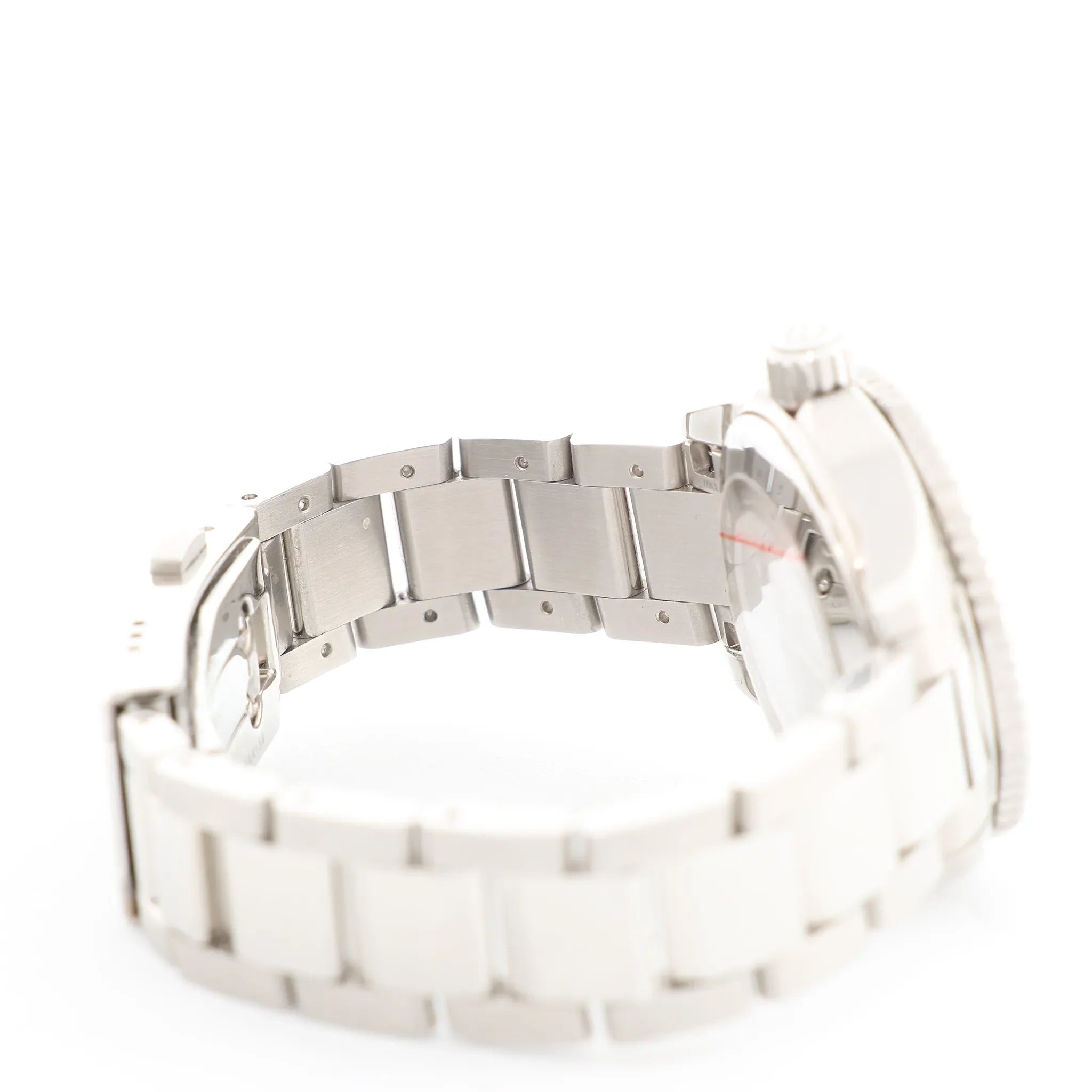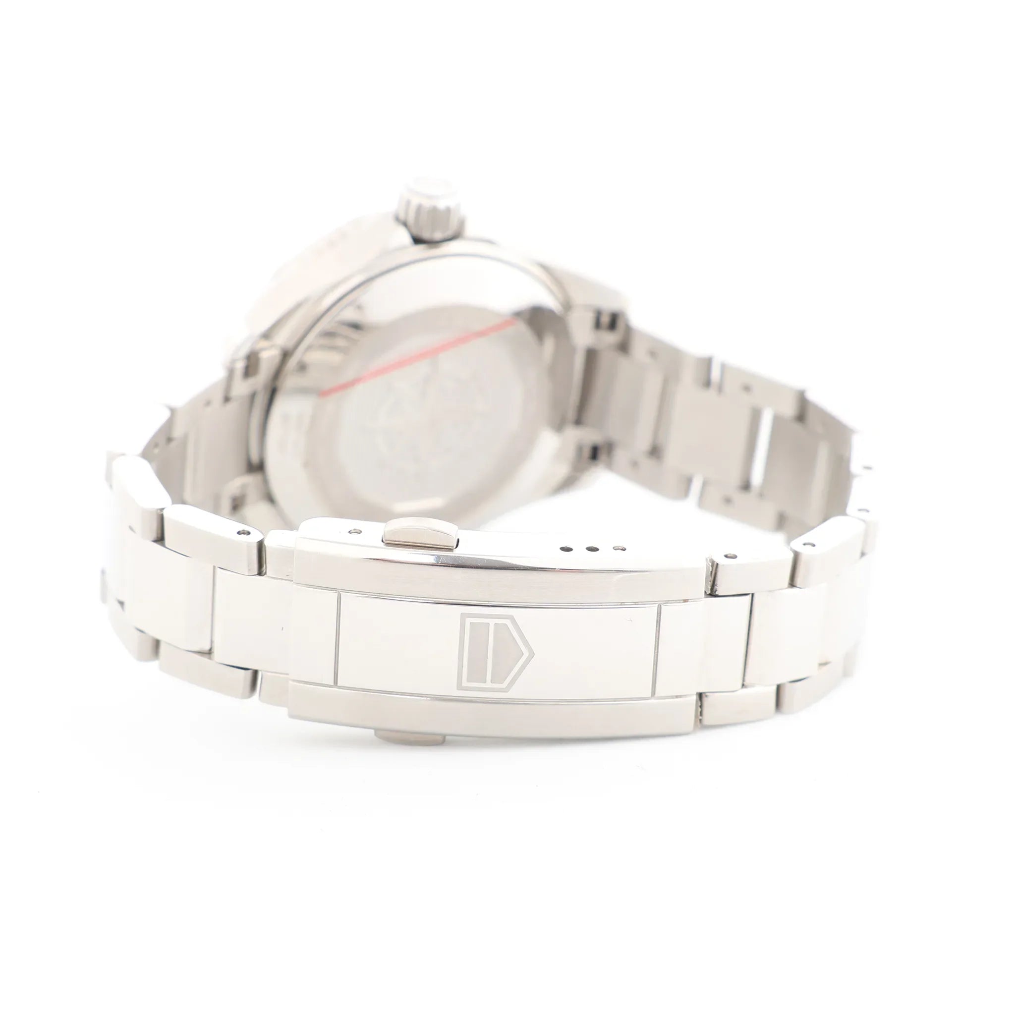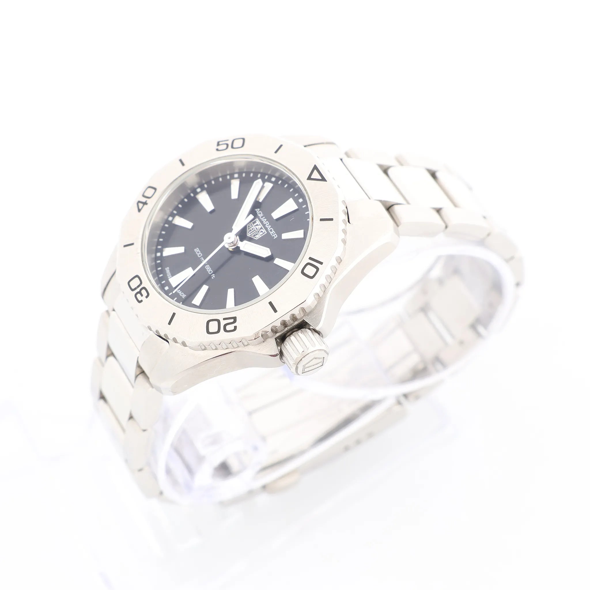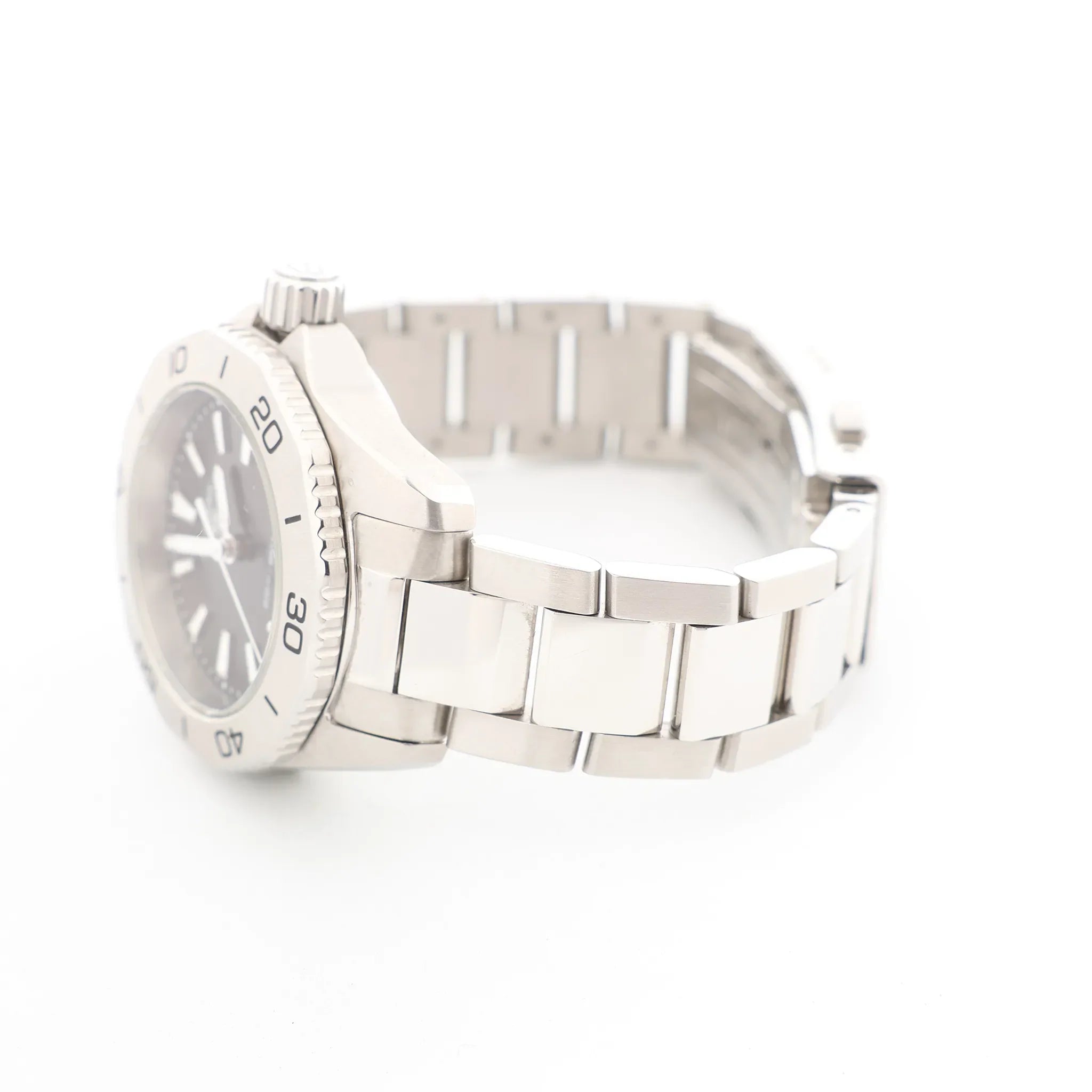 A sleek, sport-ready TAG Heuer Aquaracer with a crisp black dial and bold stainless-steel finish. Designed with a rotating dive-style bezel and clean lume markers, it’s an everyday essential that reads sharp from desk to weekend.