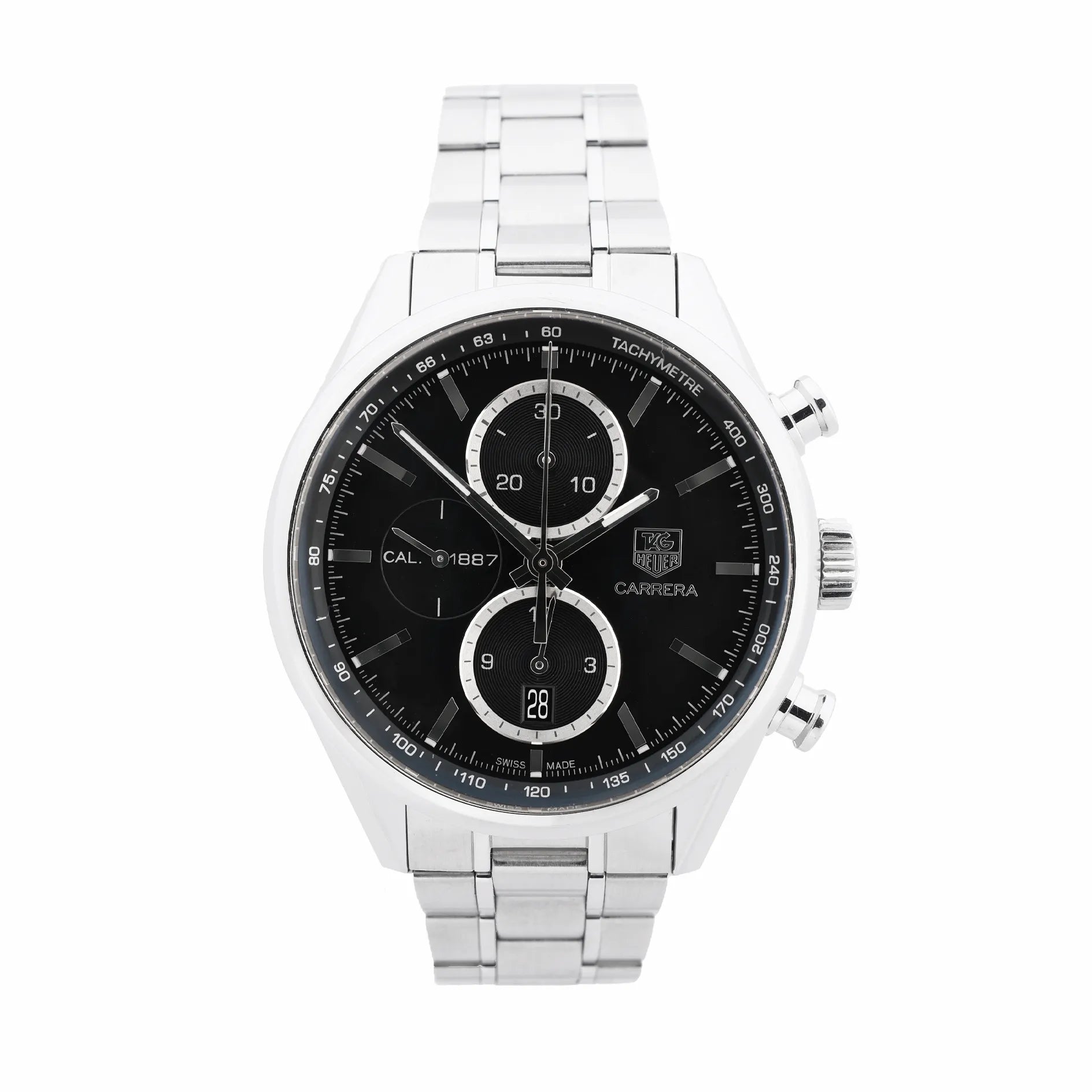 A motorsport icon with a modern, high-contrast edge. This TAG Heuer Carrera Calibre 1887 chronograph pairs a sleek black dial with silver subdials, tachymeter scale, and a stainless-steel bracelet—precision, polish, and everyday wearability.